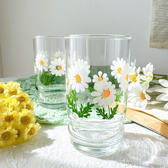 【まるで夏の草原で咲いているかのような、やさしいマーガレット柄】 すらりとしたフォルムに、やさしいタッチで描かれた白いマーガレット。 Giovanni Valentino(ジョヴァンニ・ヴァレンティノ)が手がけたこちらのグラスは、陽だまりに咲く野の花のように、ナチュラルな愛らしさが魅力です。 クリアなガラスに映えるグリーンとホワイトの配色は、見ているだけで心がすっと澄んでいくよう。 アイスティーやハーブウォーターなど、夏の飲みものを注いで、涼やかな時間をお楽しみください。 朝食やブランチのテーブルにもよく似合う、癒しのグラスです。 直径:5.7cm 高さ:11.2cm 重さ:150g ******** ■注意事項 ・当shopの商品は全てvintage /used品となります。基本的には返品はお受けしておりません。 使用感や小傷、色褪せなどのダメージがある場合がございますが、それも時間を重ねたお品ならではの良さとしてご理解いただけますと幸いです。 ・複数点在庫がある場合、どれが届くかはおまかせです。 ・お客様のモニター環境などにより、写真と実物の色が異なるように見える場合がございます。 ・使用感、小さな擦れや傷、イメージと異なる、などによる返品・交換のご希望はお受けいたしかねますので、掲載写真をよくご覧いただき、ご理解の上ご注文下さいませ。 ご不明点などがございましたら、ご購入前にお問い合わせ下さい。 ・取り扱い商品はアルコール除菌・清掃済みです。 ■配送について ・環境保護の観点から、梱包にはリサイクル資材を使用させていただきます。