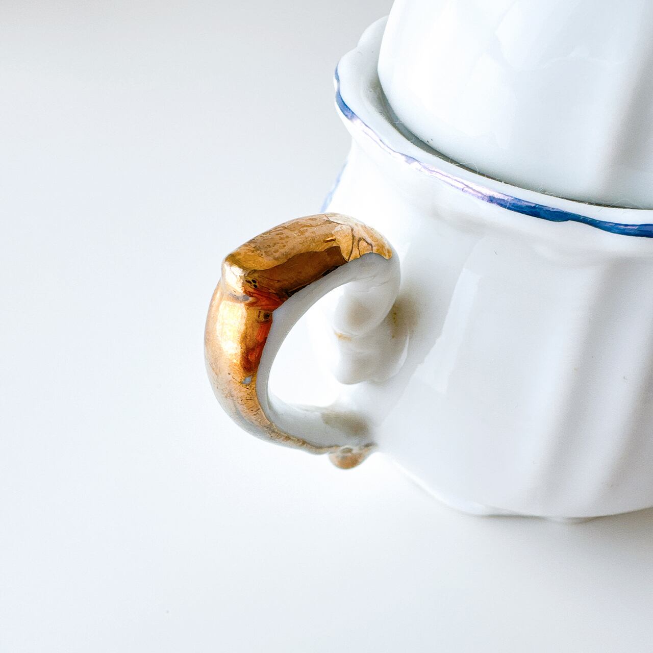 金彩のハンドルや蓋の装飾が、まるで王侯貴族のティータイムを思わせる優雅さを漂わせます。