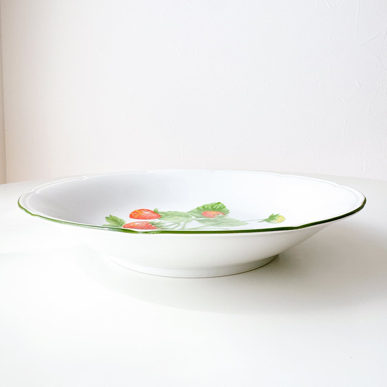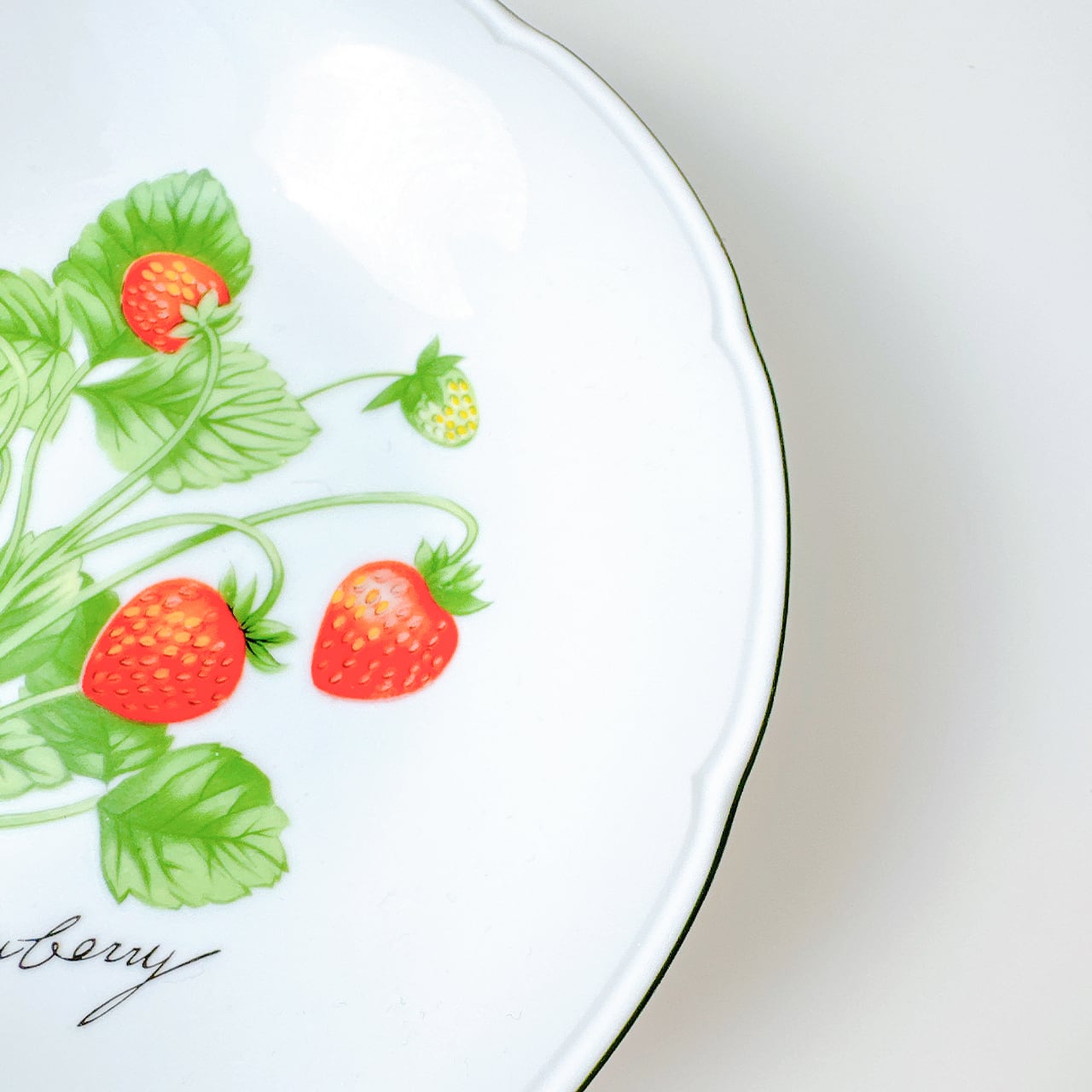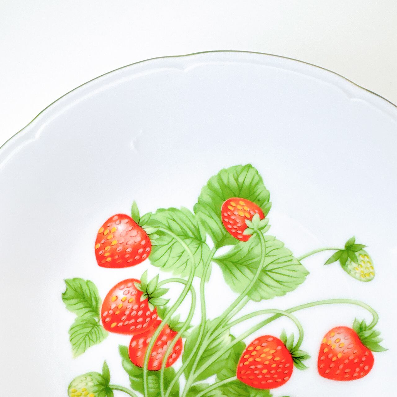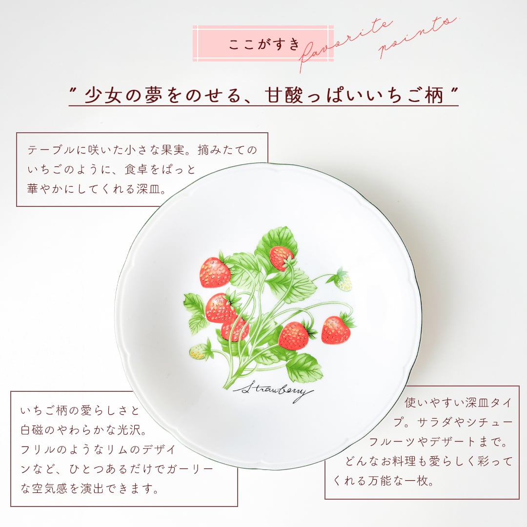 鮮やかな赤と瑞々しい緑で描かれたいちご柄が、絵本の挿絵のように愛らしい深皿です。