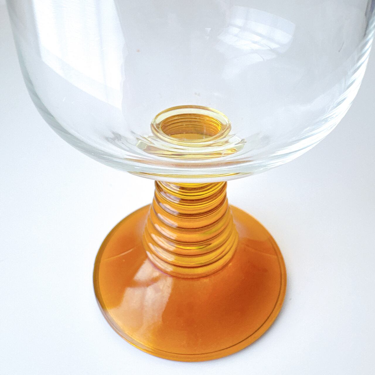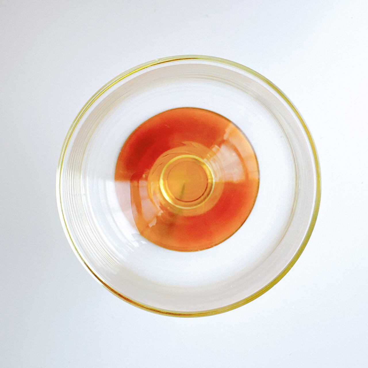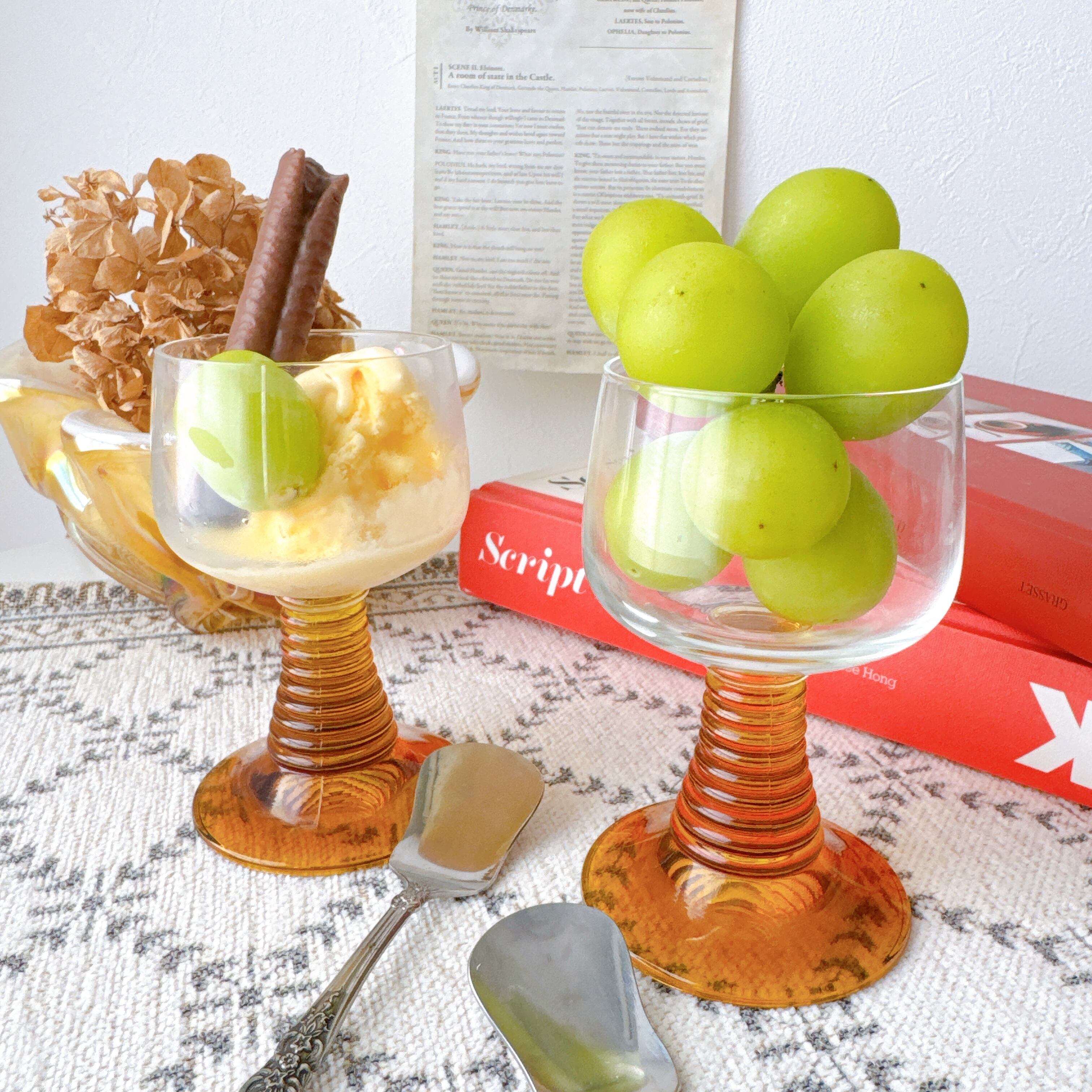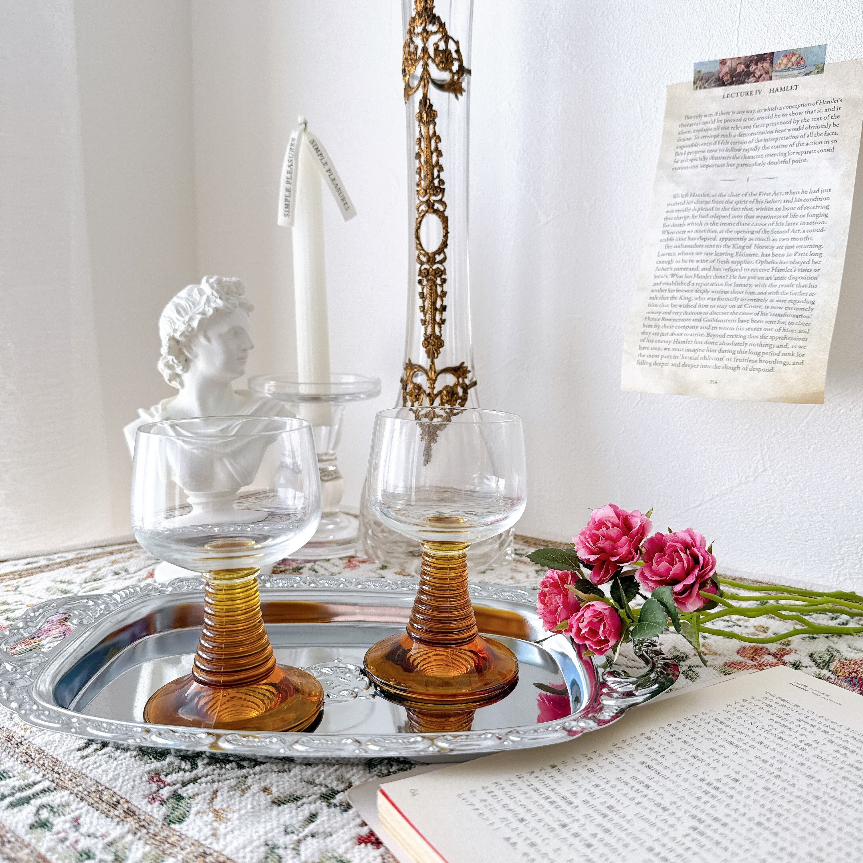 特徴的なのは、しっかりとした脚部に施された渦巻き模様。琥珀色のガラスに光が差すと、黄金のように輝き、食卓にクラシカルな趣を添えます。