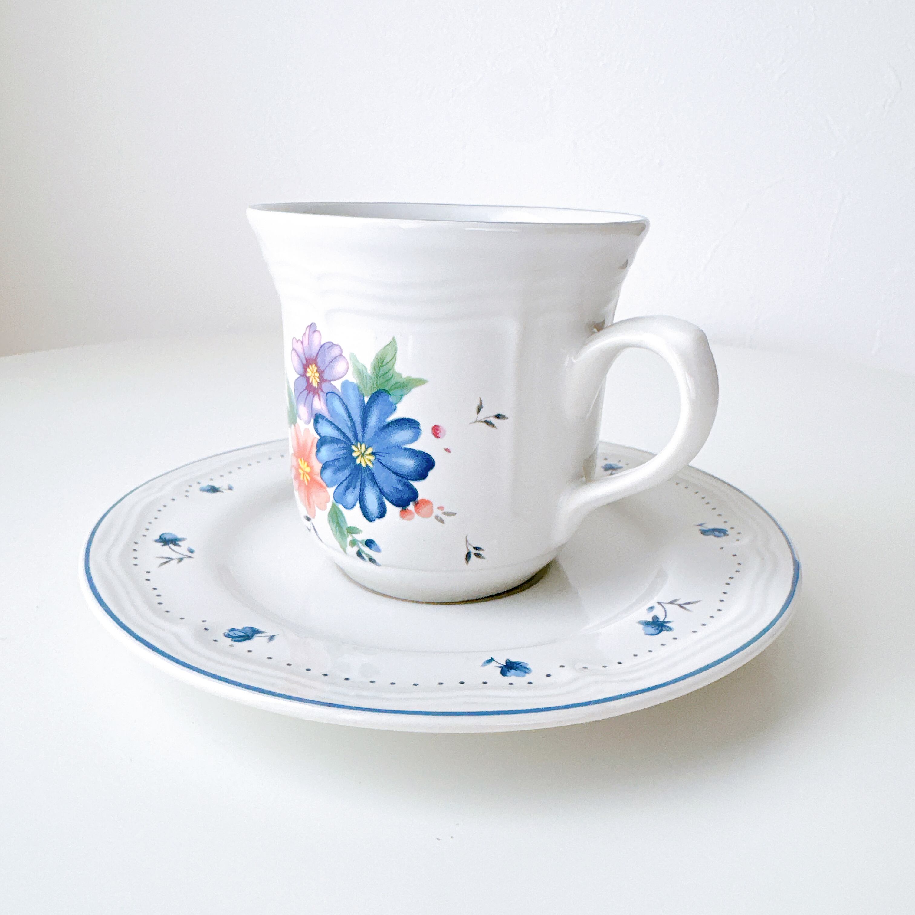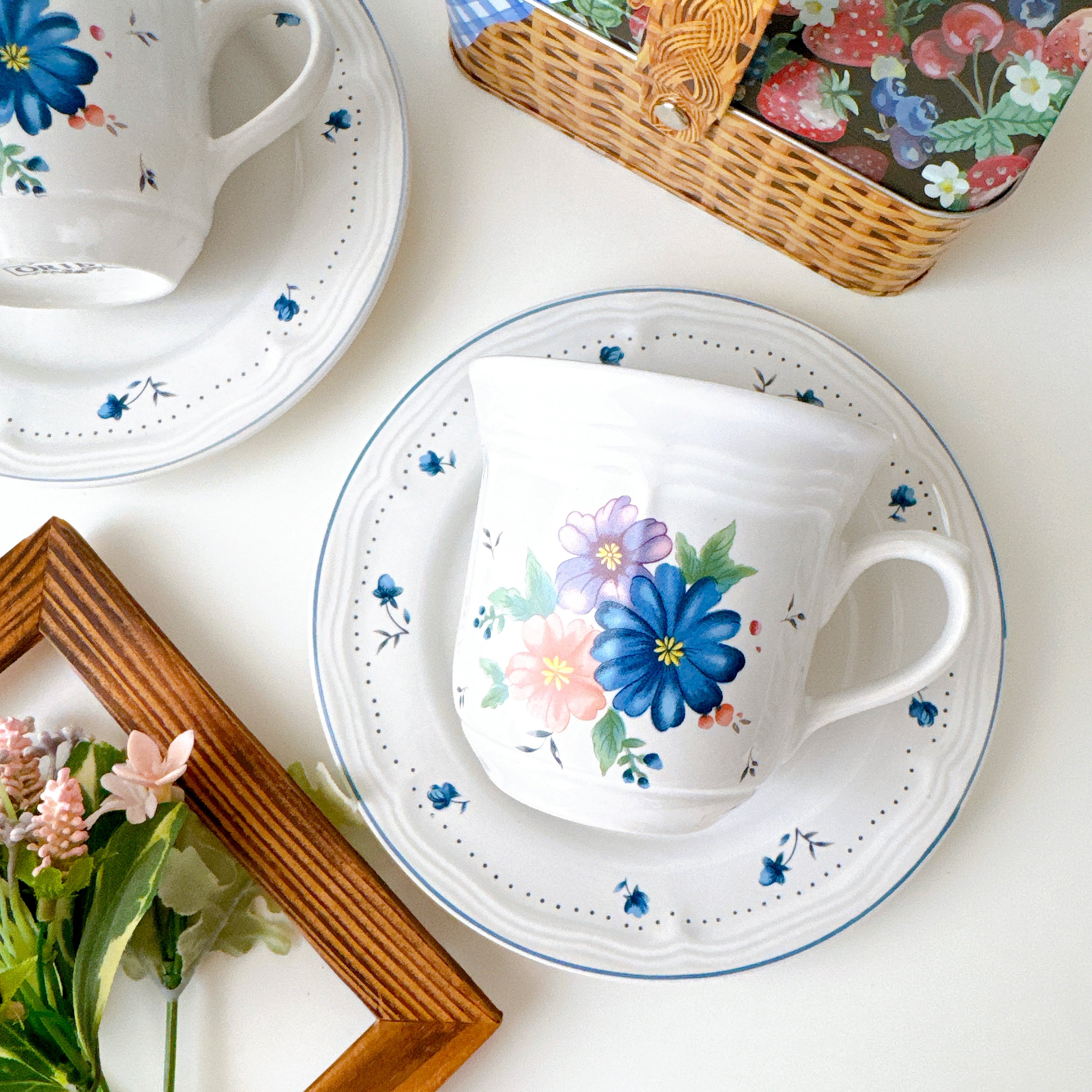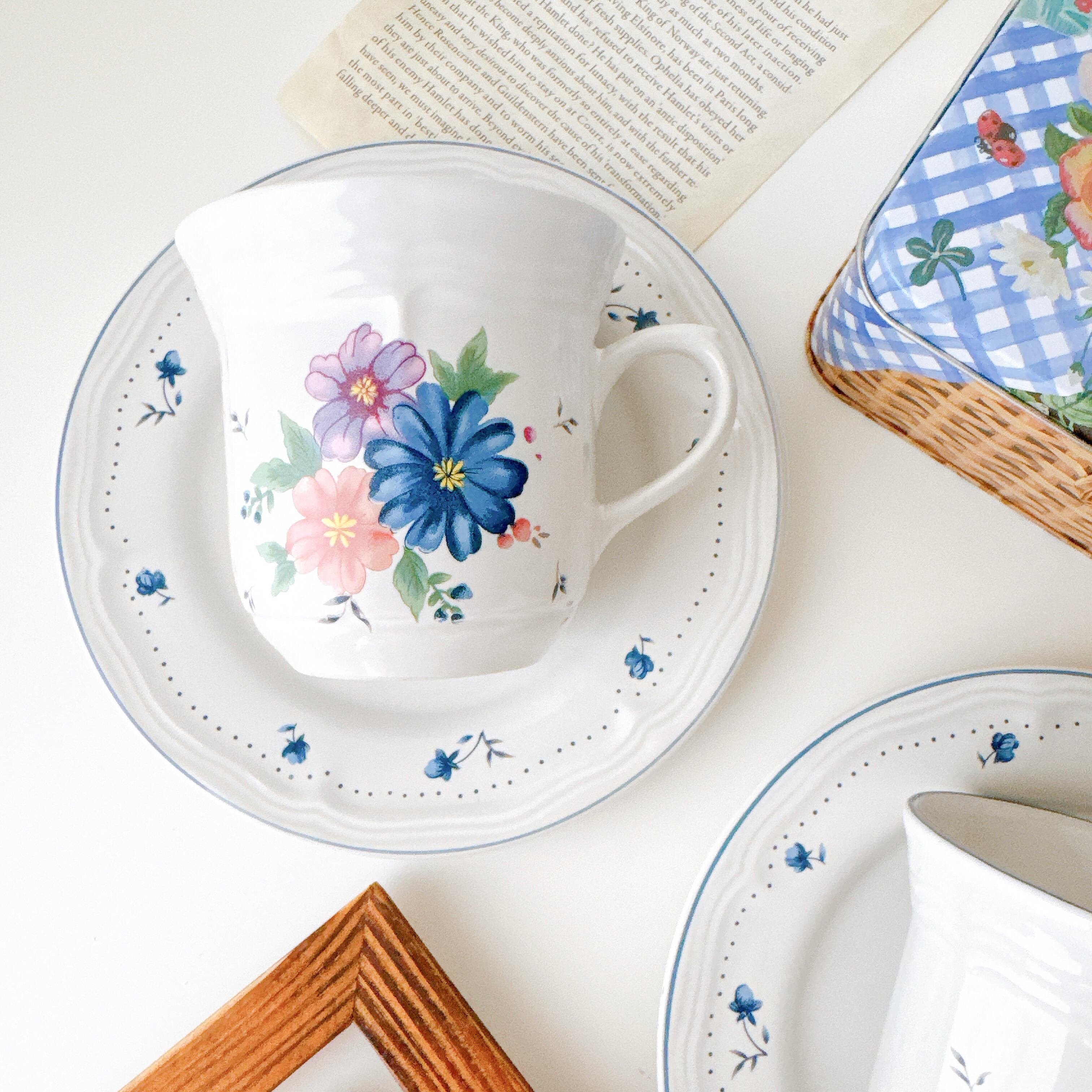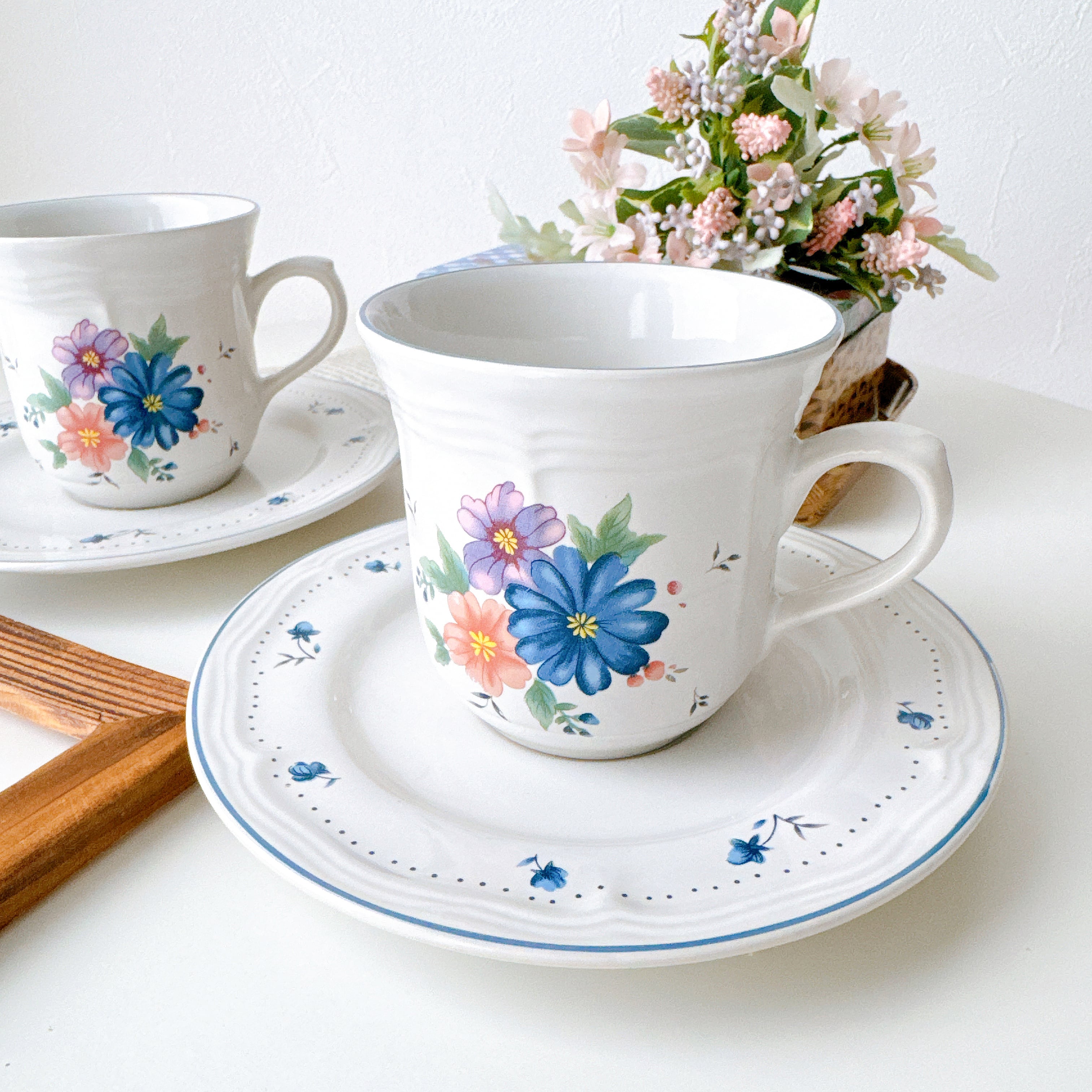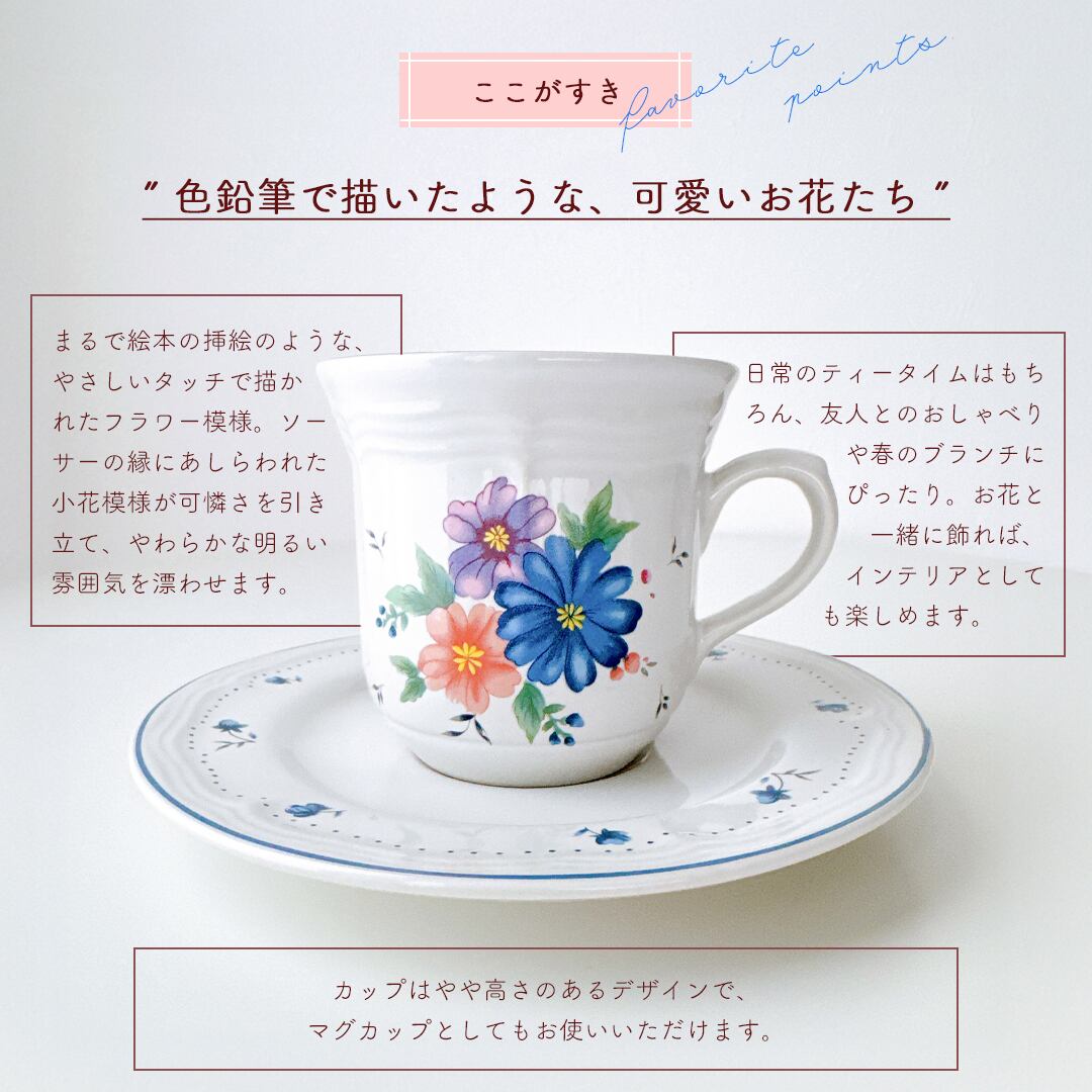 やわらかなブルーやピンクの花々は、まるで絵本の挿絵を切り取ったような可愛さを添えてくれます。縁にあしらわれた小花のドット模様が、優しく軽やかな雰囲気を引き立て、日常のティータイムを少し特別な時間へと変えてくれます。