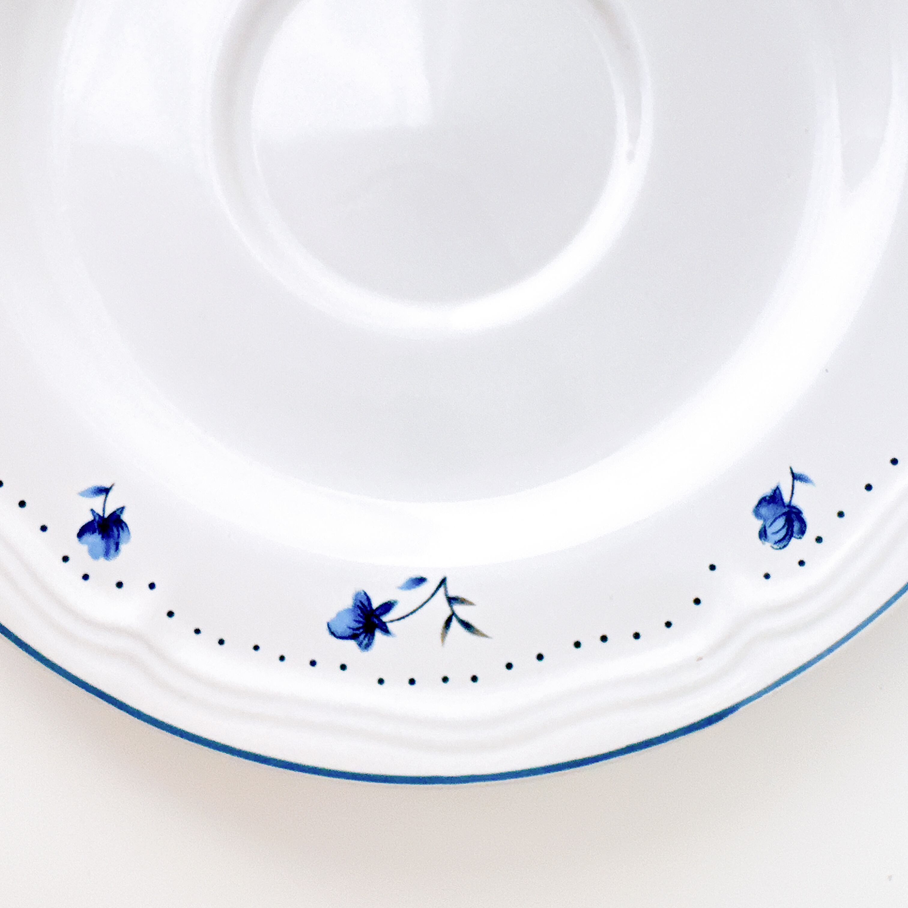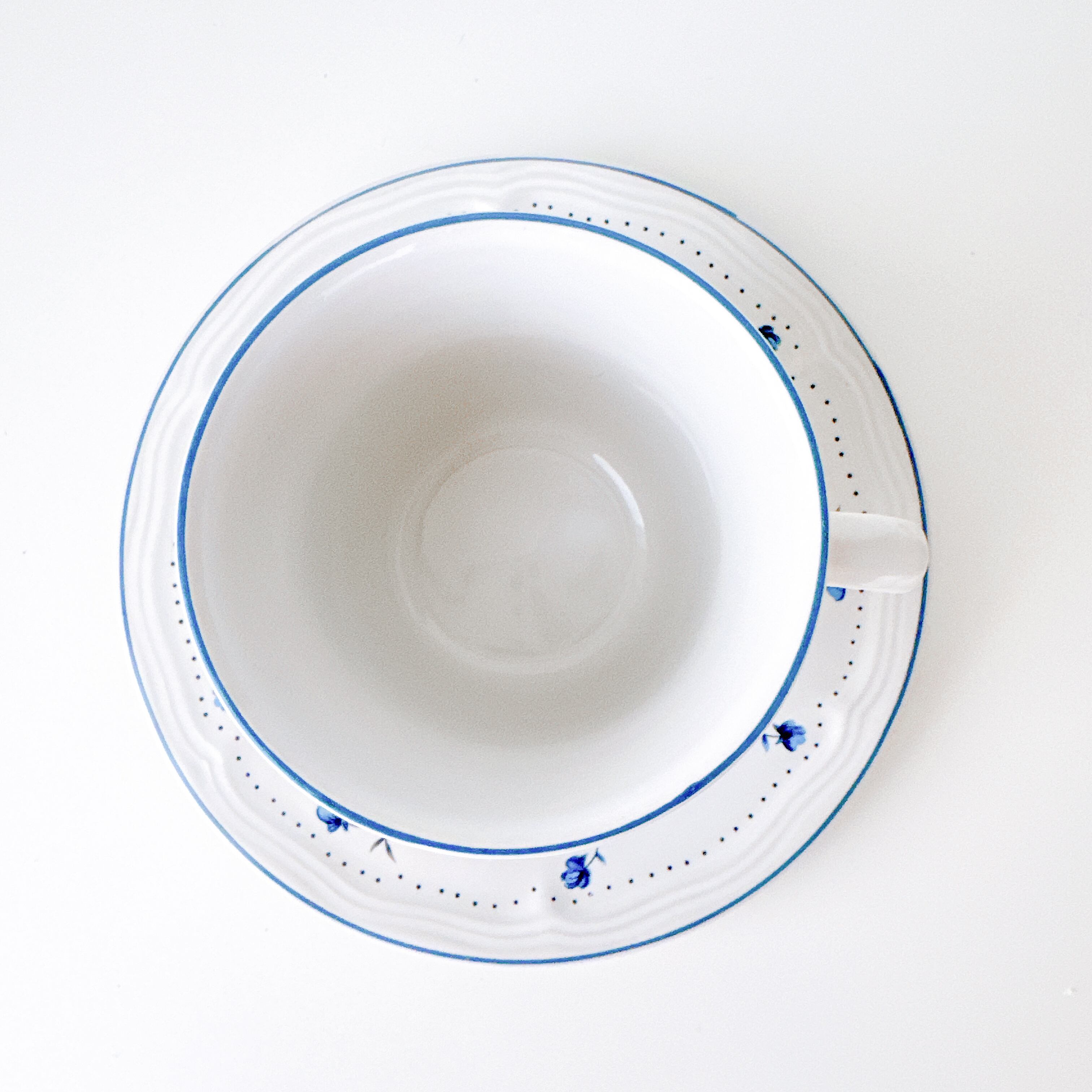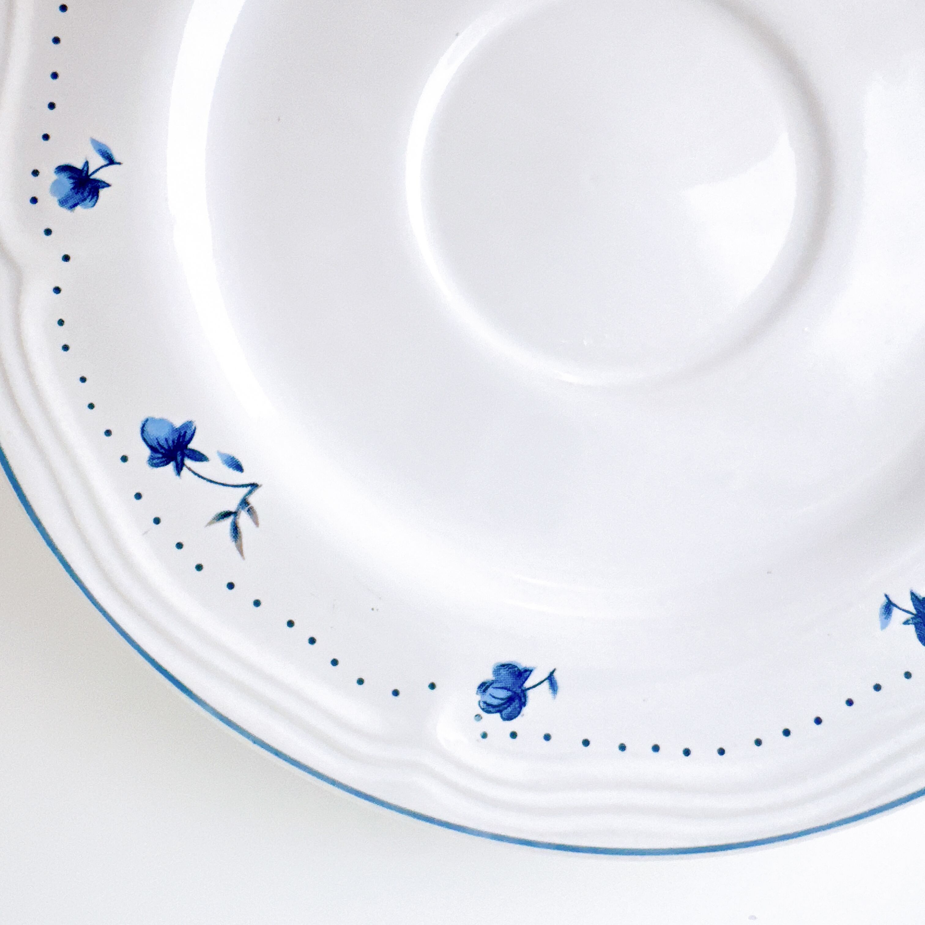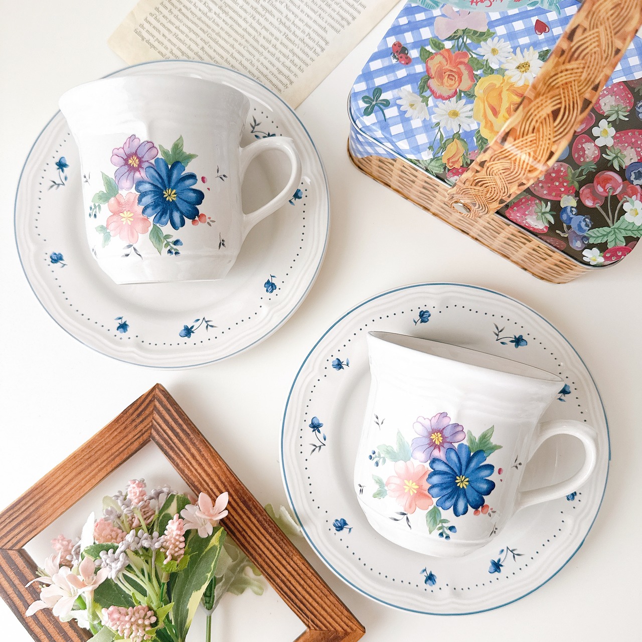 やわらかなブルーやピンクの花々は、まるで絵本の挿絵を切り取ったような可愛さを添えてくれます。縁にあしらわれた小花のドット模様が、優しく軽やかな雰囲気を引き立て、日常のティータイムを少し特別な時間へと変えてくれます。