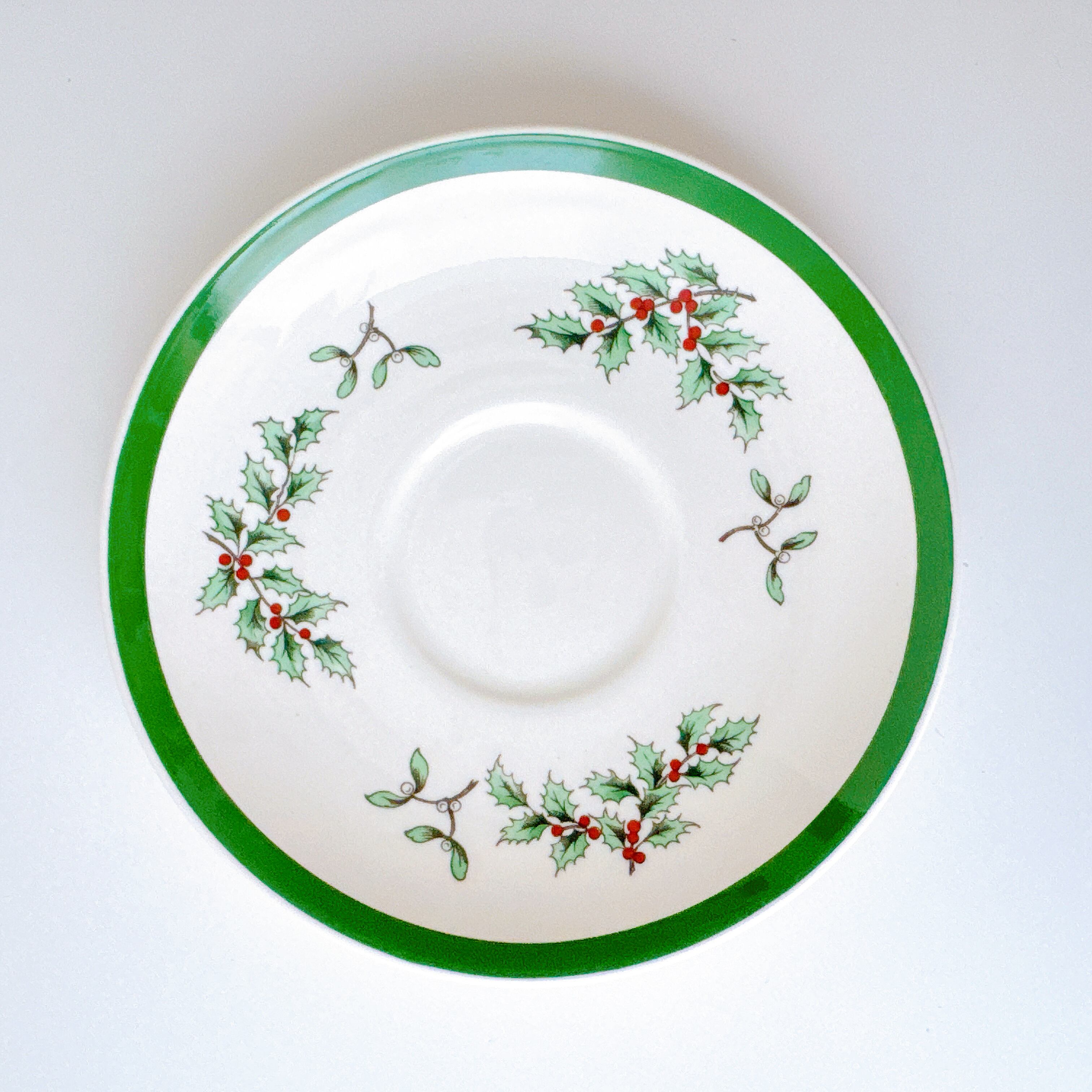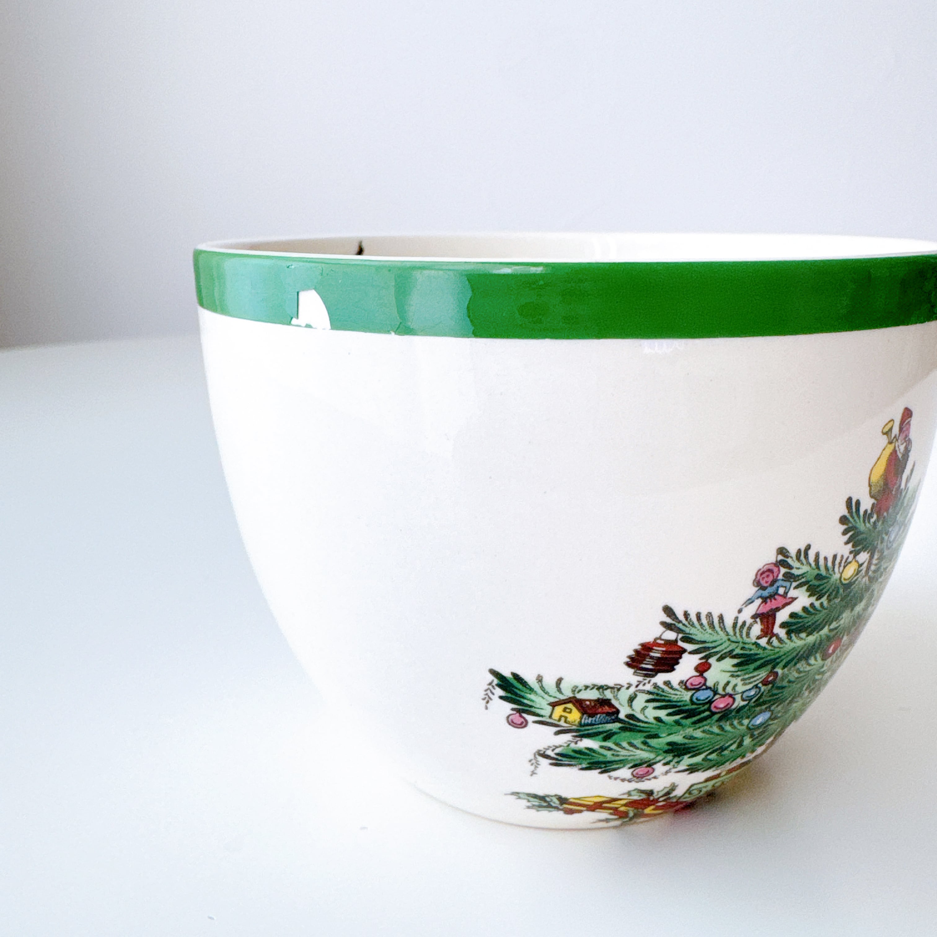 グリーンの縁取りと、ぽってりとした陶器の温かみ。そして、ツリーの上にちょこんと立つサンタクロースの姿──