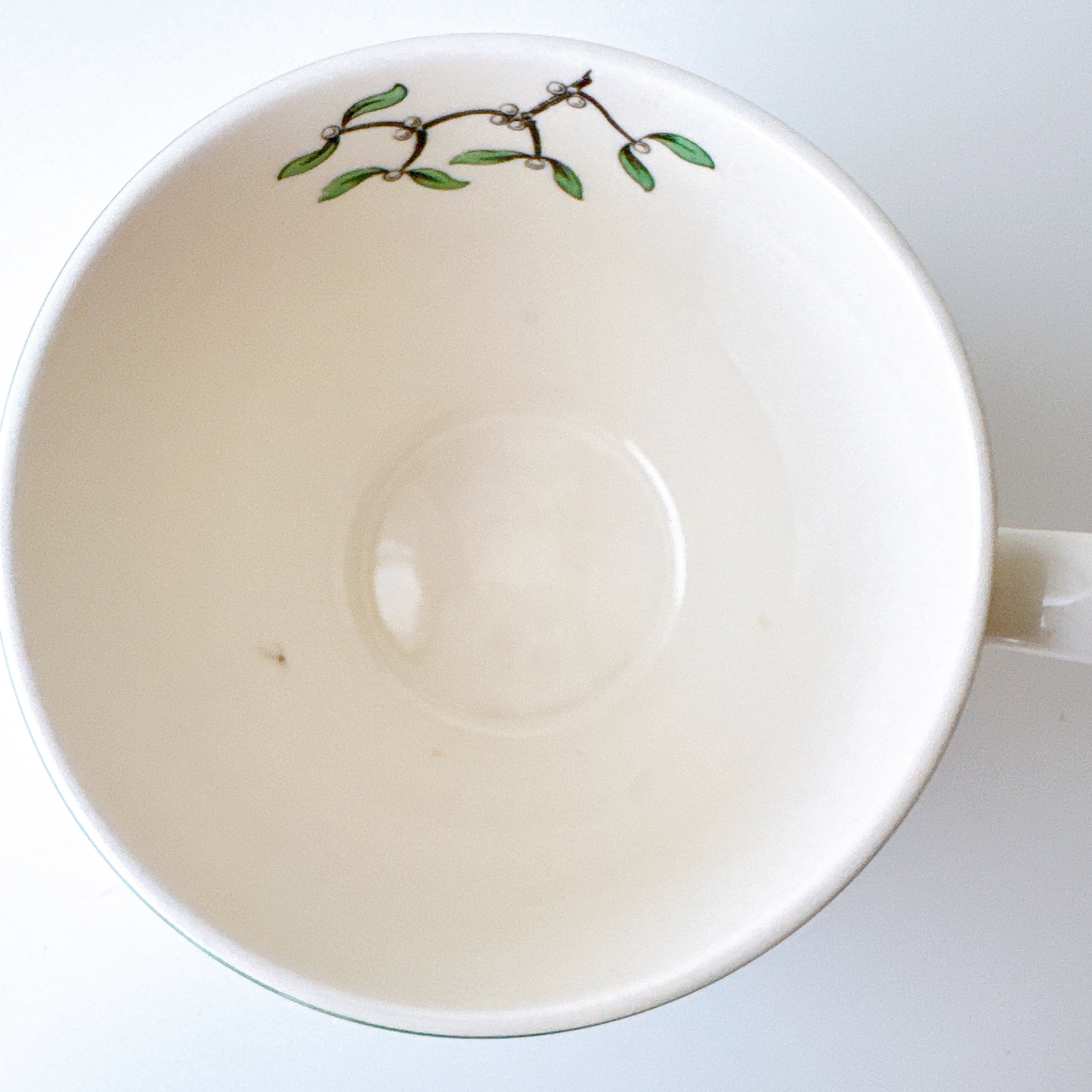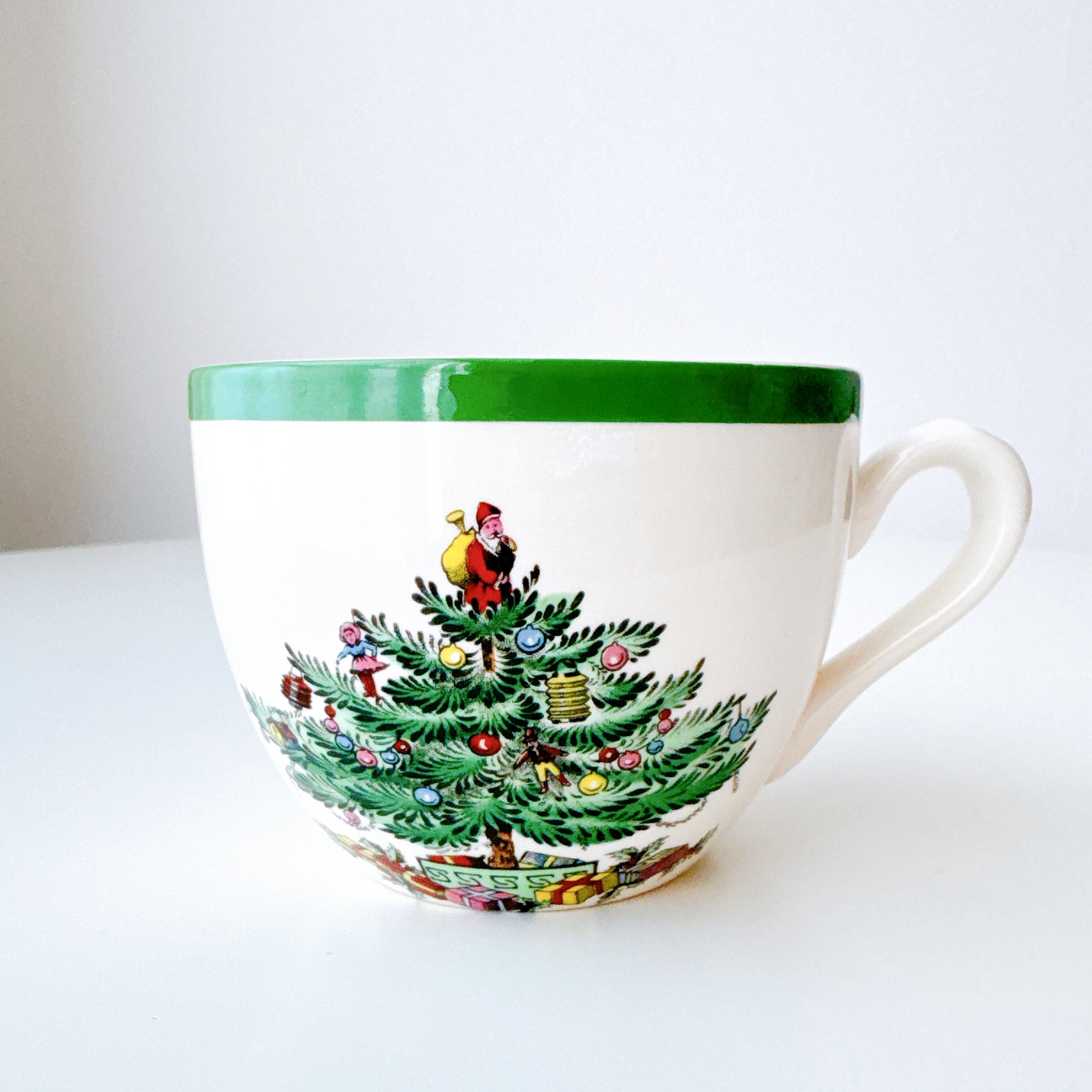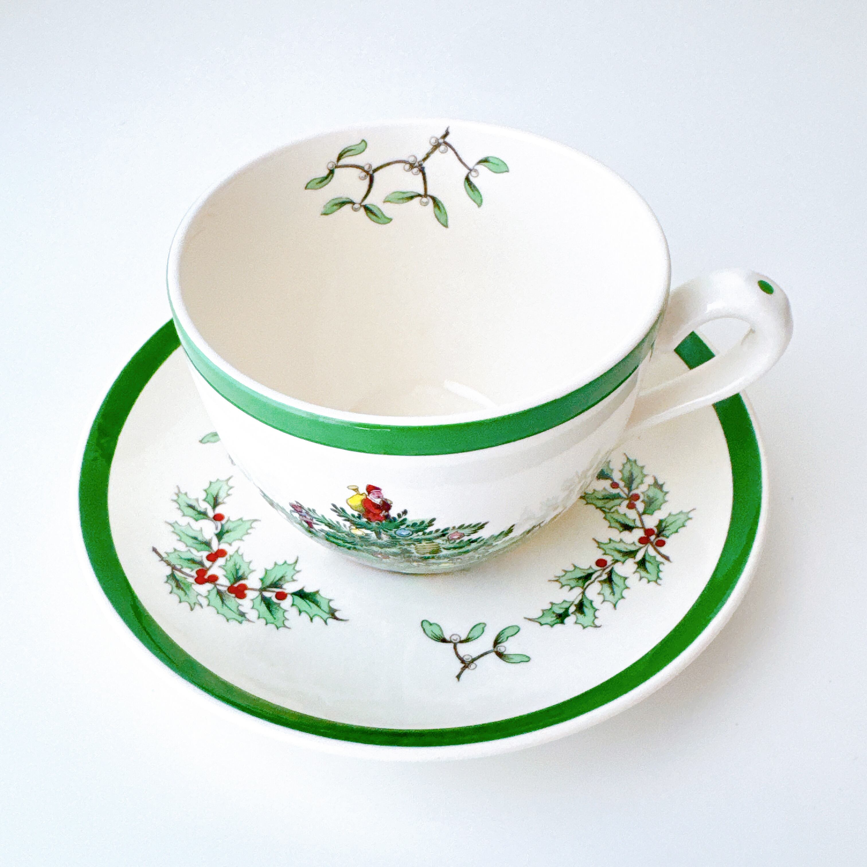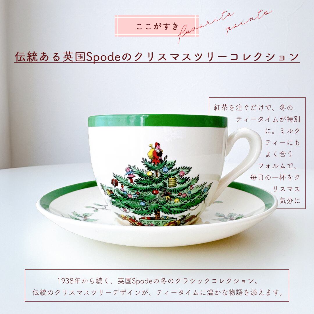 英国の名窯 Spode(スポード)が1938年に発表して以来、世界中で愛され続けている「Christmas Tree」シリーズ。その象徴的なツリーが、ティーカップにやわらかく描かれています。