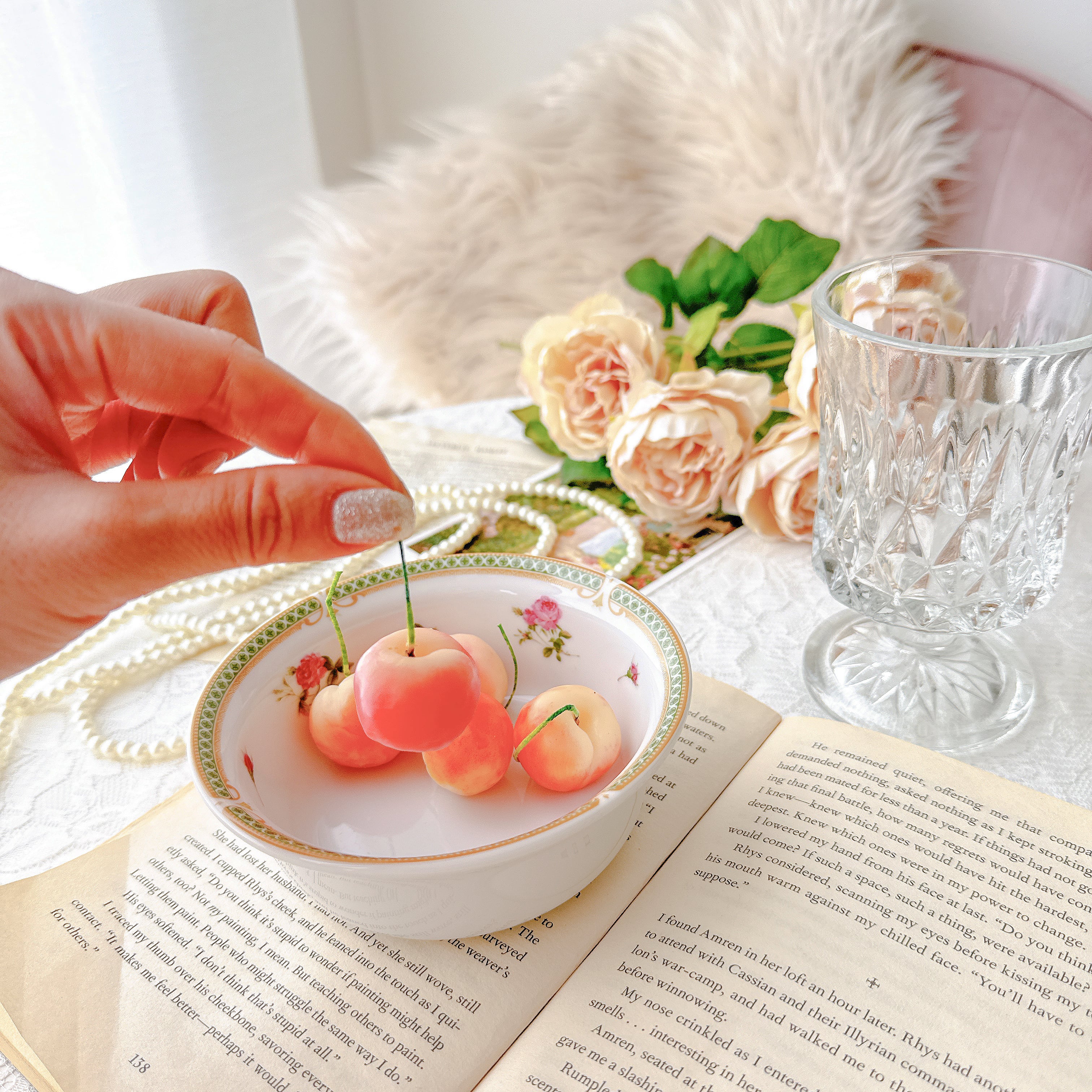 なめらかな白磁の器肌に、淡いピンクの薔薇が点描のようにあしらわれ、そのまわりを小さな葉のガーランドがそっと取り囲みます。