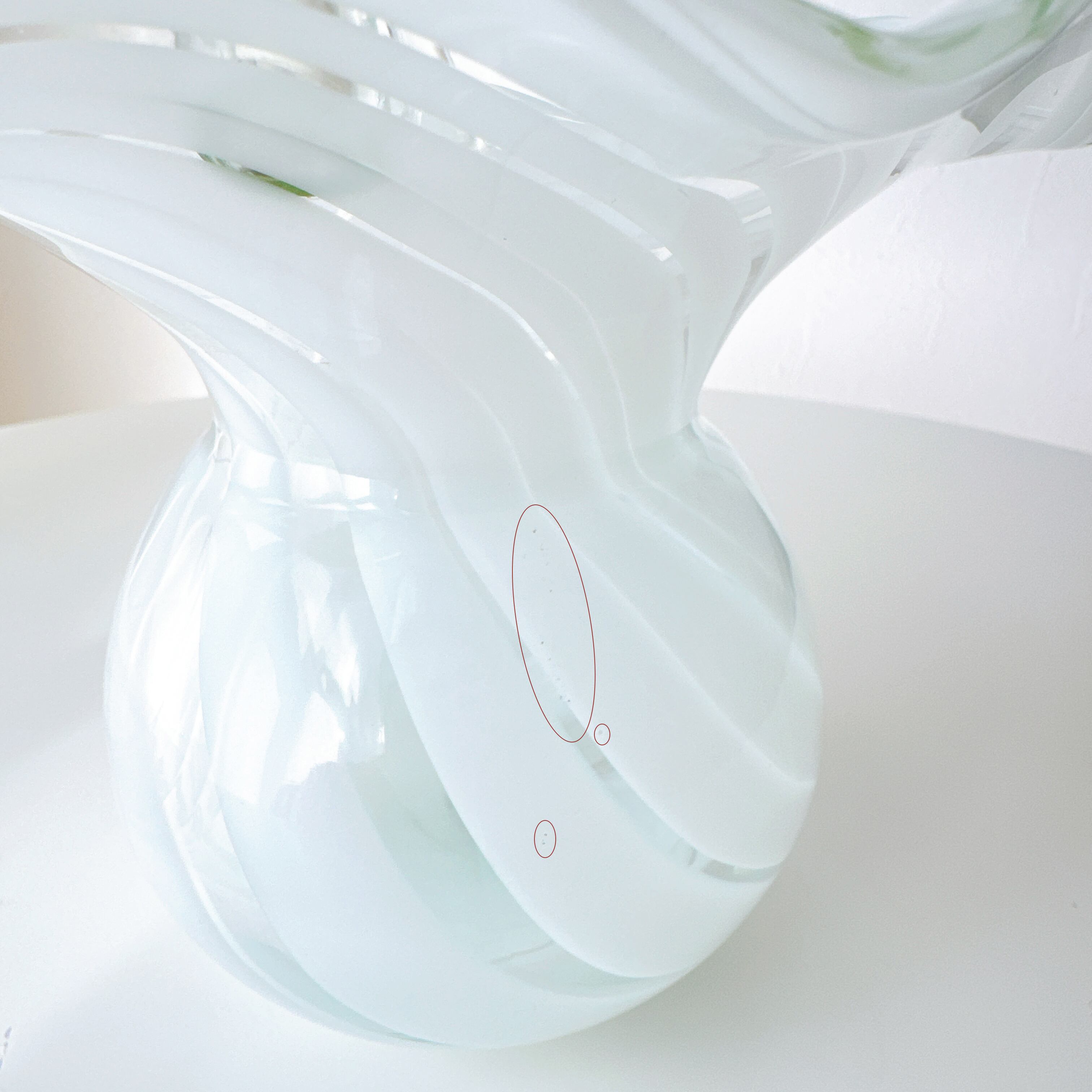 やわらかな乳白色のガラスが、光を受けて静かに揺らぐ花瓶。
