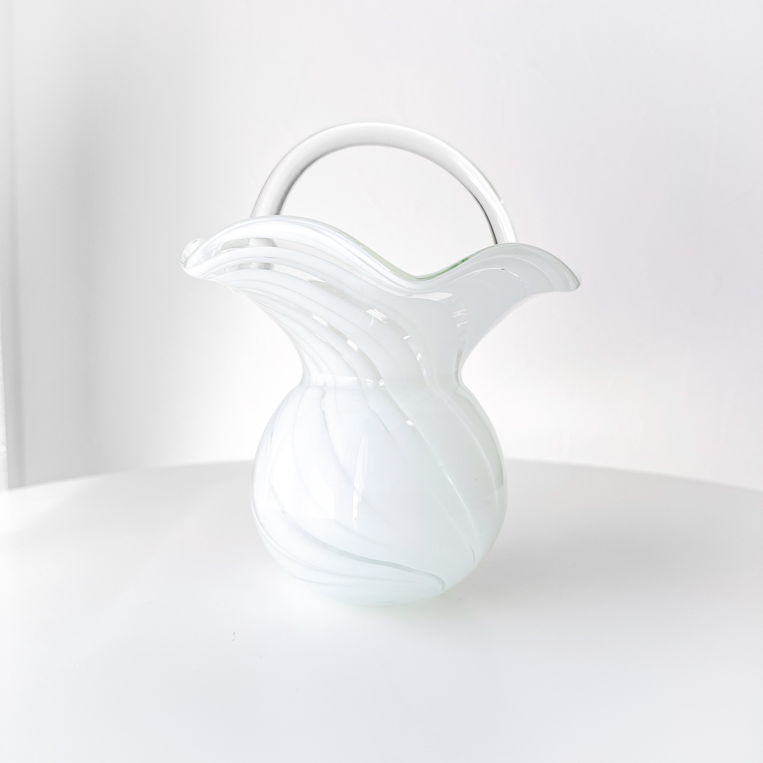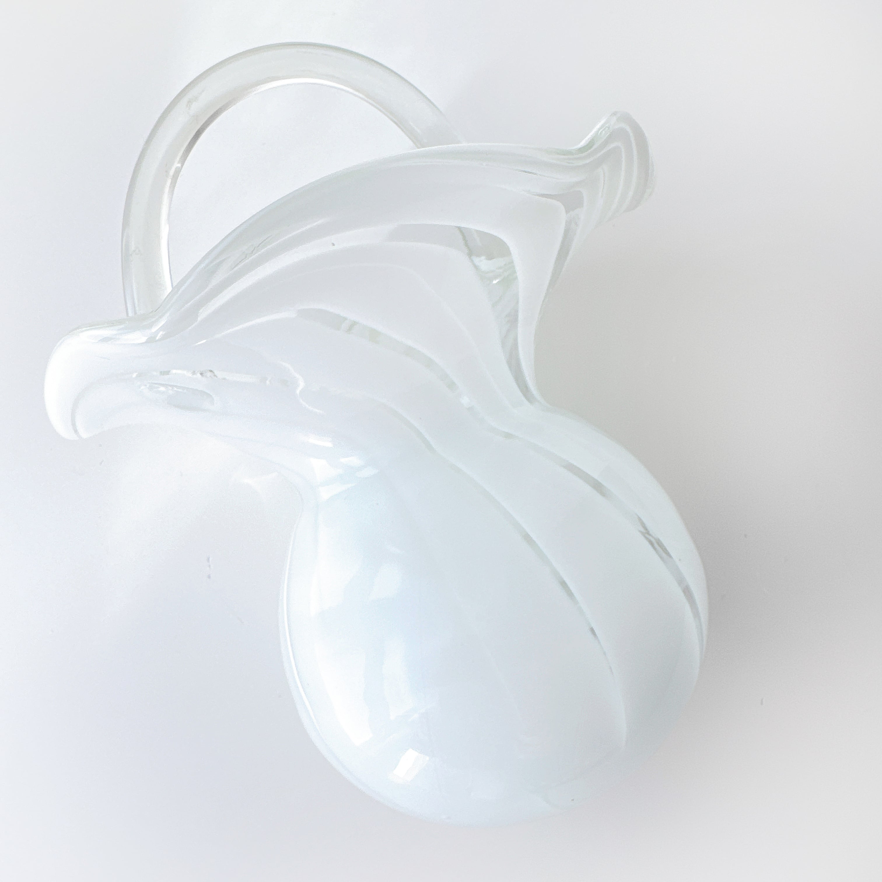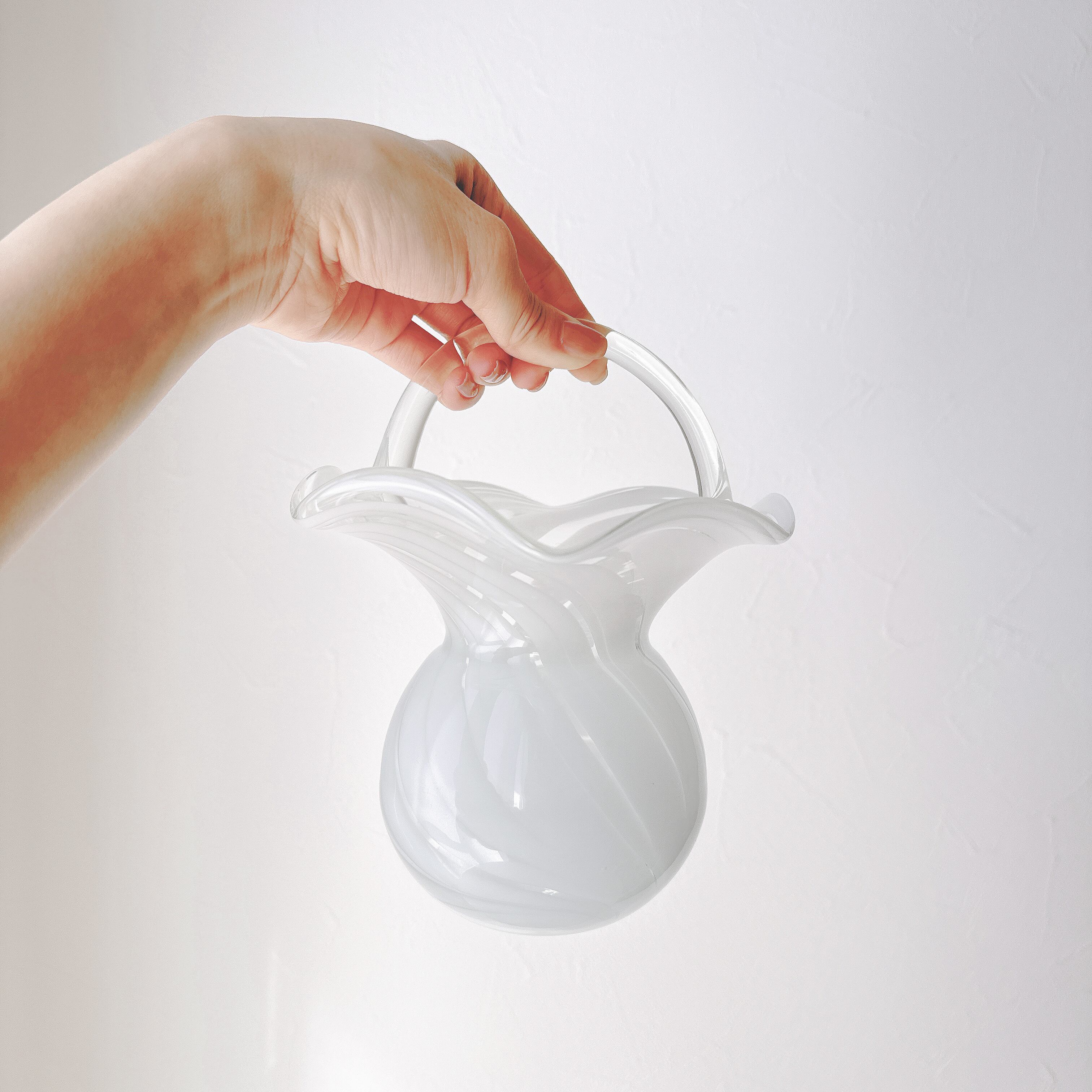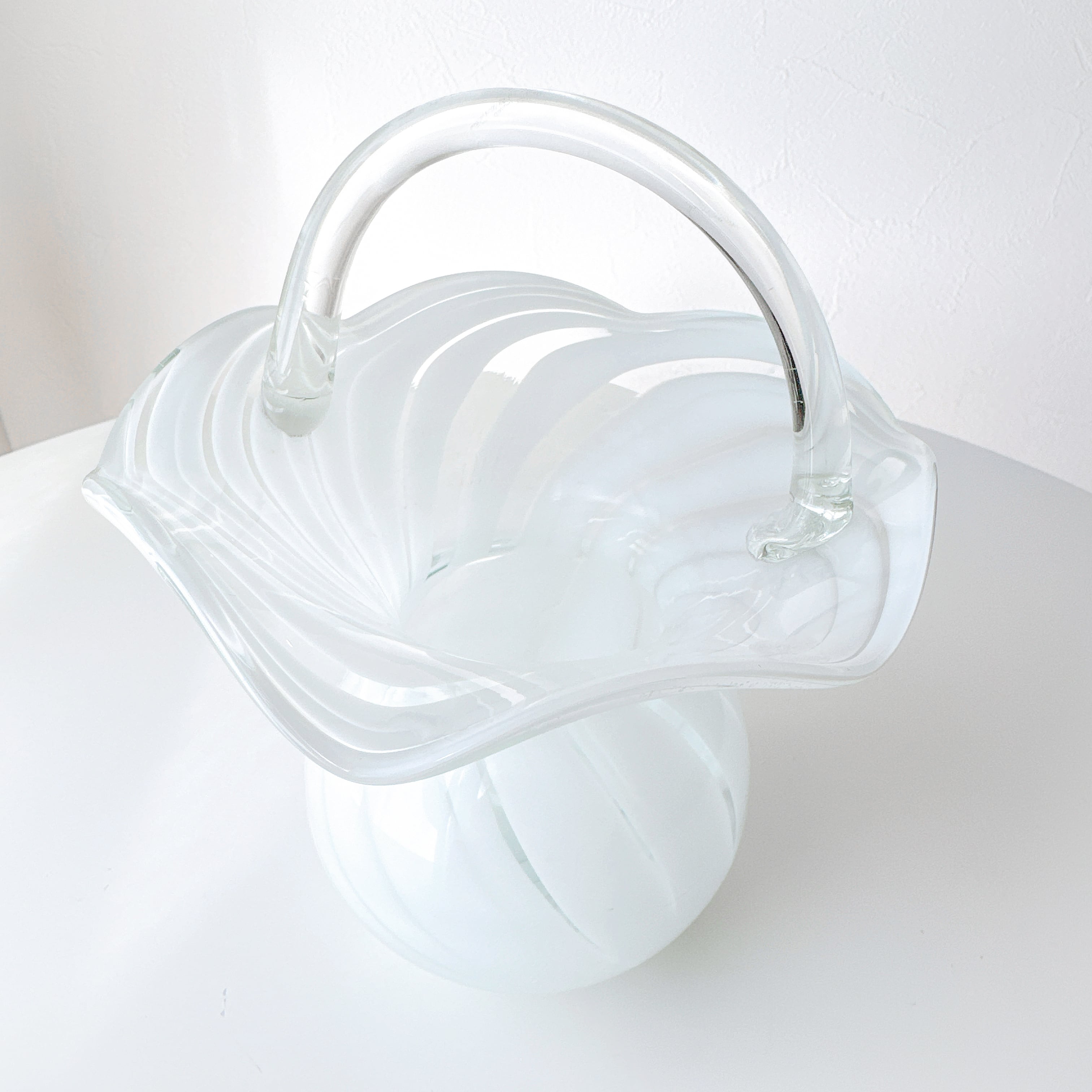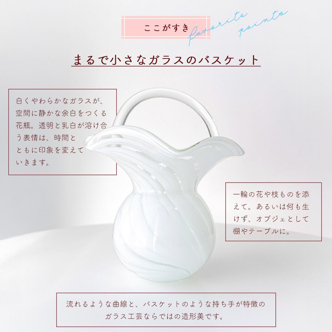 なめらかな曲線で描かれた胴体に、波打つように広がる口元、そして優雅なアーチを描く持ち手が添えられ、まるで小さなガラスのバスケットのような佇まいです。