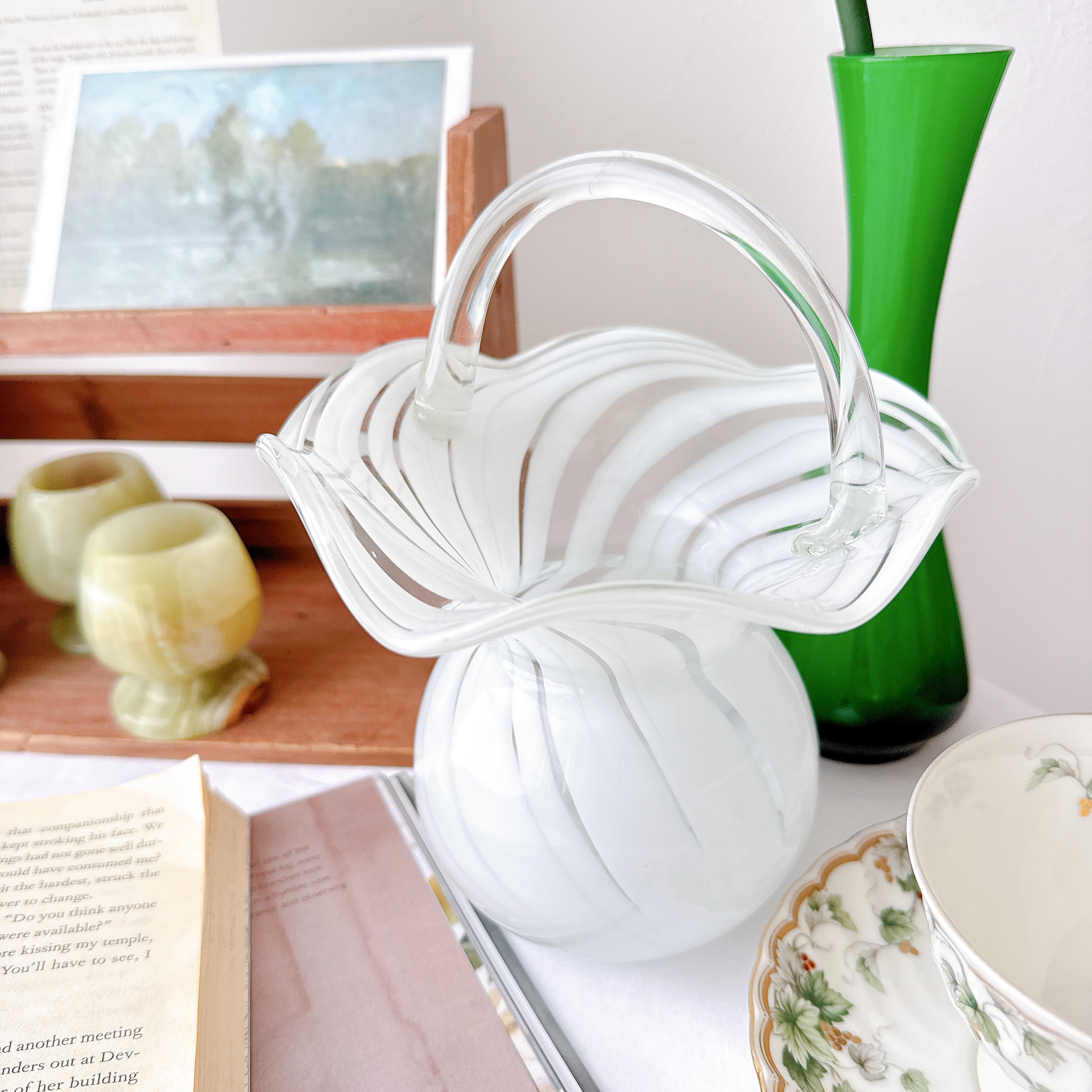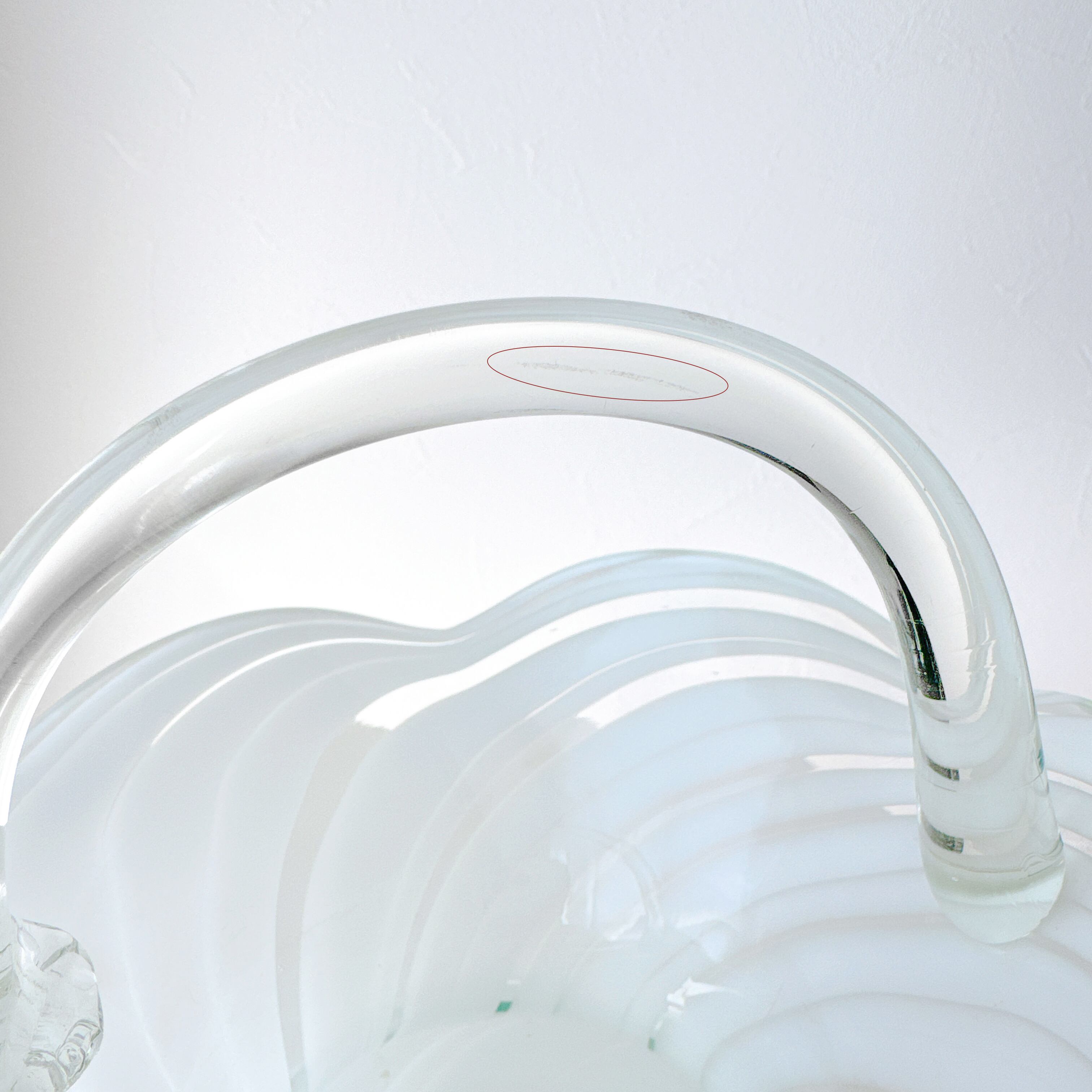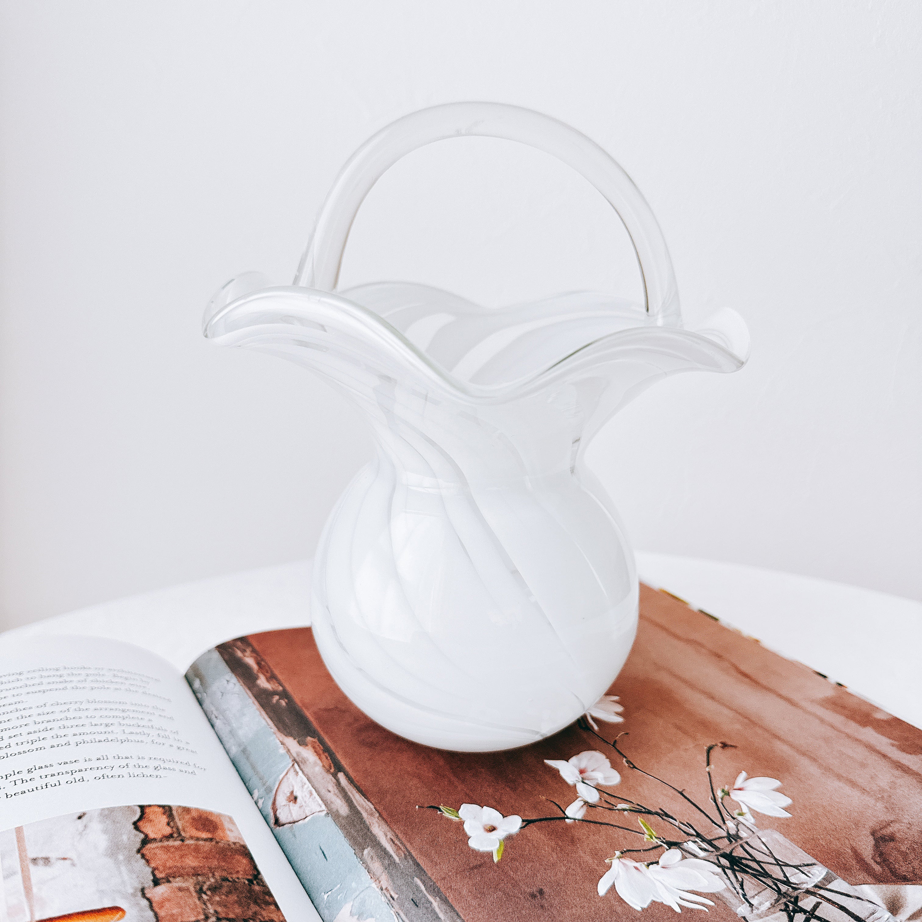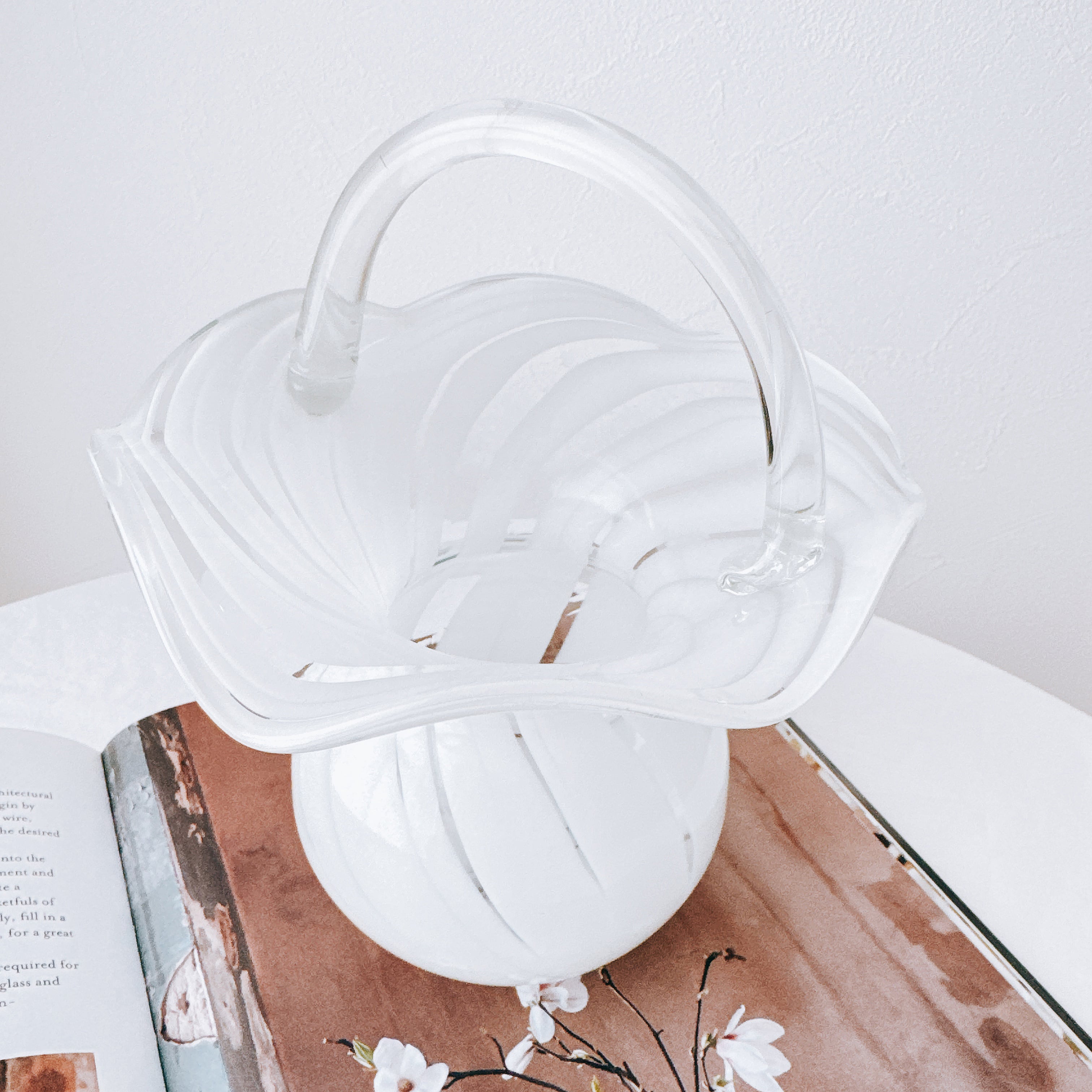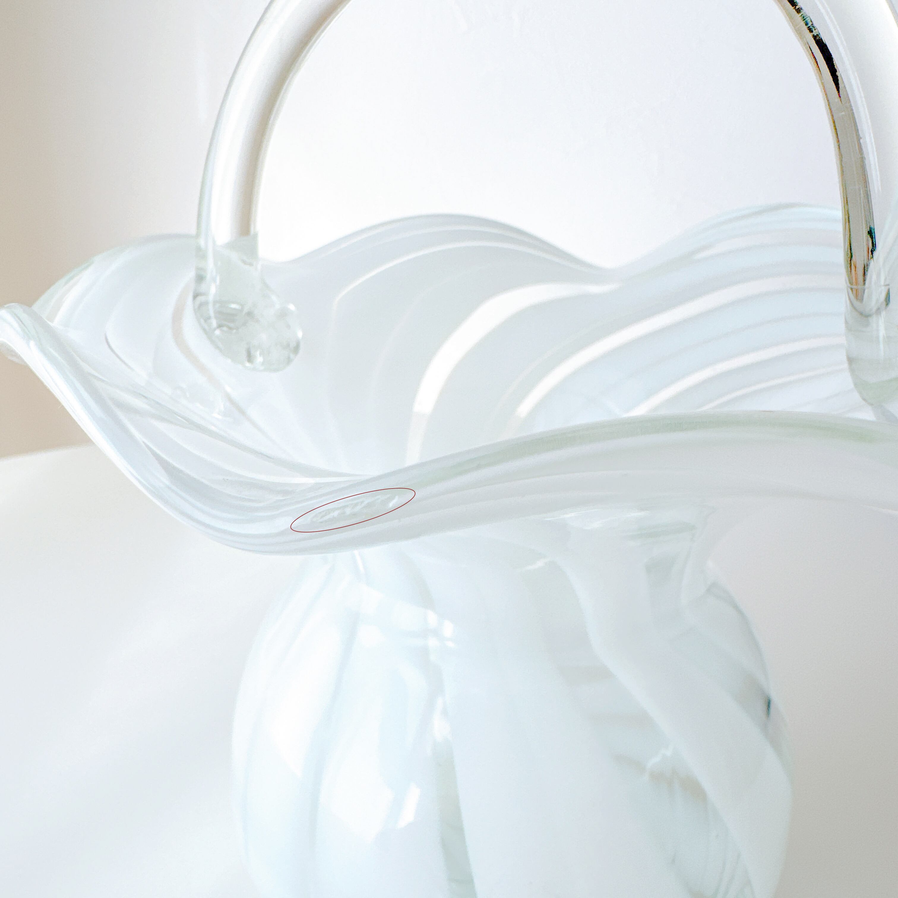 なめらかな曲線で描かれた胴体に、波打つように広がる口元、そして優雅なアーチを描く持ち手が添えられ、まるで小さなガラスのバスケットのような佇まいです。