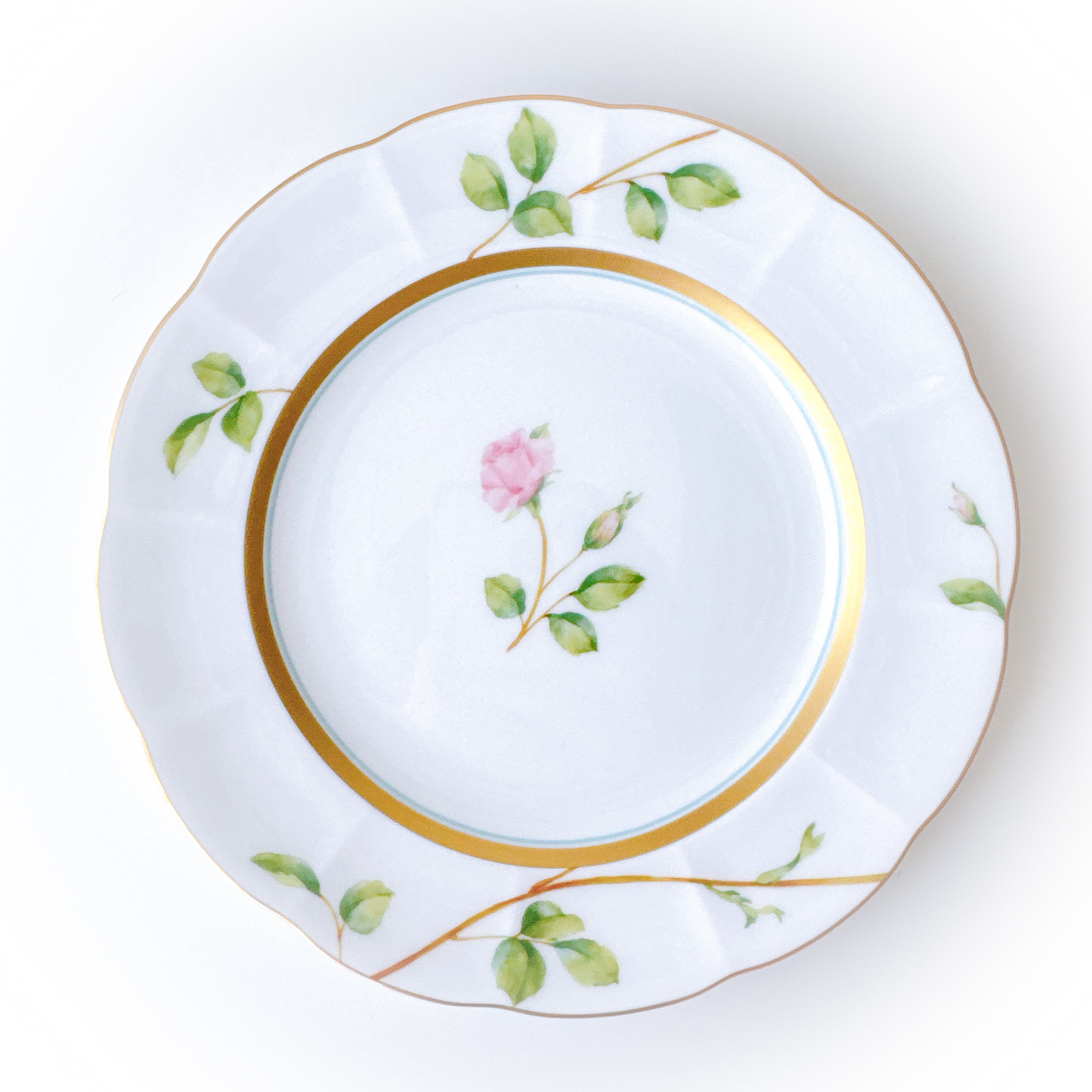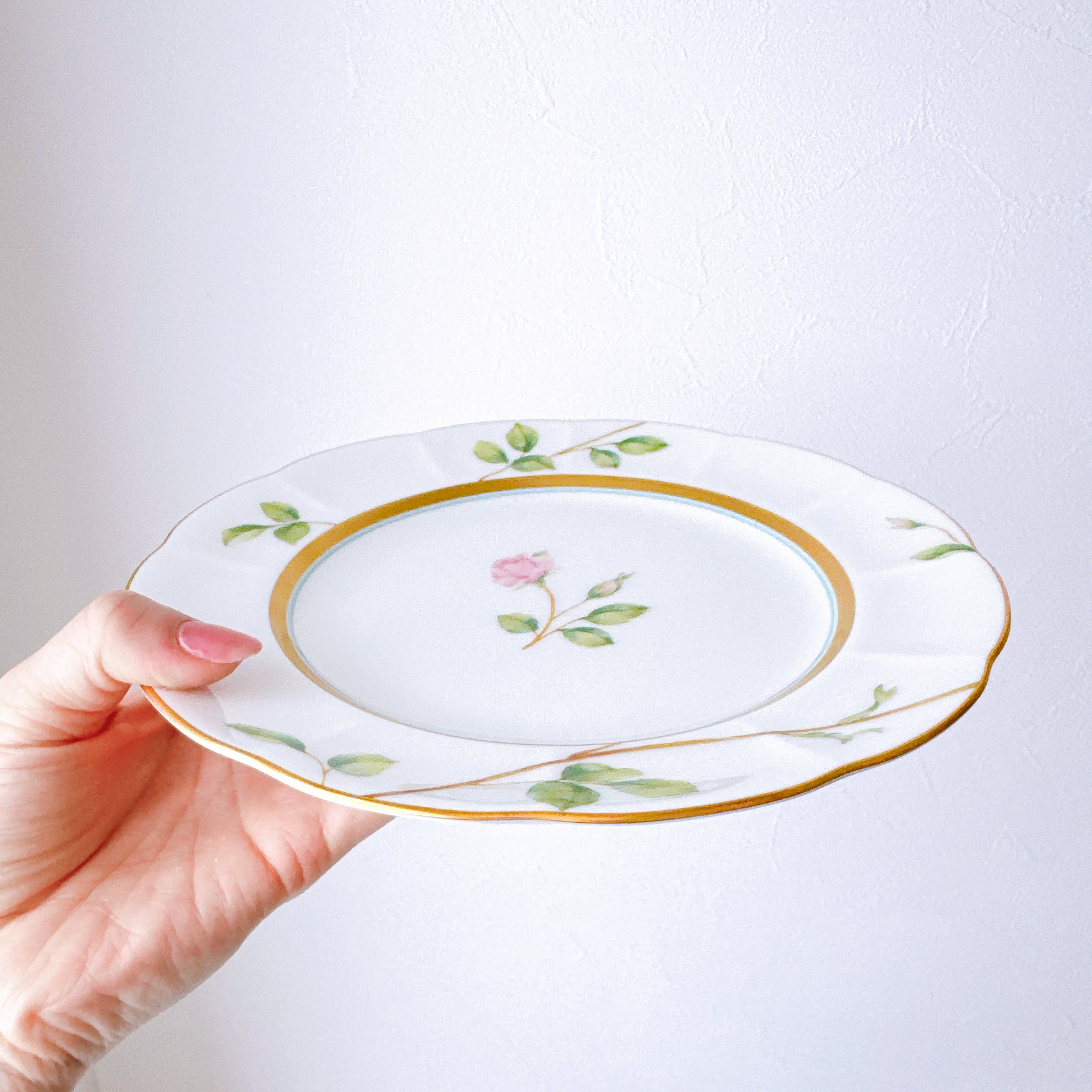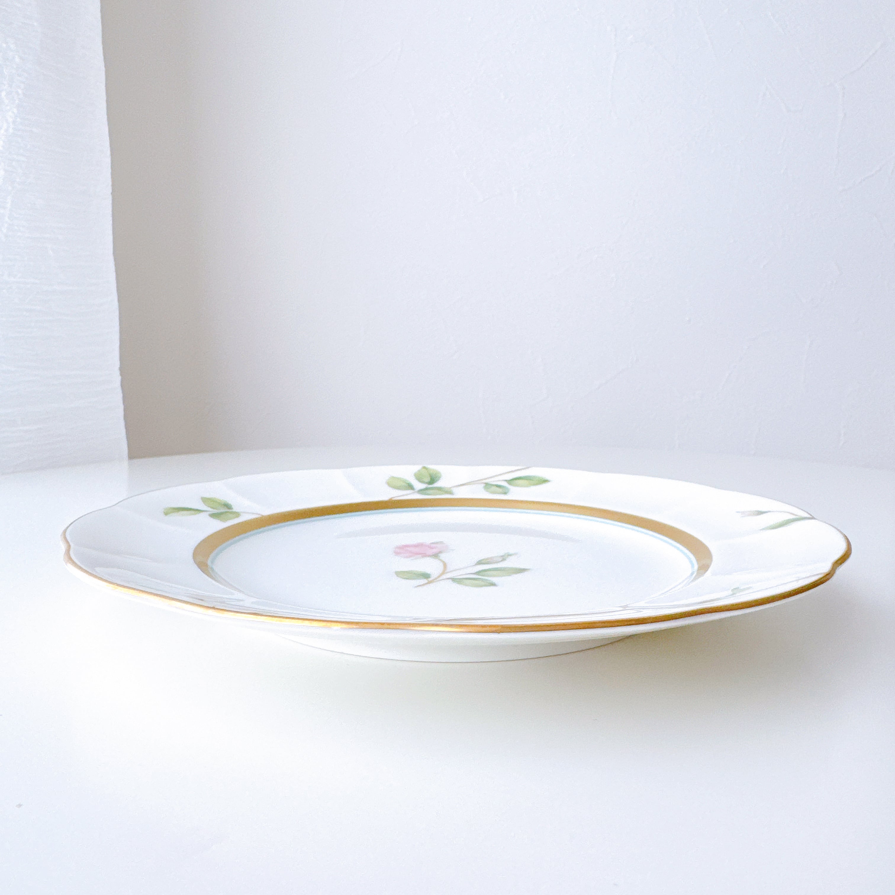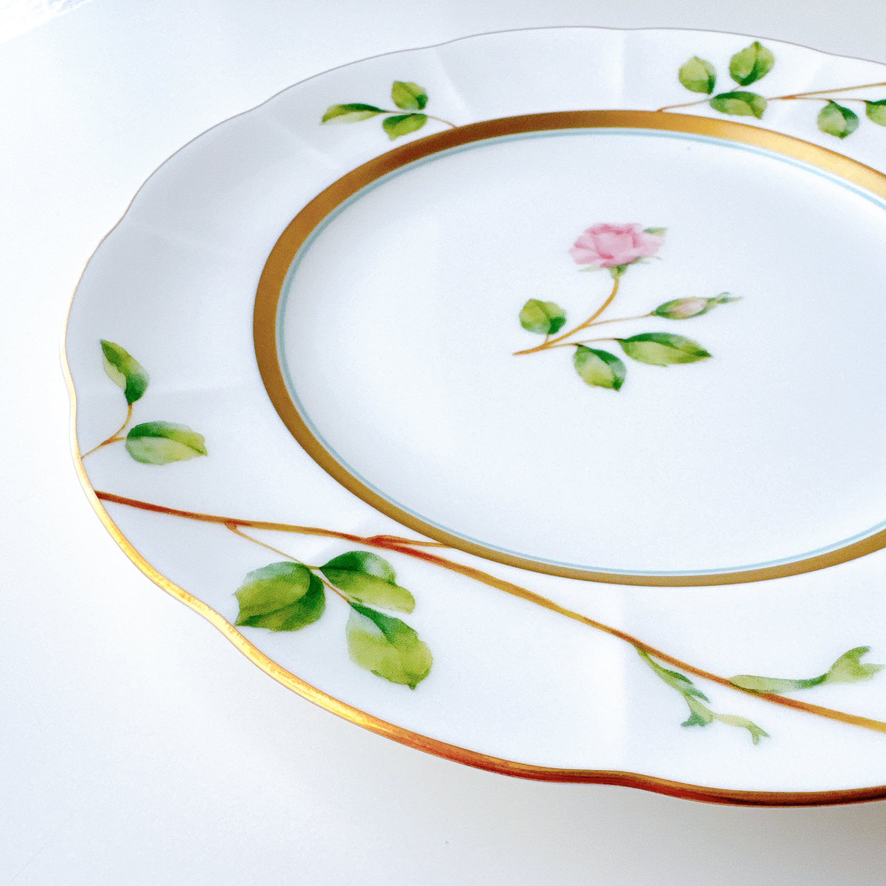 中央に咲くローズは可憐でありながら凛とし、縁を彩る繊細な金彩が上品なアクセントに。