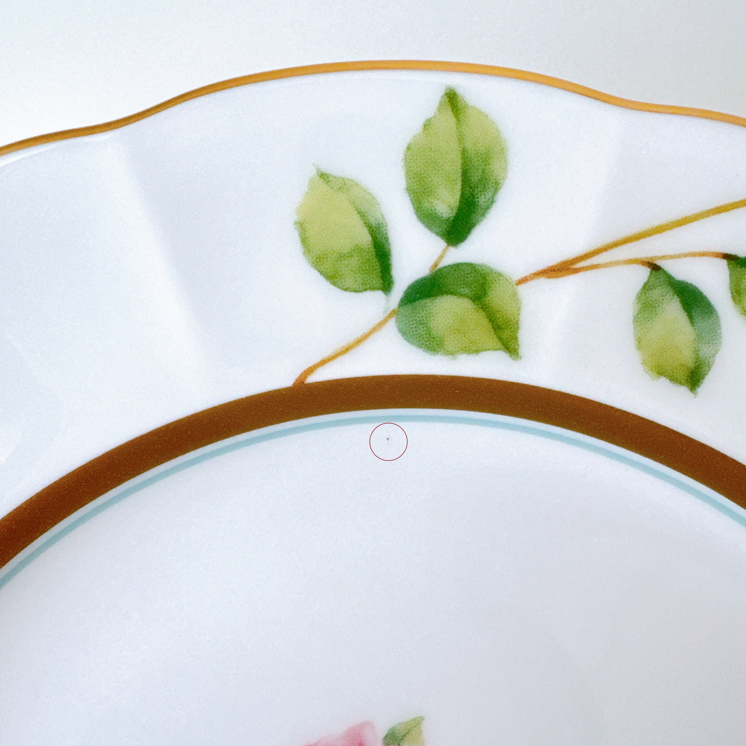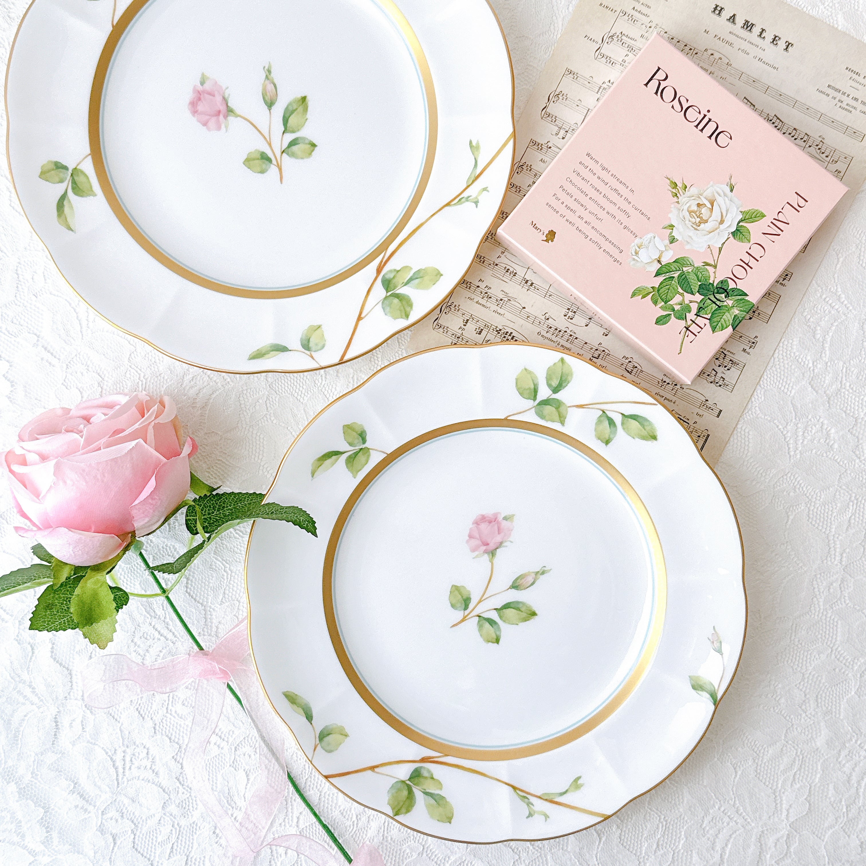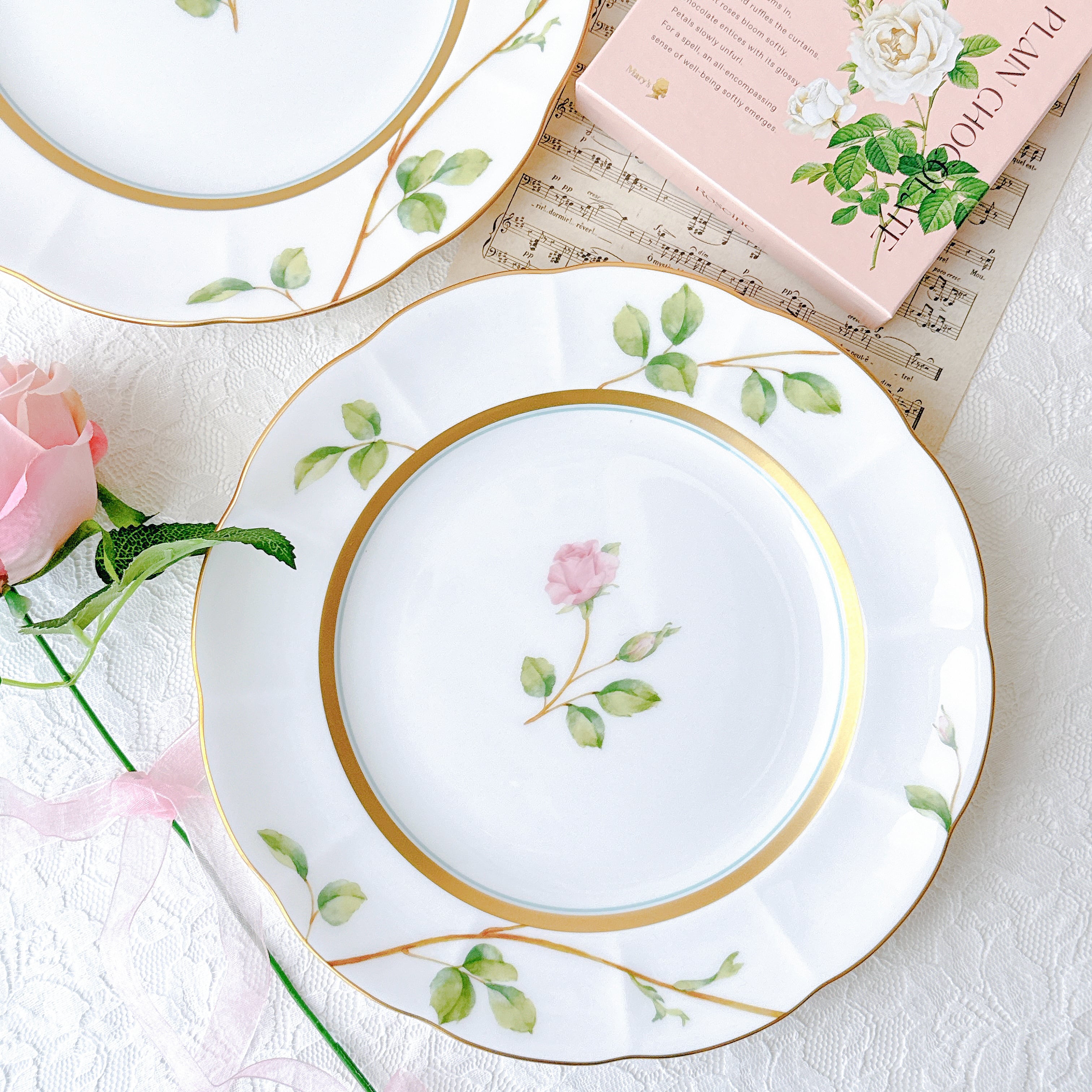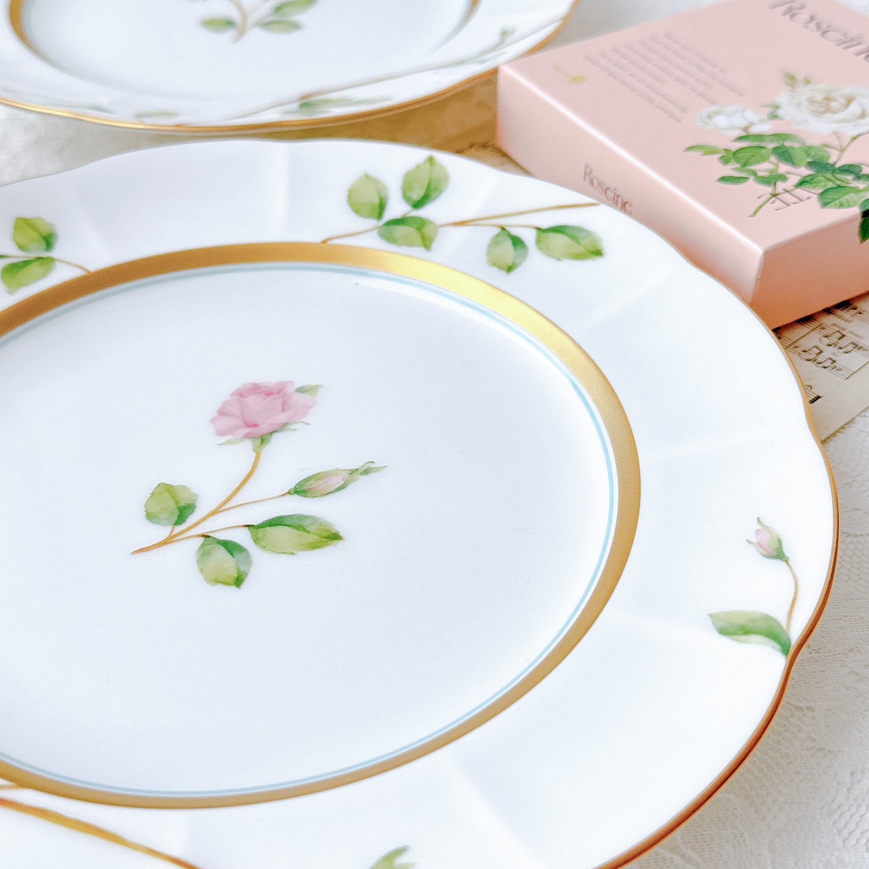 中央に咲くローズは可憐でありながら凛とし、縁を彩る繊細な金彩が上品なアクセントに。