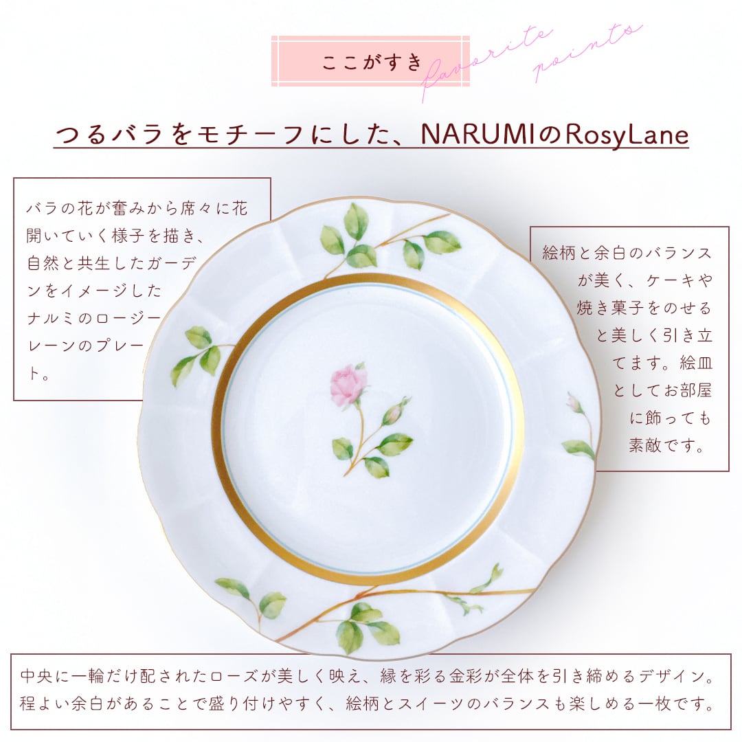 なめらかな白磁に、やわらかなピンクローズが一輪。NARUMI BONE CHINA「Rosy Lane」(ナルミボーンチャイナロージーレーン)シリーズのプレートは、のびやかに描かれた蔓とみずみずしいグリーンが、軽やかで優雅な印象を与えます。絵柄のモチーフは、「つるバラ」です。バラの花が奮みから席々に花開いていく様子を描いており、自然と共生したガーデンをイメージしています。RosyLaneはバラの小道という意味。