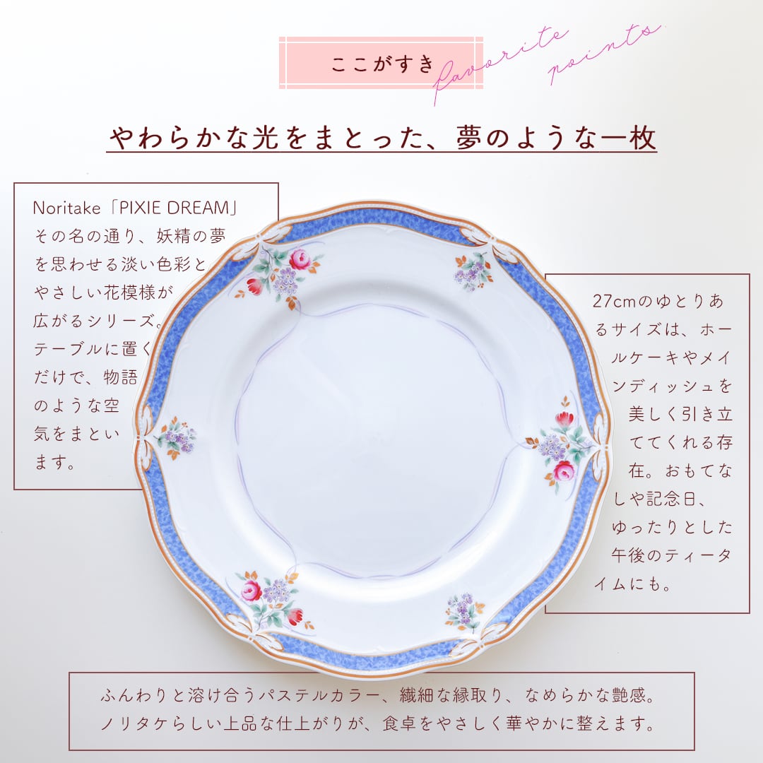 やわらかな光をまとった、夢のような一枚。Noritakeの「PIXIE DREAM」は、その名の通り、妖精の気配がそっと漂うようなシリーズです。淡く溶け合うパステルの色彩、ふんわりとした花々の装飾。どこか物語のワンシーンのような優美さを感じさせてくれます。