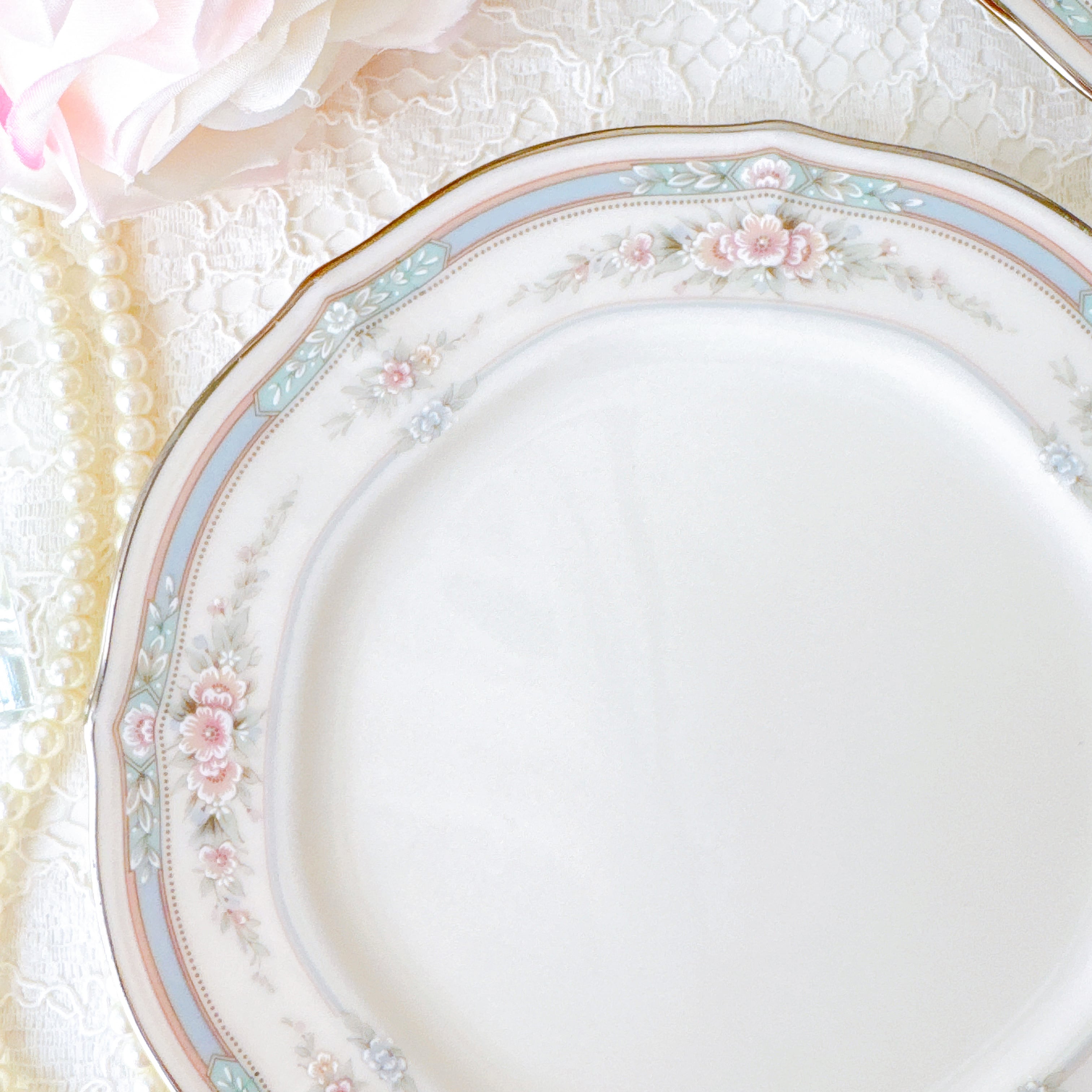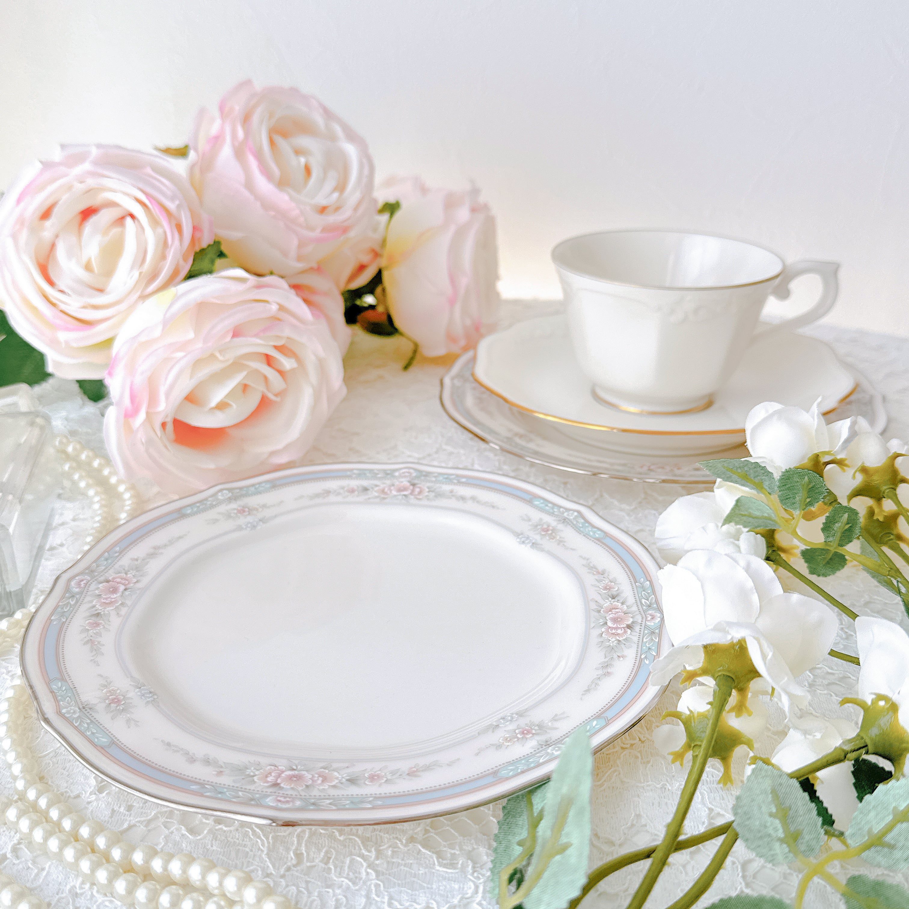 ノリタケのアイボリーチャイナは、ほんのりと温かみを帯びた白い磁肌が特徴。そのやさしい色合いに、淡いブルーとピンクの帯、そして可憐な小花が繊細に描かれています。縁に施されたやわらかなスカラップのシルエットとプラチナトリムが、クラシカルで上品な雰囲気を引き立てています。