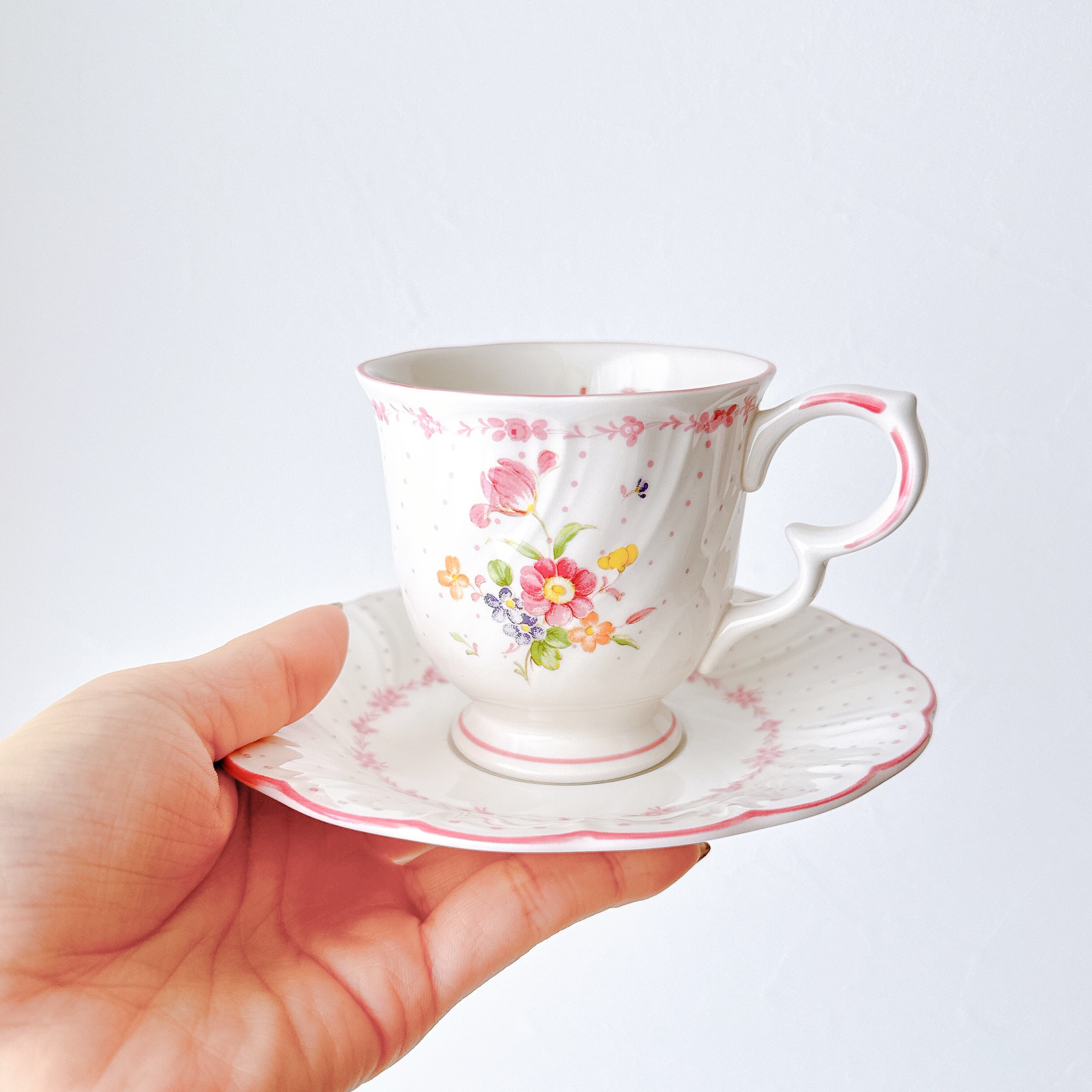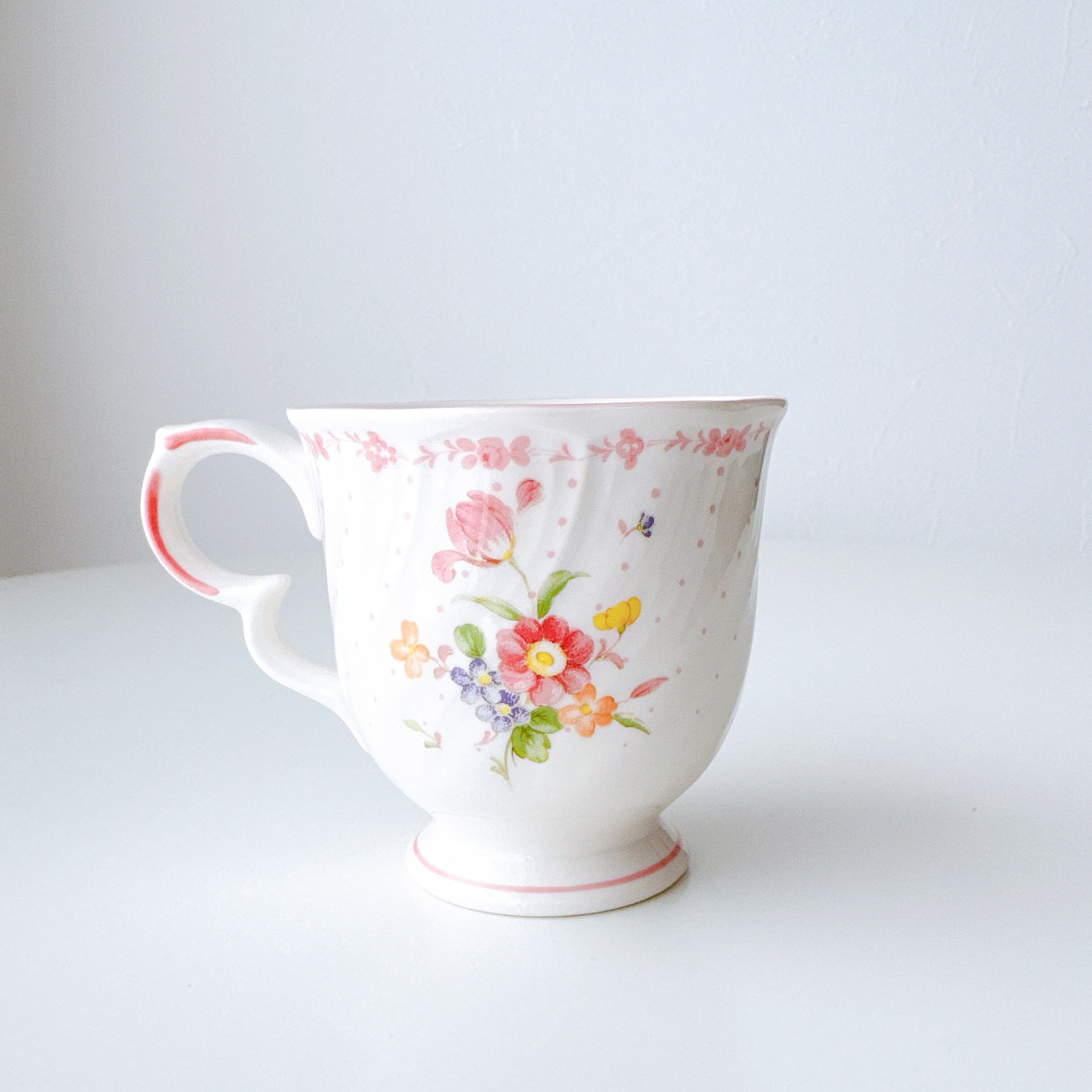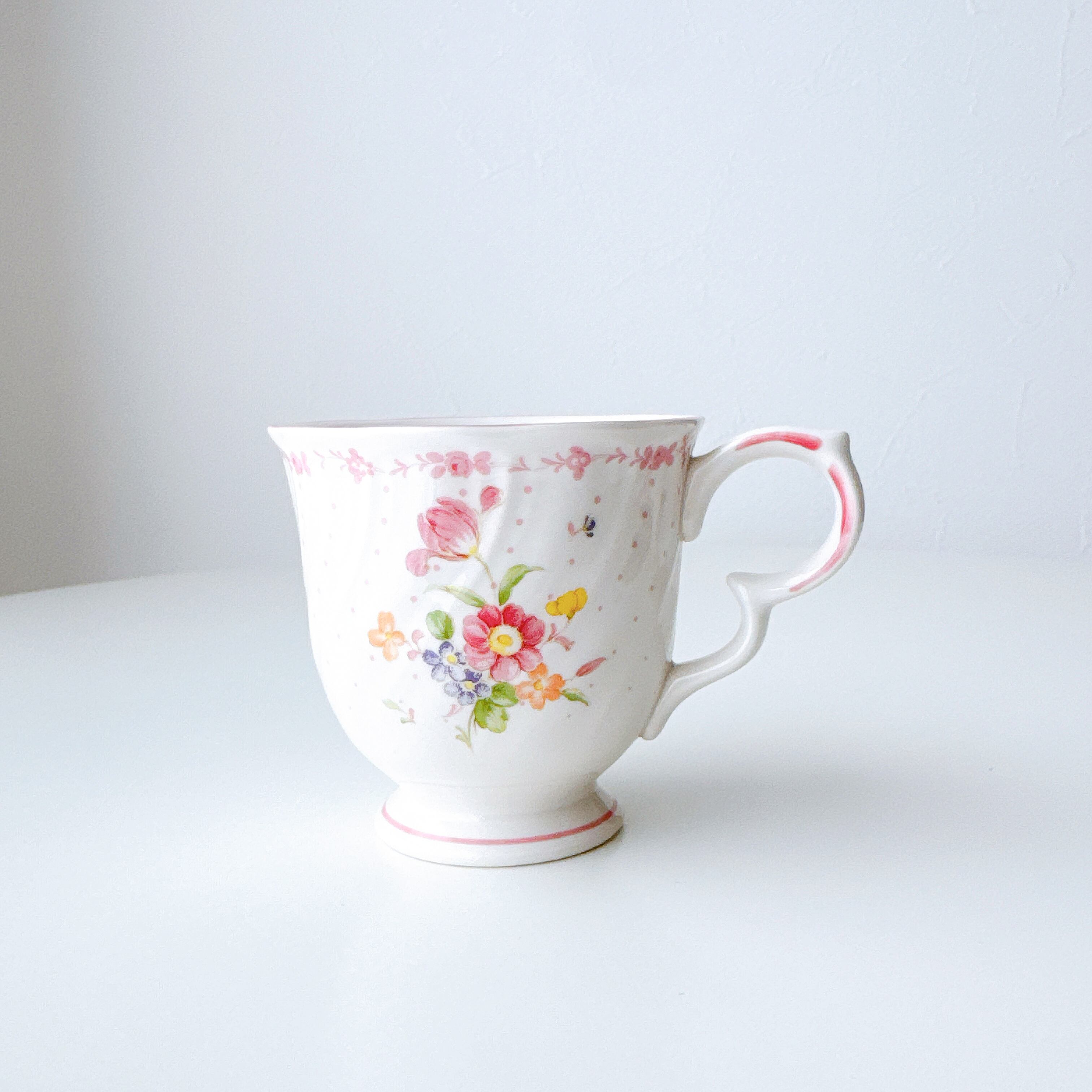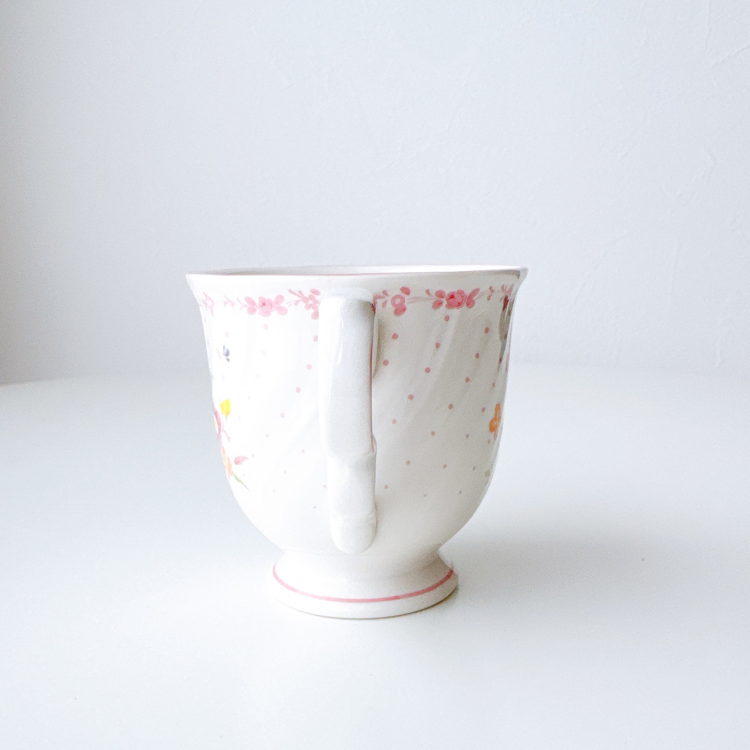 白磁のやわらかな質感に、淡く愛らしいピンクやイエロー、小さなブルーの花々が寄り添うように描かれ、まるで絵本の1ページのような可憐な印象を与えてくれます。繊細なドット模様と、ふんわりと波打つフォルムが、どこか少女の頃の憧れを思い出させてくれるようなデザインです。持ち手のやさしい曲線、そして口元を縁取る淡いピンクのライン。細部まで丁寧に施された装飾は、日常のひとときをほんの少し特別なものへと変えてくれます。