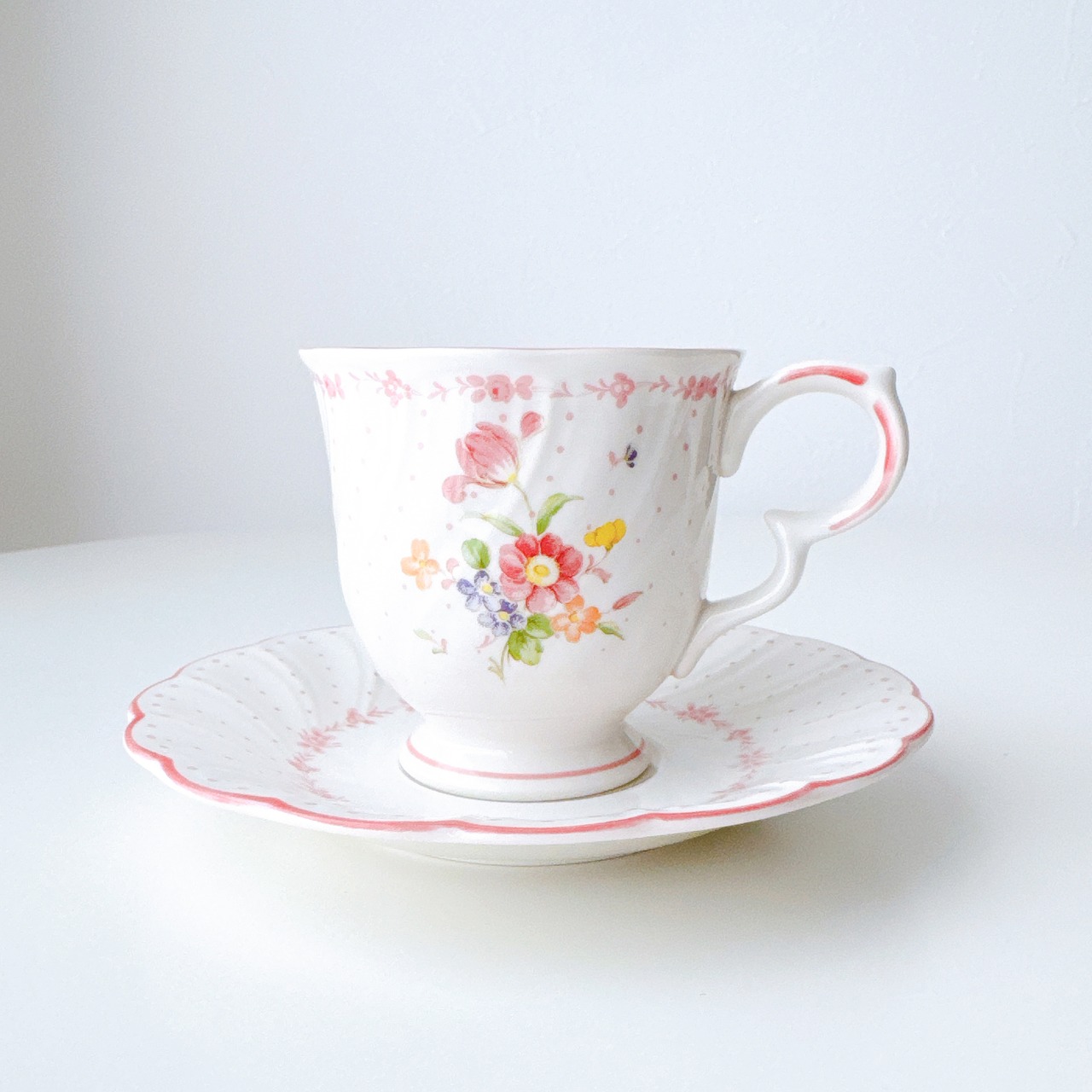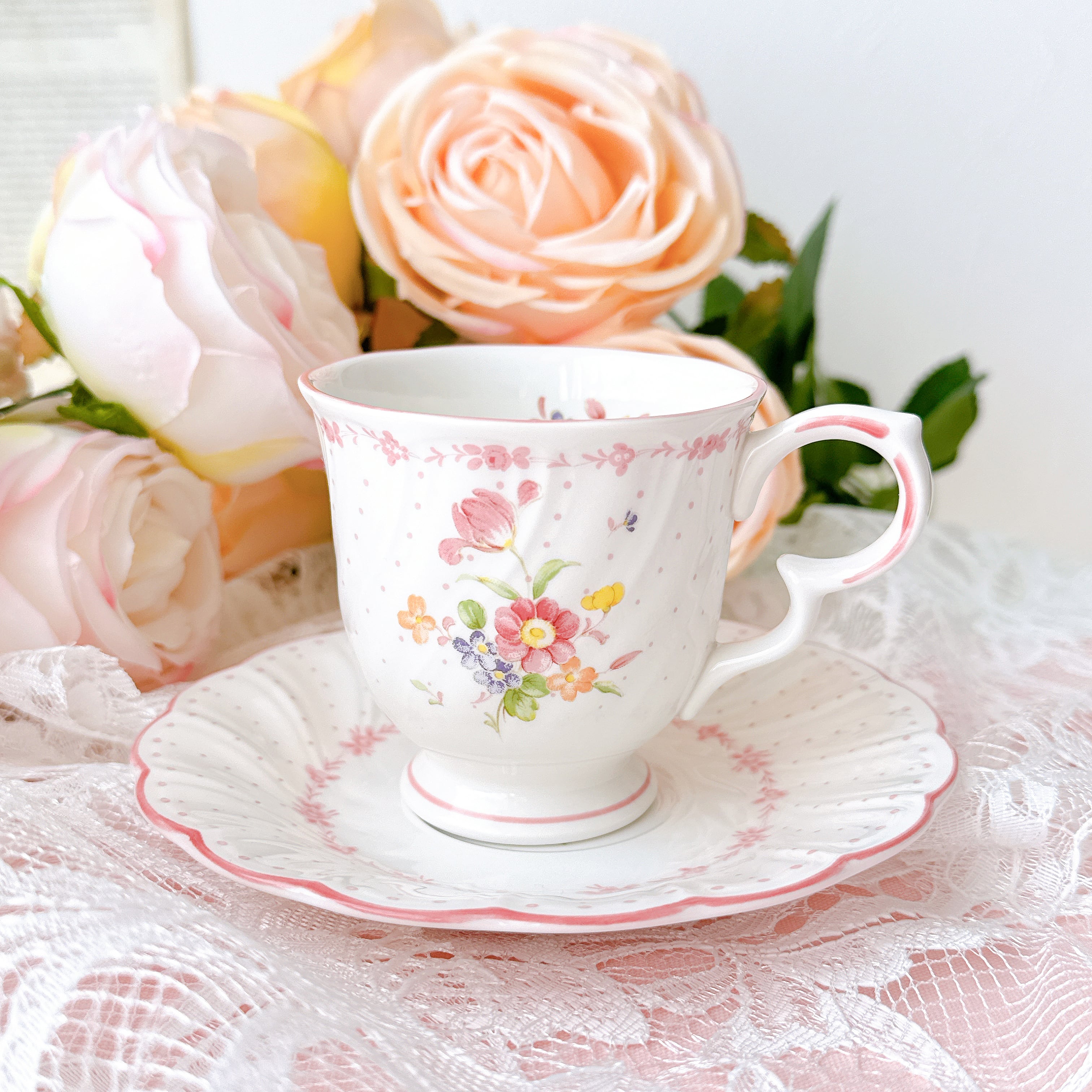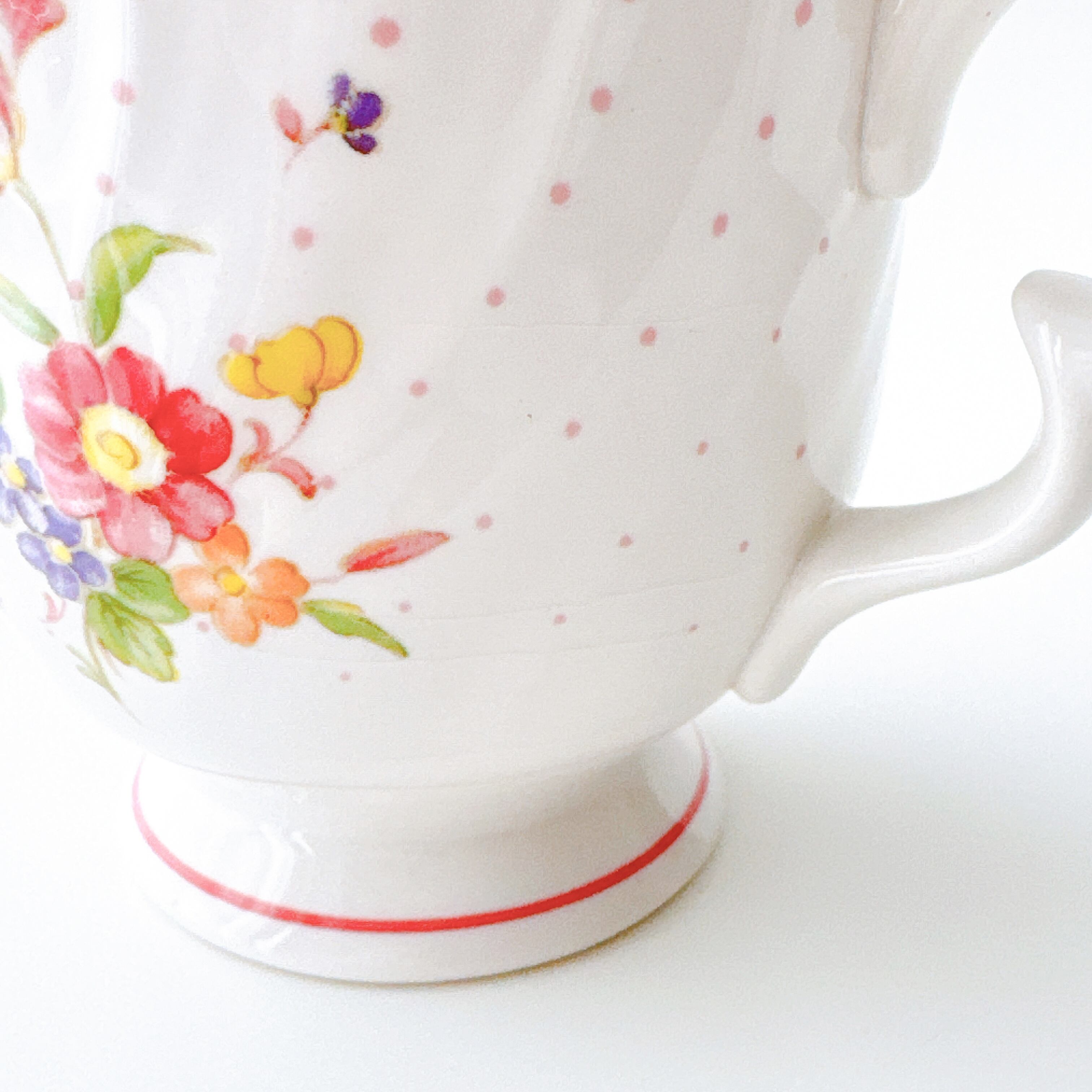 白磁のやわらかな質感に、淡く愛らしいピンクやイエロー、小さなブルーの花々が寄り添うように描かれ、まるで絵本の1ページのような可憐な印象を与えてくれます。繊細なドット模様と、ふんわりと波打つフォルムが、どこか少女の頃の憧れを思い出させてくれるようなデザインです。持ち手のやさしい曲線、そして口元を縁取る淡いピンクのライン。細部まで丁寧に施された装飾は、日常のひとときをほんの少し特別なものへと変えてくれます。