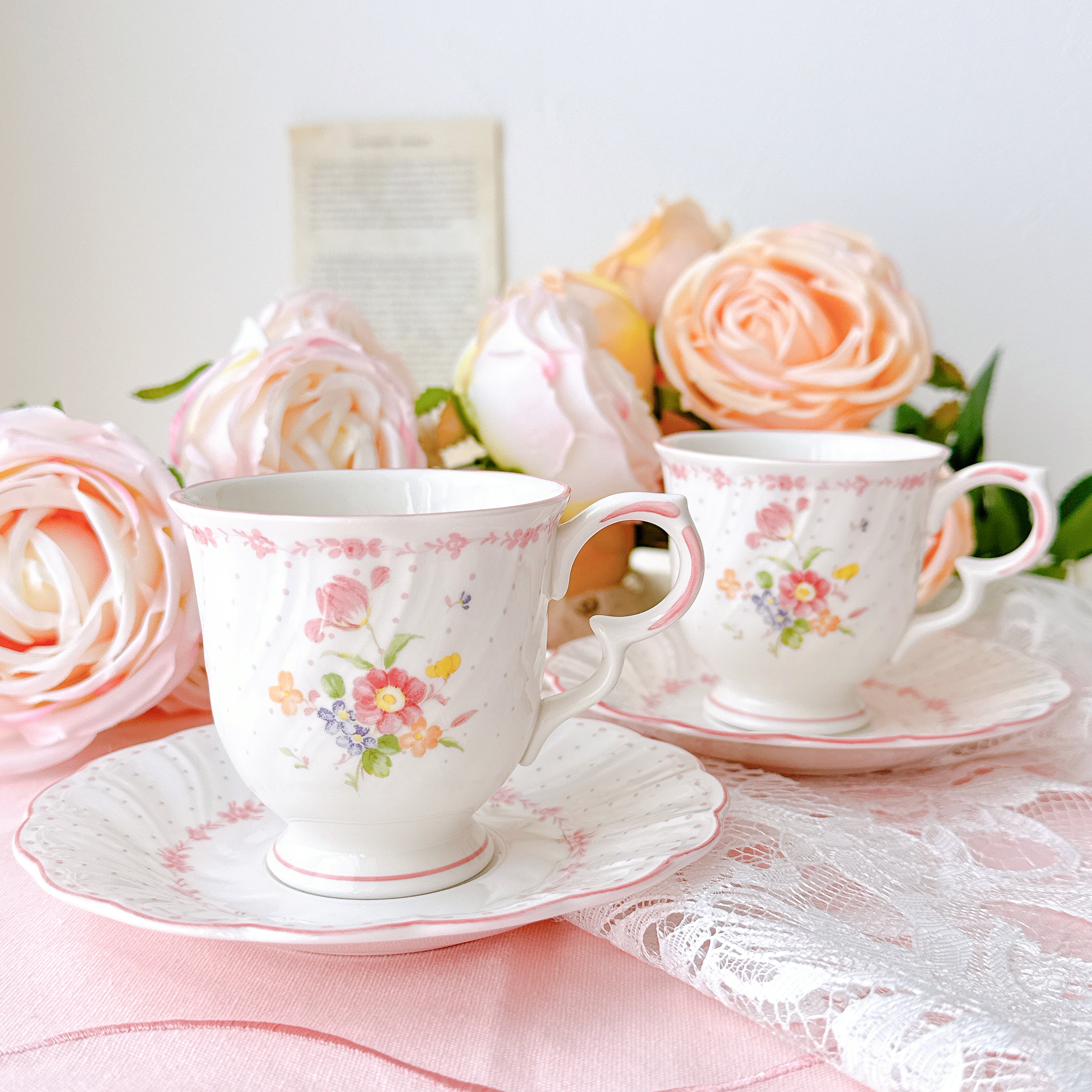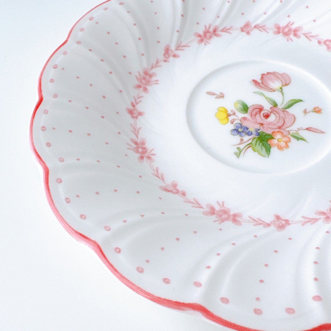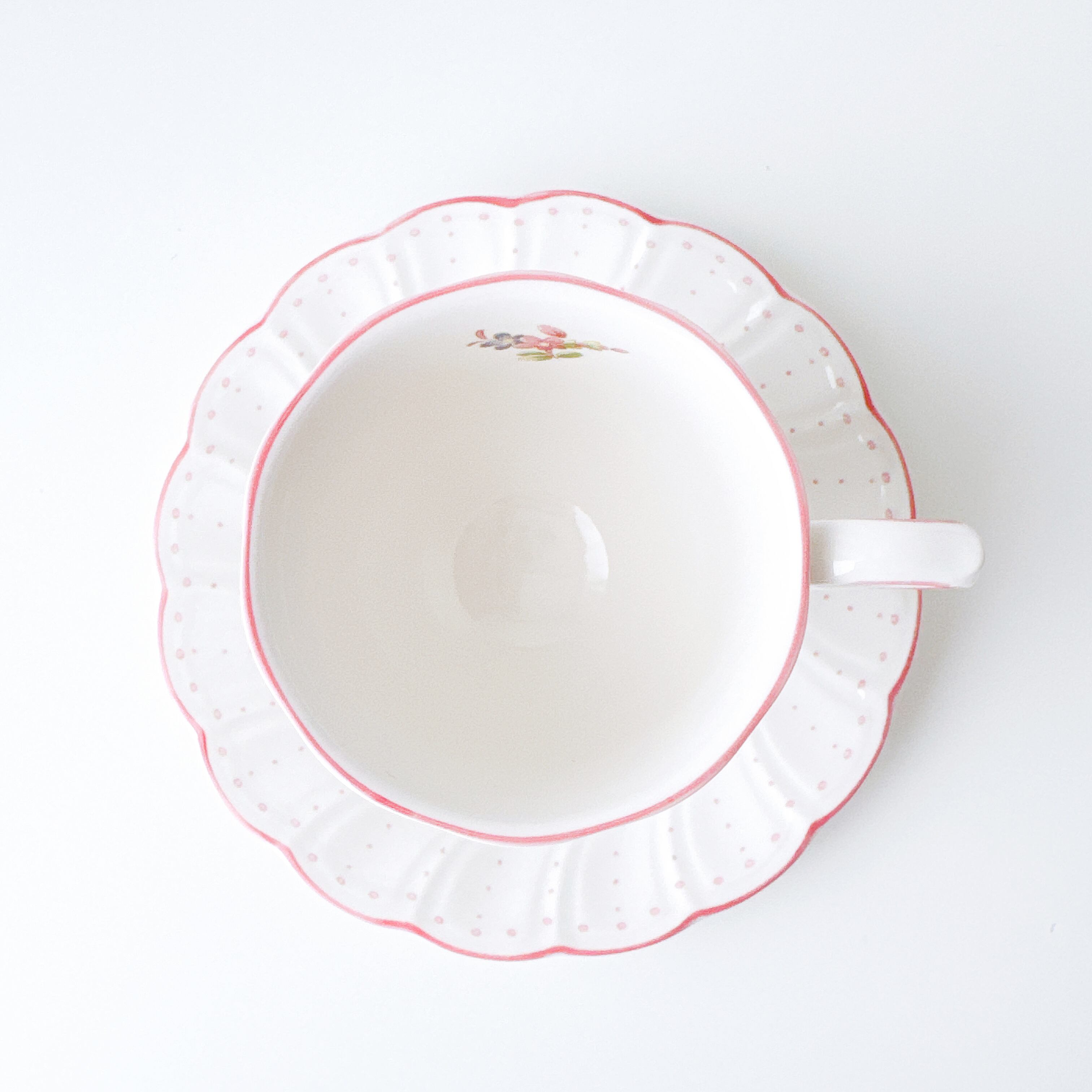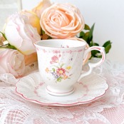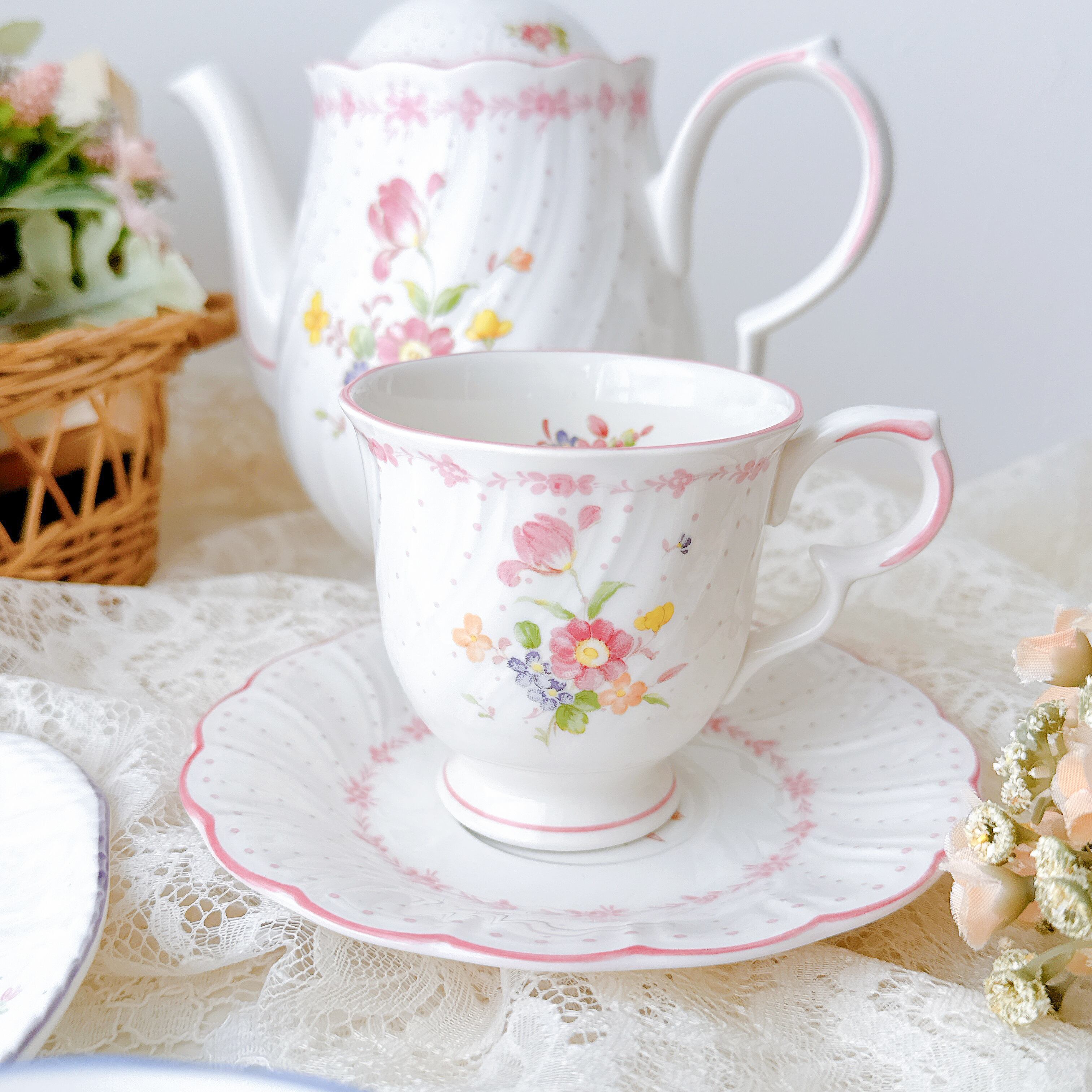 白磁のやわらかな質感に、淡く愛らしいピンクやイエロー、小さなブルーの花々が寄り添うように描かれ、まるで絵本の1ページのような可憐な印象を与えてくれます。繊細なドット模様と、ふんわりと波打つフォルムが、どこか少女の頃の憧れを思い出させてくれるようなデザインです。持ち手のやさしい曲線、そして口元を縁取る淡いピンクのライン。細部まで丁寧に施された装飾は、日常のひとときをほんの少し特別なものへと変えてくれます。
