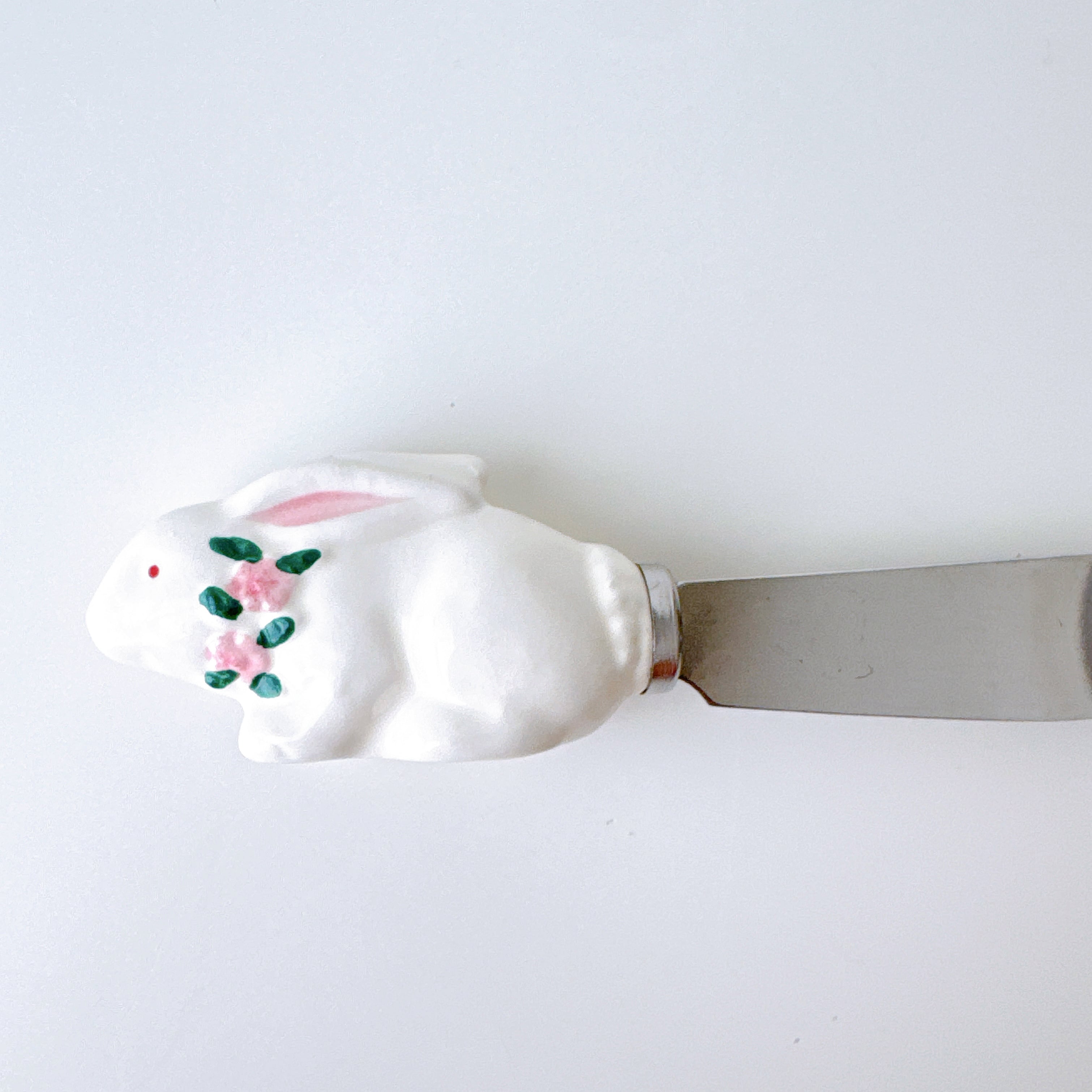 Alfred Knobler のうさぎのナイフは、つややかなセラミック製。小さな花を抱えた姿が愛らしく、イースターのテーブルコーディネートに合わせても可愛らしいアクセントに◎