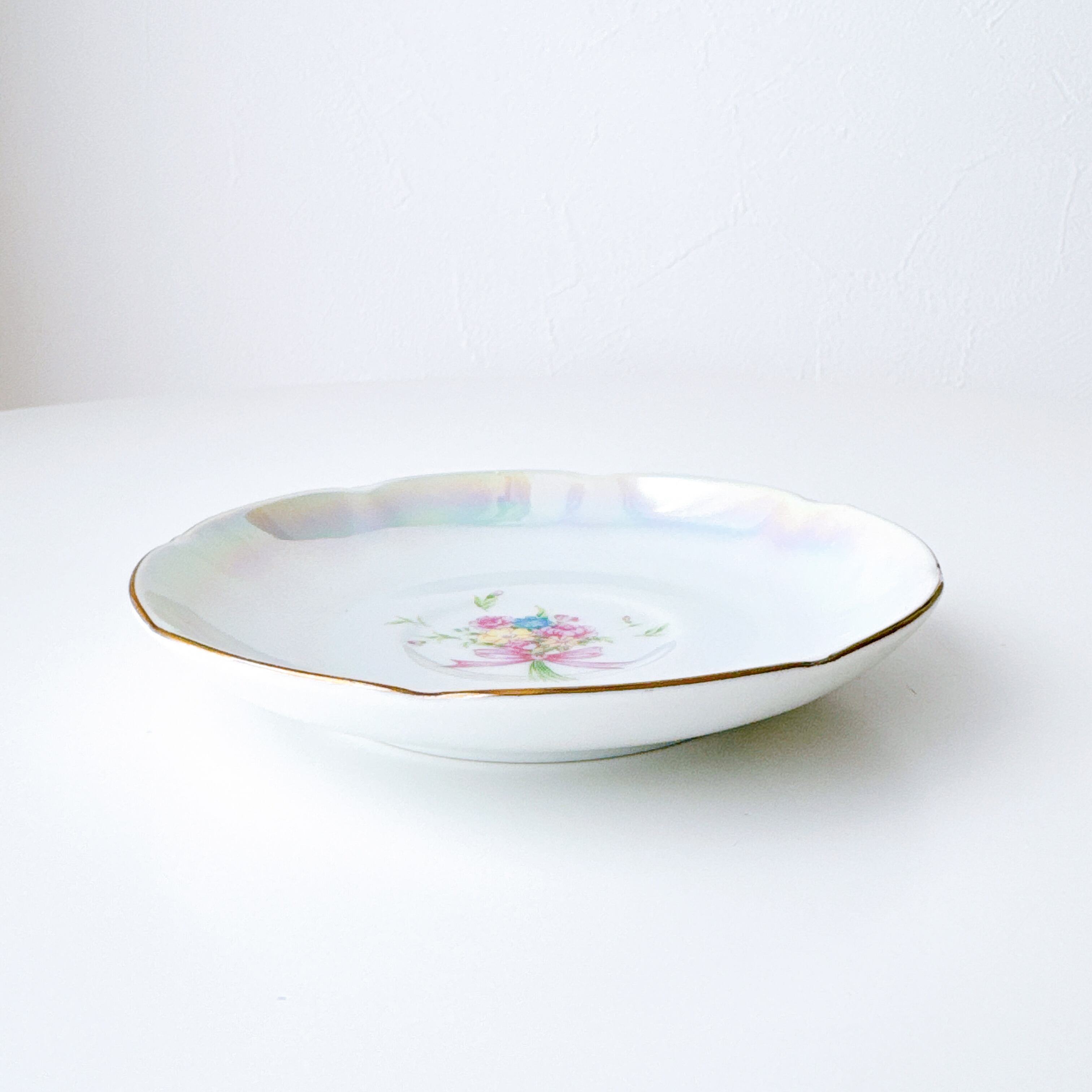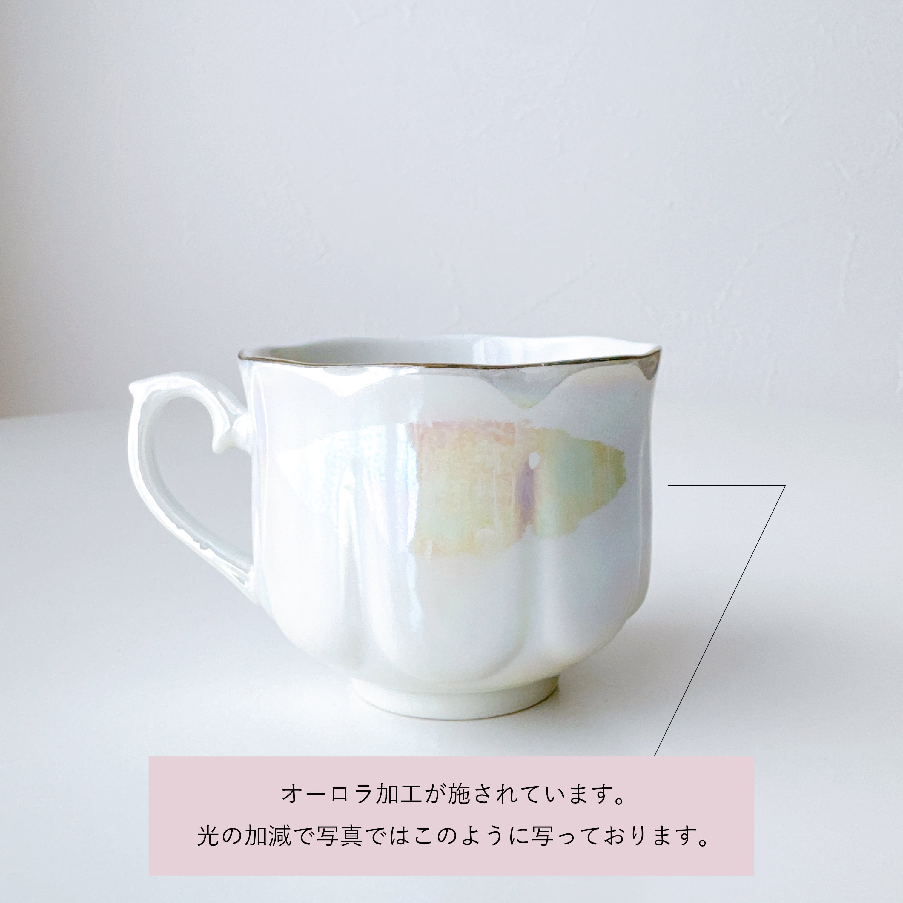 こちらは、オーロラのような虹色の光沢をまとった「ラスタ―(ラスター)」仕上げのカップ&ソーサーです。ラスタ―とは、金属の微粒子を焼き付けることで生まれる独特の光沢加工。