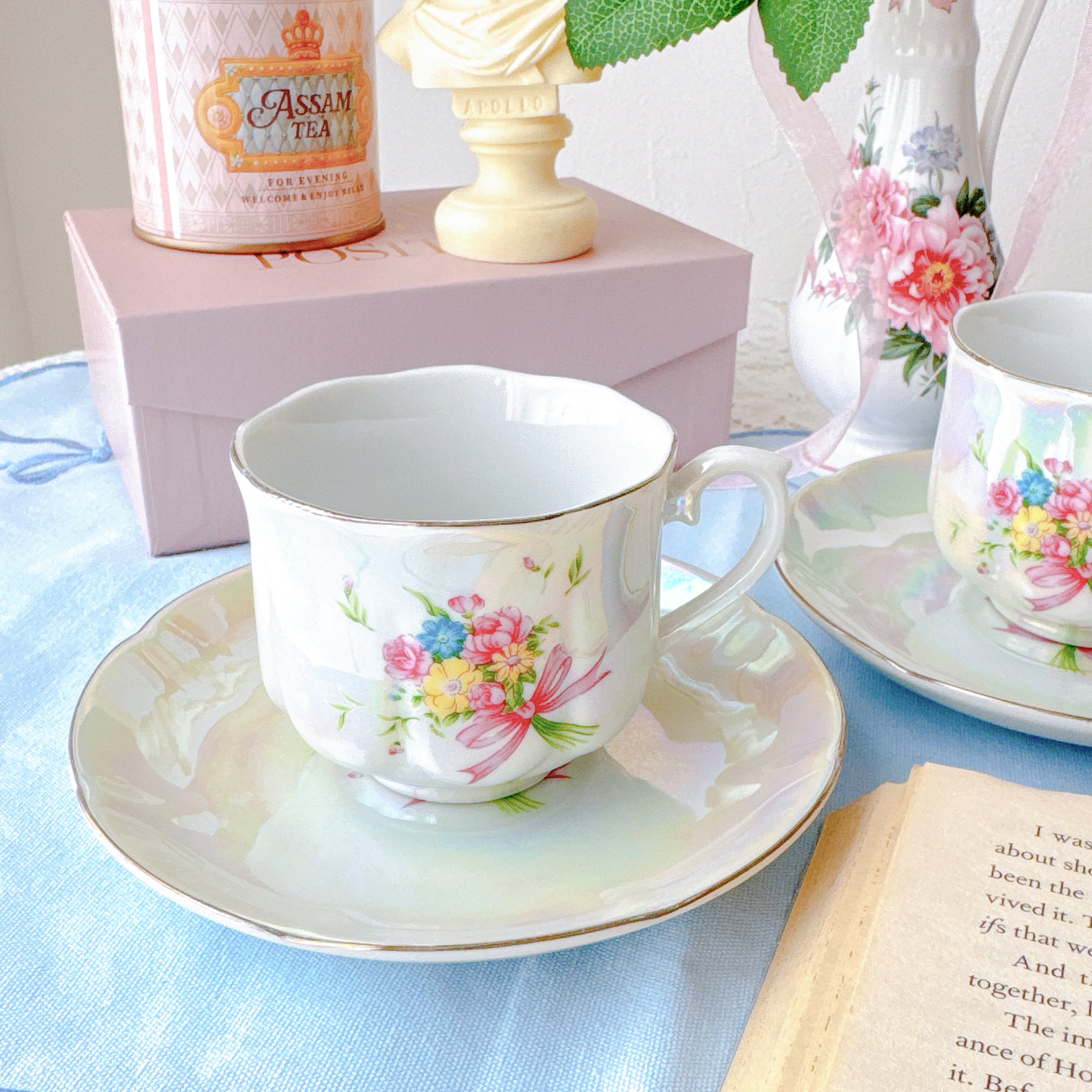 カップには、小さな花束を思わせる可憐なモチーフ。ピンクやブルー、イエローのやさしい色彩がふんわりと広がり、どこか愛らしく、軽やかな印象に仕上げられています。