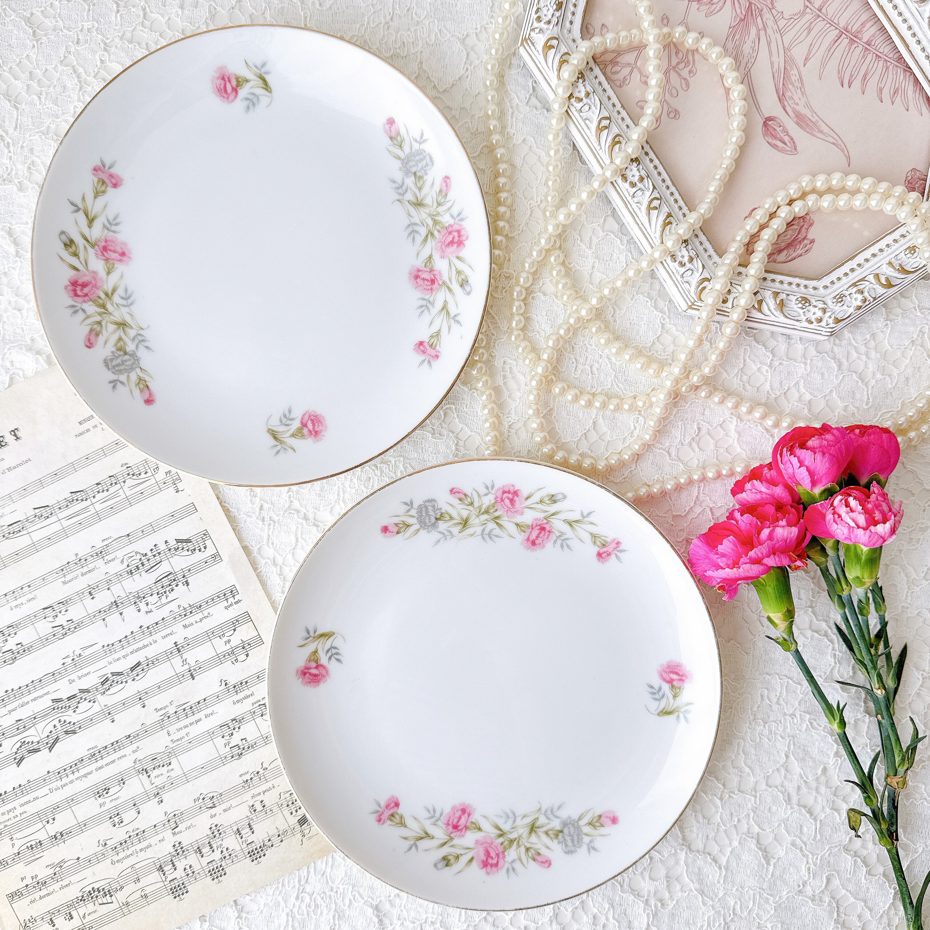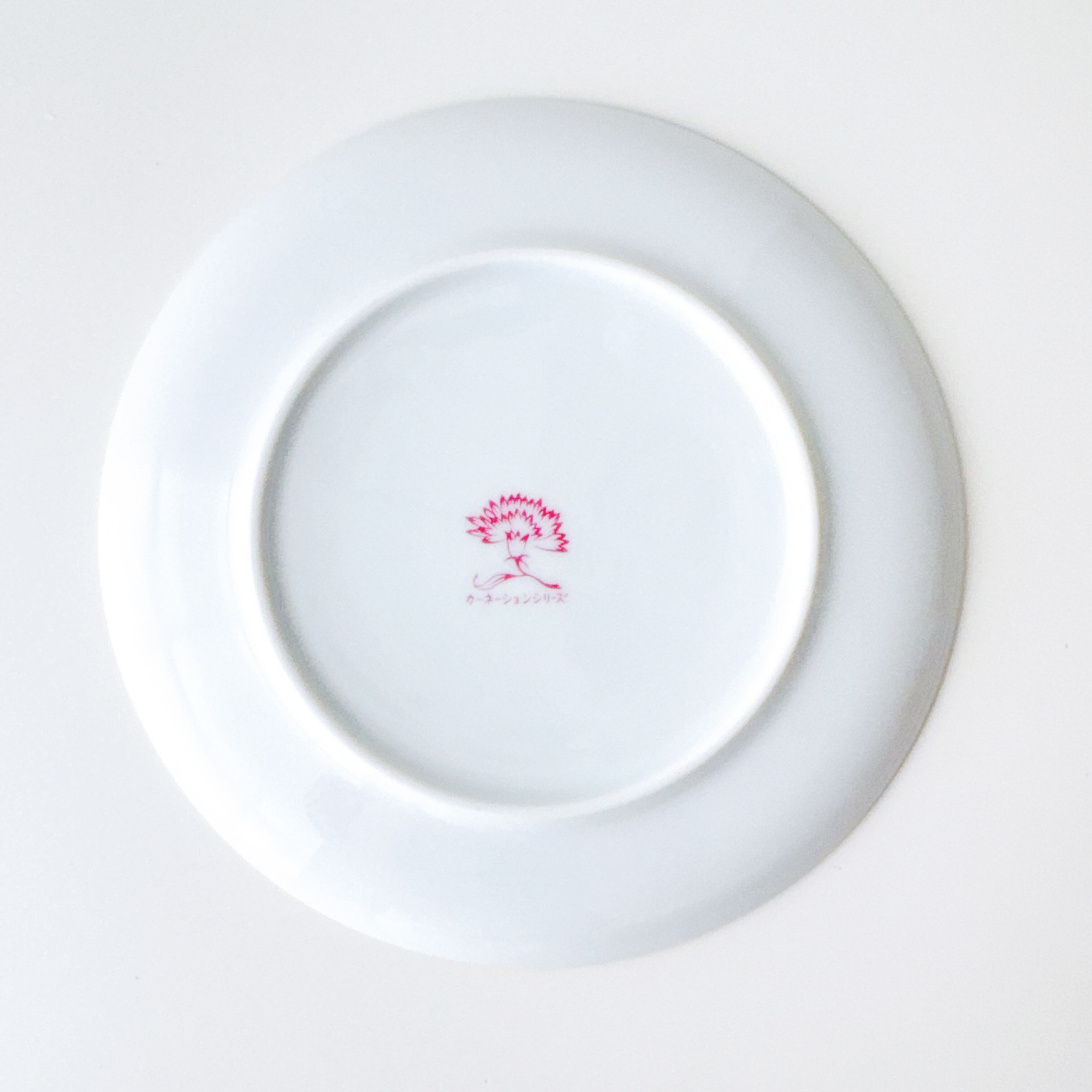 控えめな配置と繊細なタッチが、甘すぎない上品な可愛らしさを演出。縁に施された細いゴールドラインが、全体にさりげない華やぎを添えています。