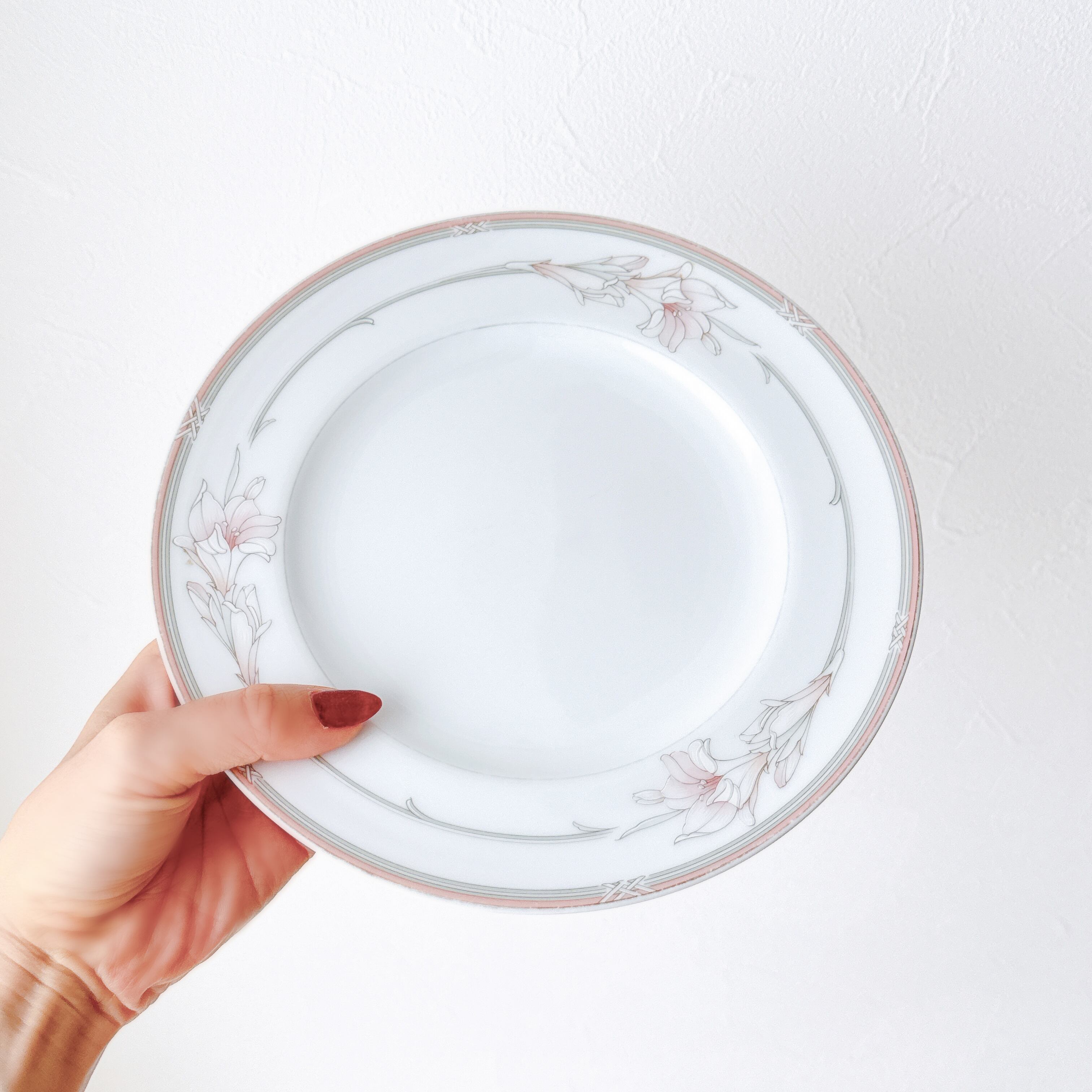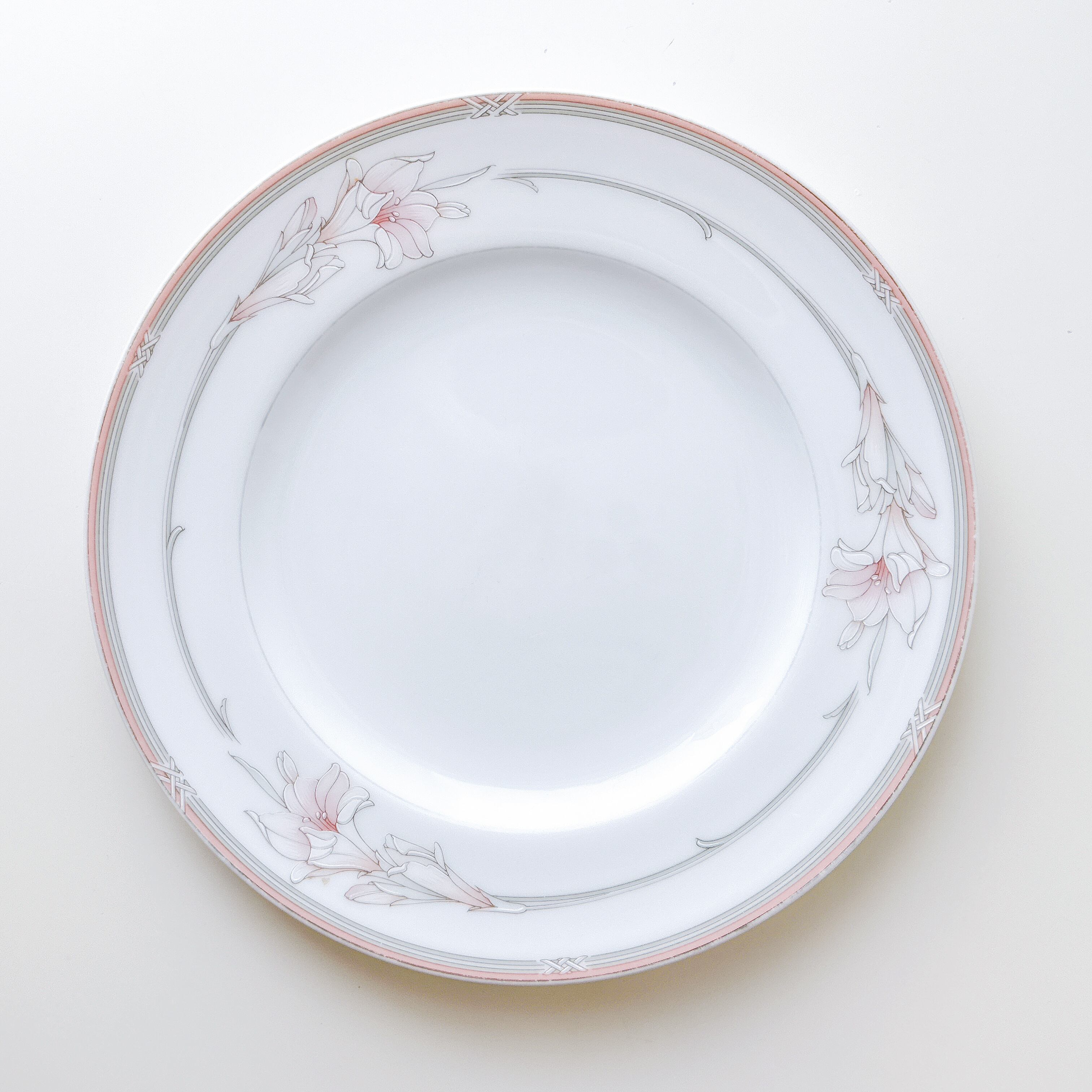 ユリやフリージアを思わせる、すっと伸びる花姿。淡いピンクとグレーのやさしい色彩で表現され、静かで上品な美しさを感じさせてくれます。装飾は控えめながら、リムにあしらわれたピンクのラインや細やかな装飾が、全体にやわらかな華やぎを添えています。余白を活かしたデザインが、どこか洗練された印象を生み出しているのも魅力のひとつ。