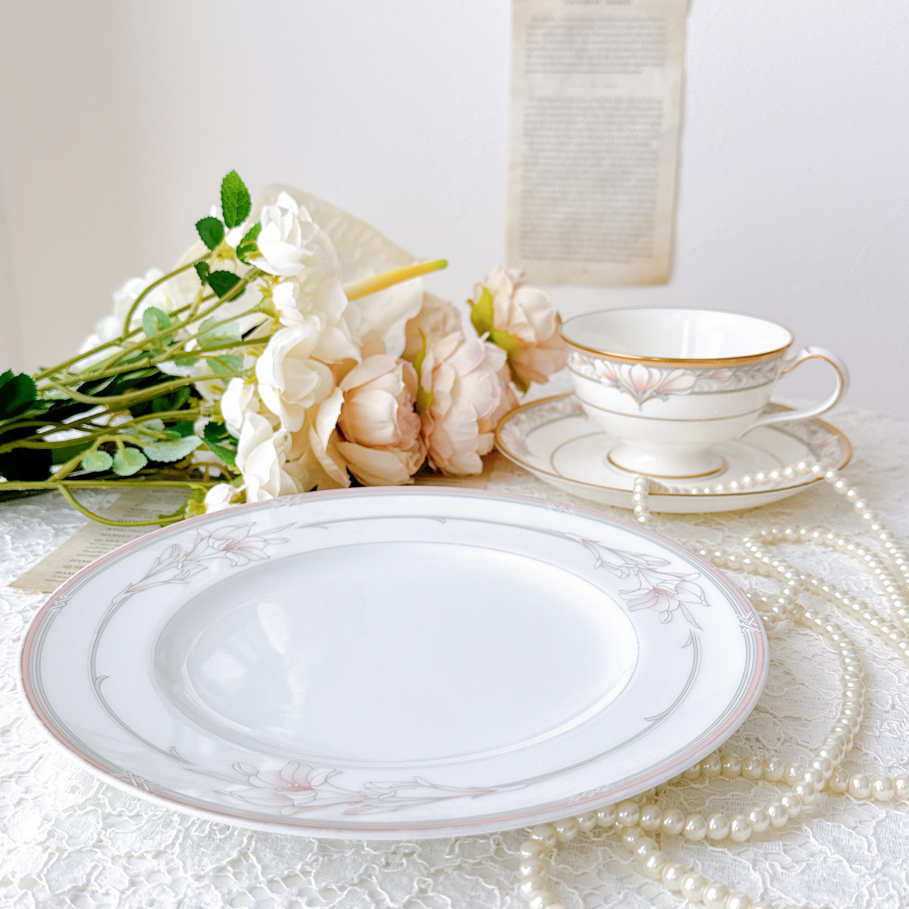 やわらかな白磁に、繊細な線で描かれた花々。1980年代頃に作られた、Noritake の「JENNA(ジェナ)」シリーズのプレートです。