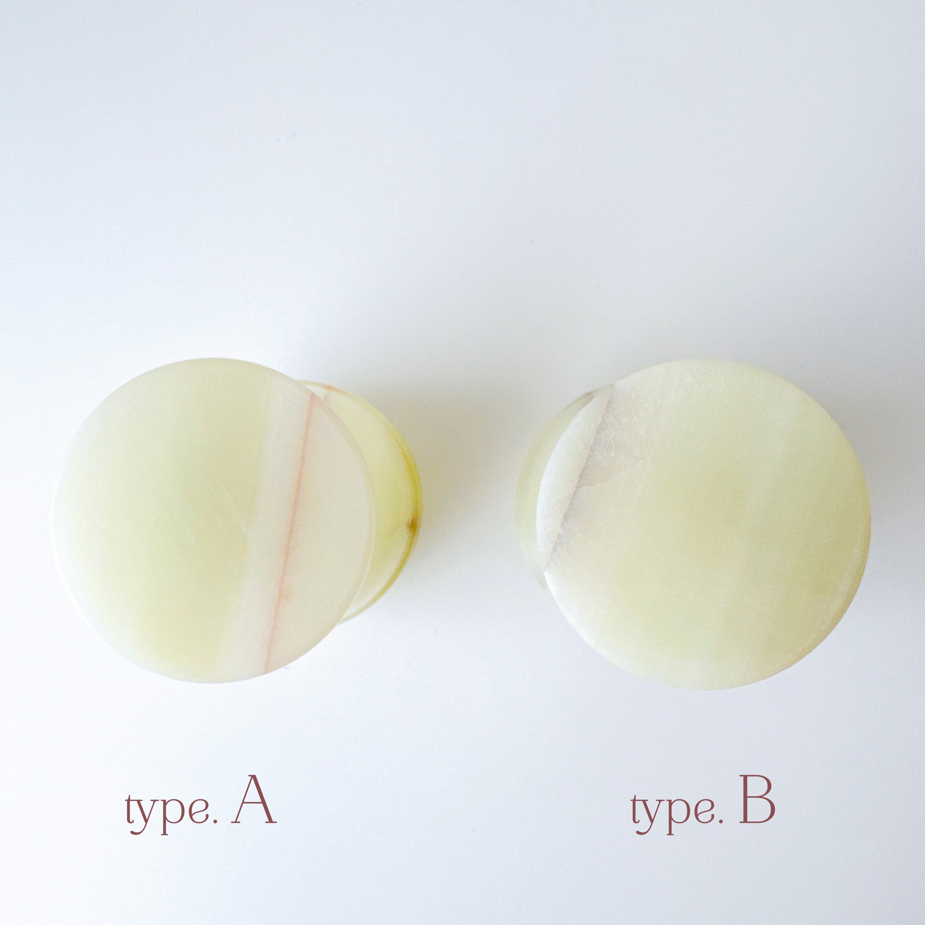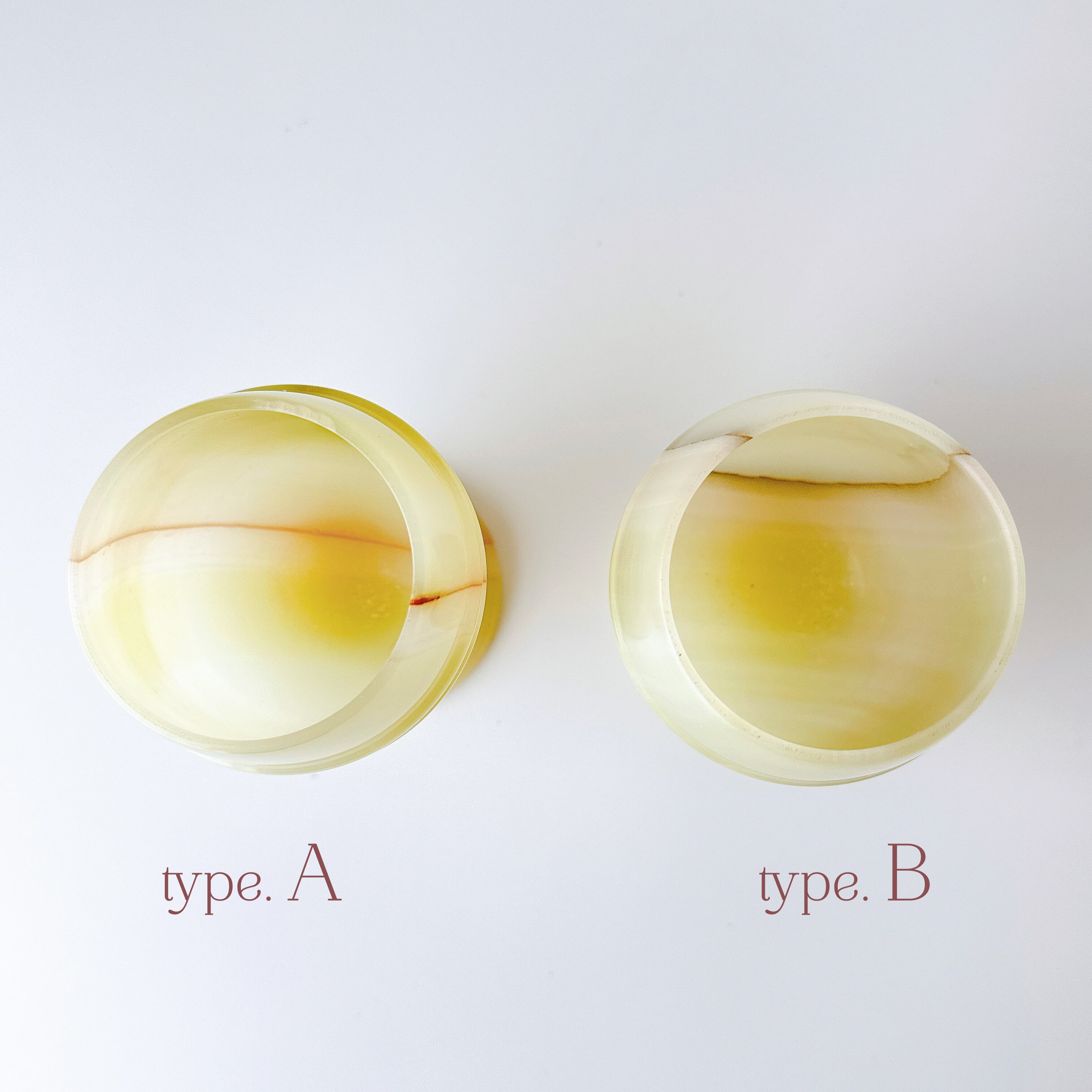 天然石ならではの透明感と層状の模様が、まるで静かに流れる時間を閉じ込めたかのような佇まいです。淡いミルキーグリーンを基調に、ほんのりと差し込むイエローやクリームのニュアンス。光を受けるたびにやさしく揺らぐ色合いは、ひとつとして同じもののない天然素材の魅力を感じさせてくれます。