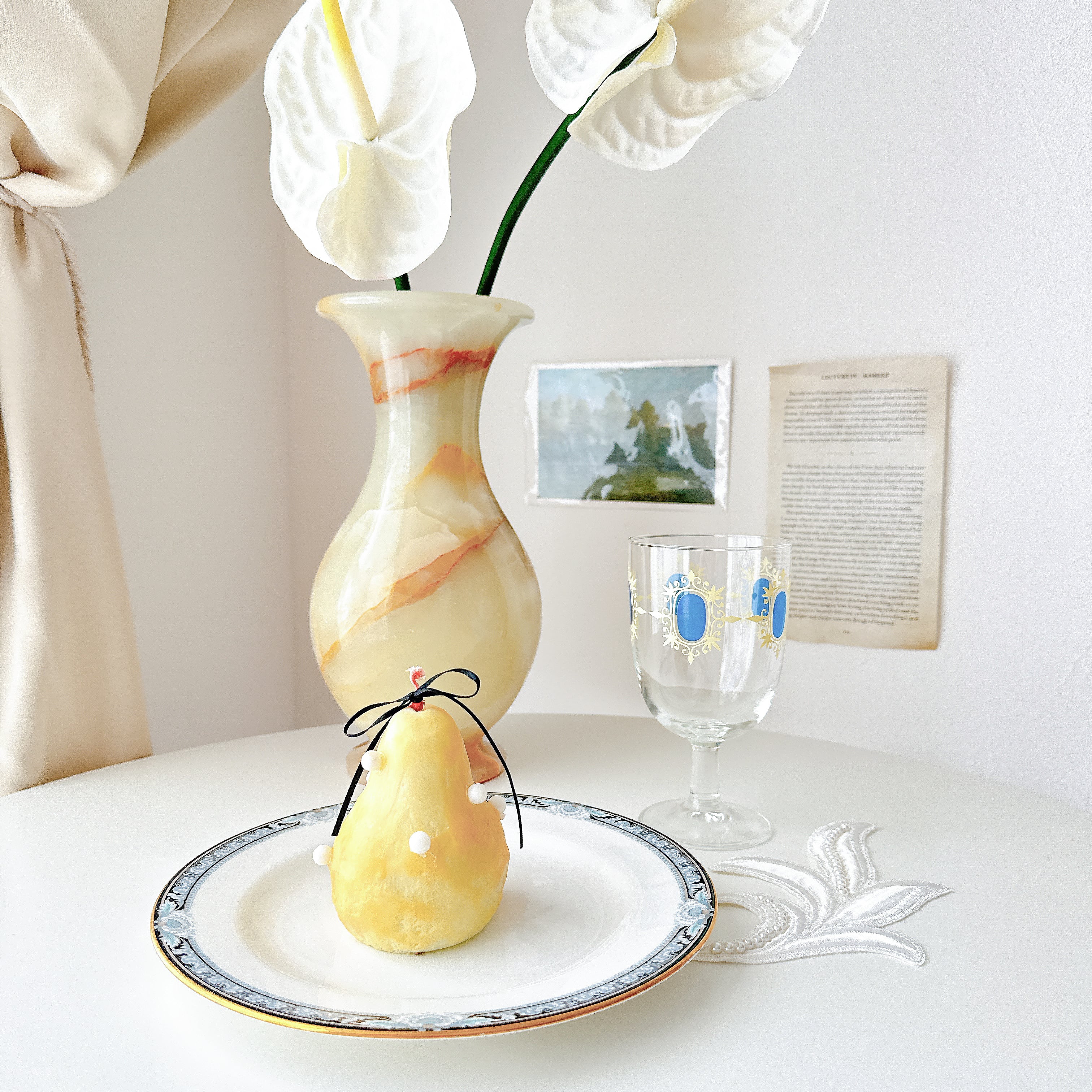 【ガラスに浮かぶ、ブルーとクリーム色のレトロな装飾】