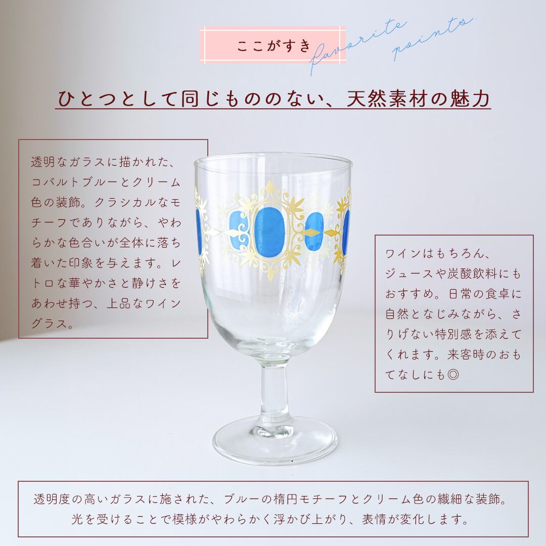 透き通るガラスの中に、やわらかく浮かび上がるブルーとクリーム色の装飾。まるで静かな午後の光を閉じ込めたかのような、上品で穏やかな印象のワイングラスです。