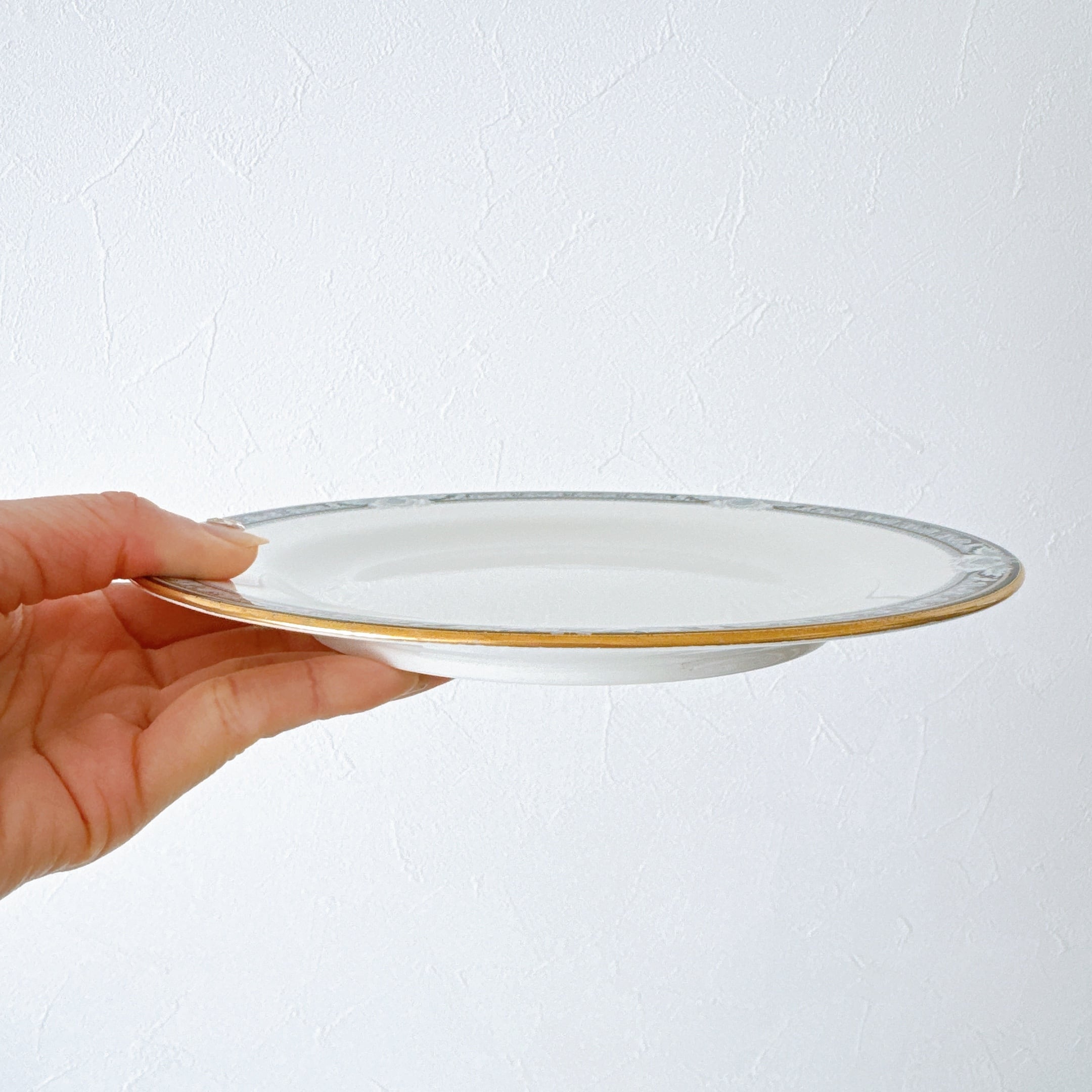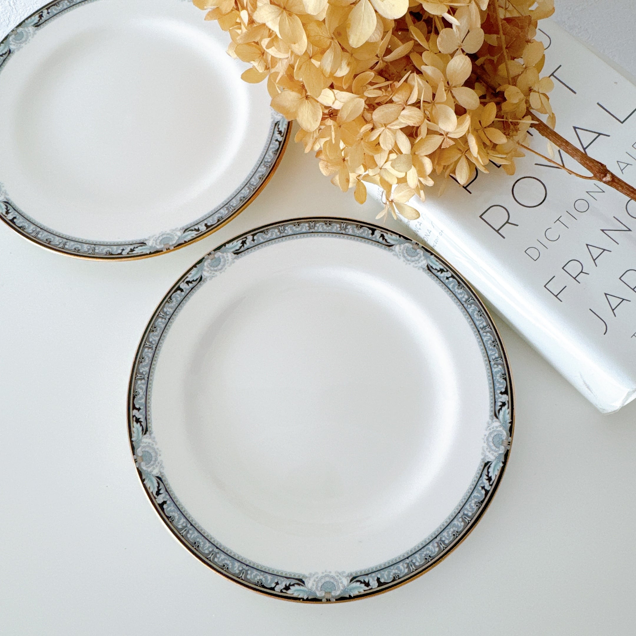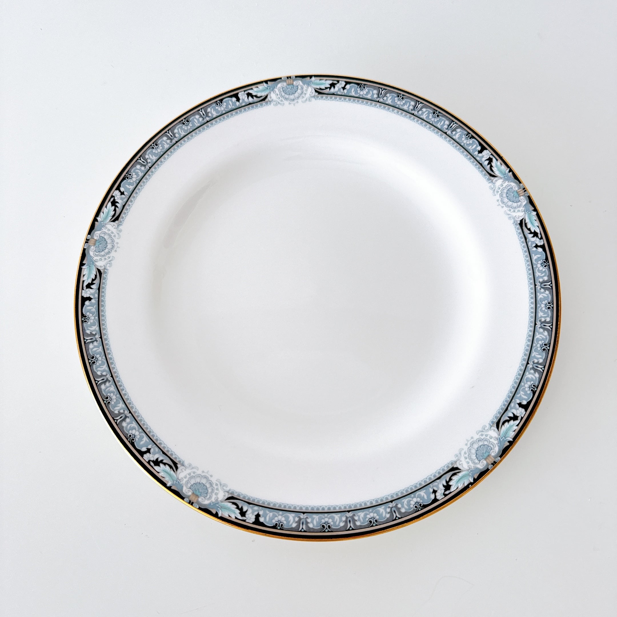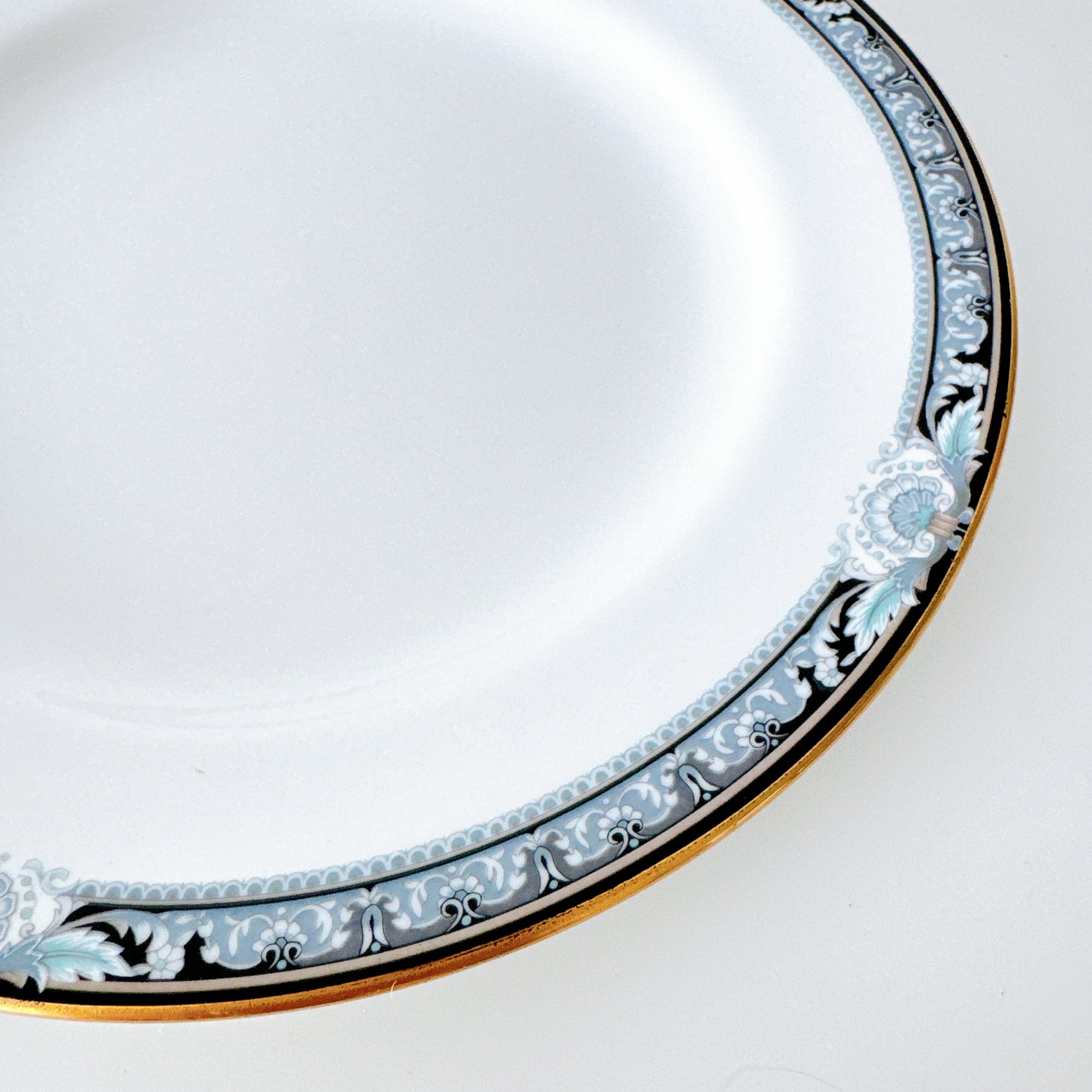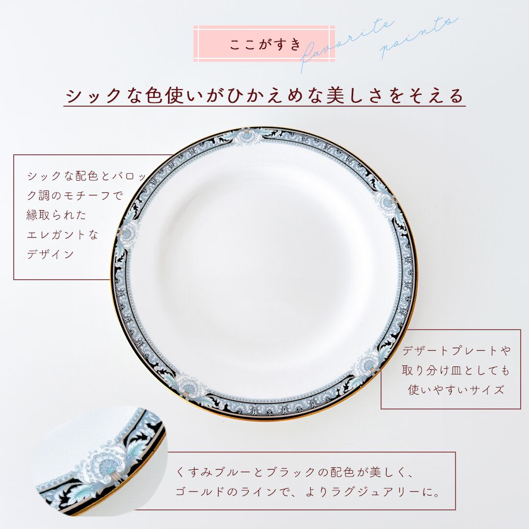 淡いブルーとブラックで描かれた、バロック調の縁取りがエレガントなプレート。