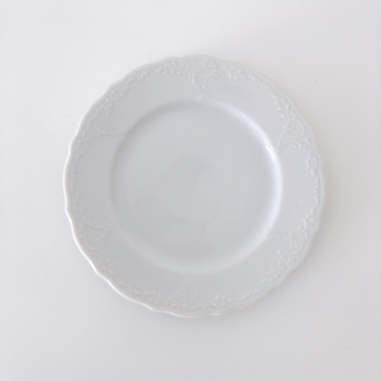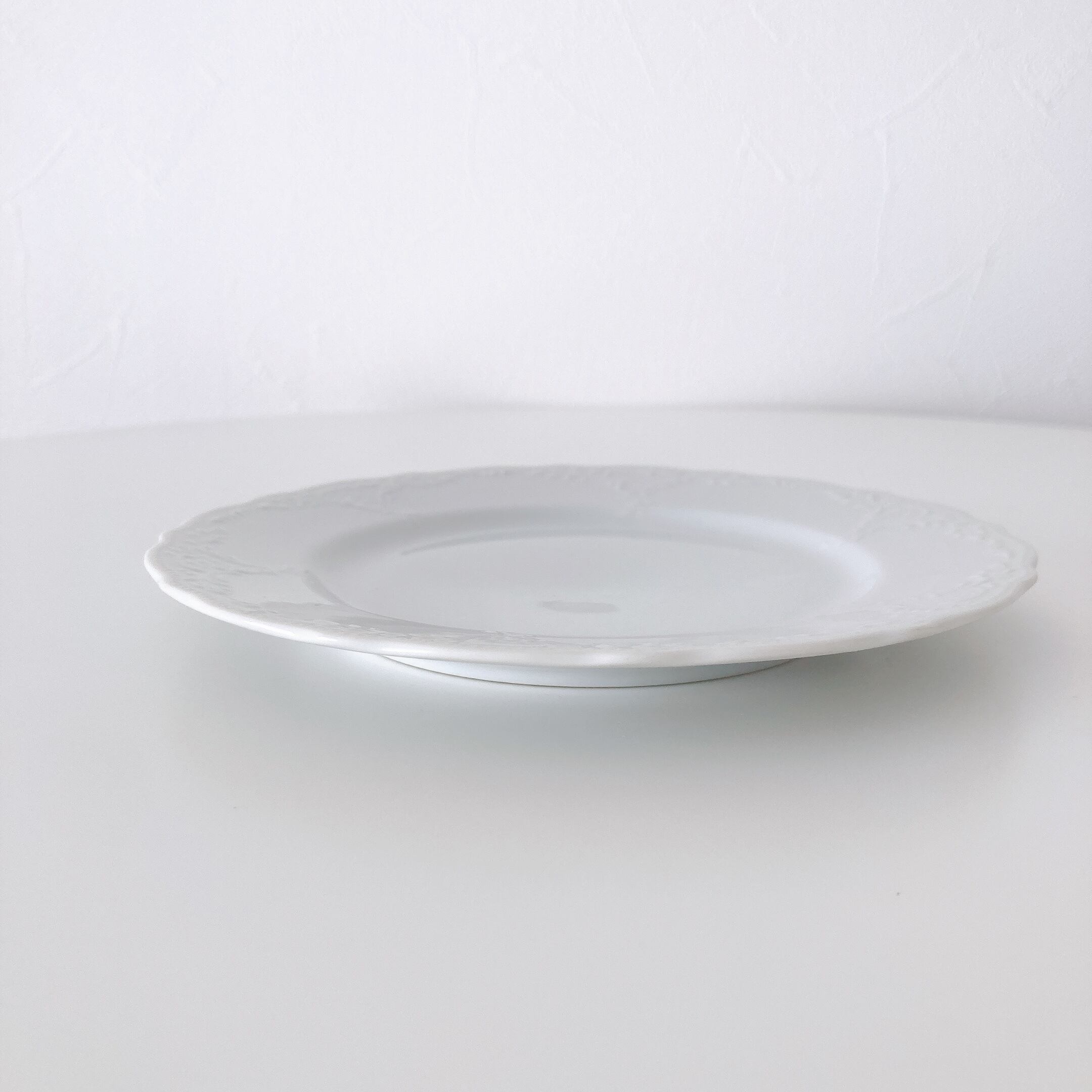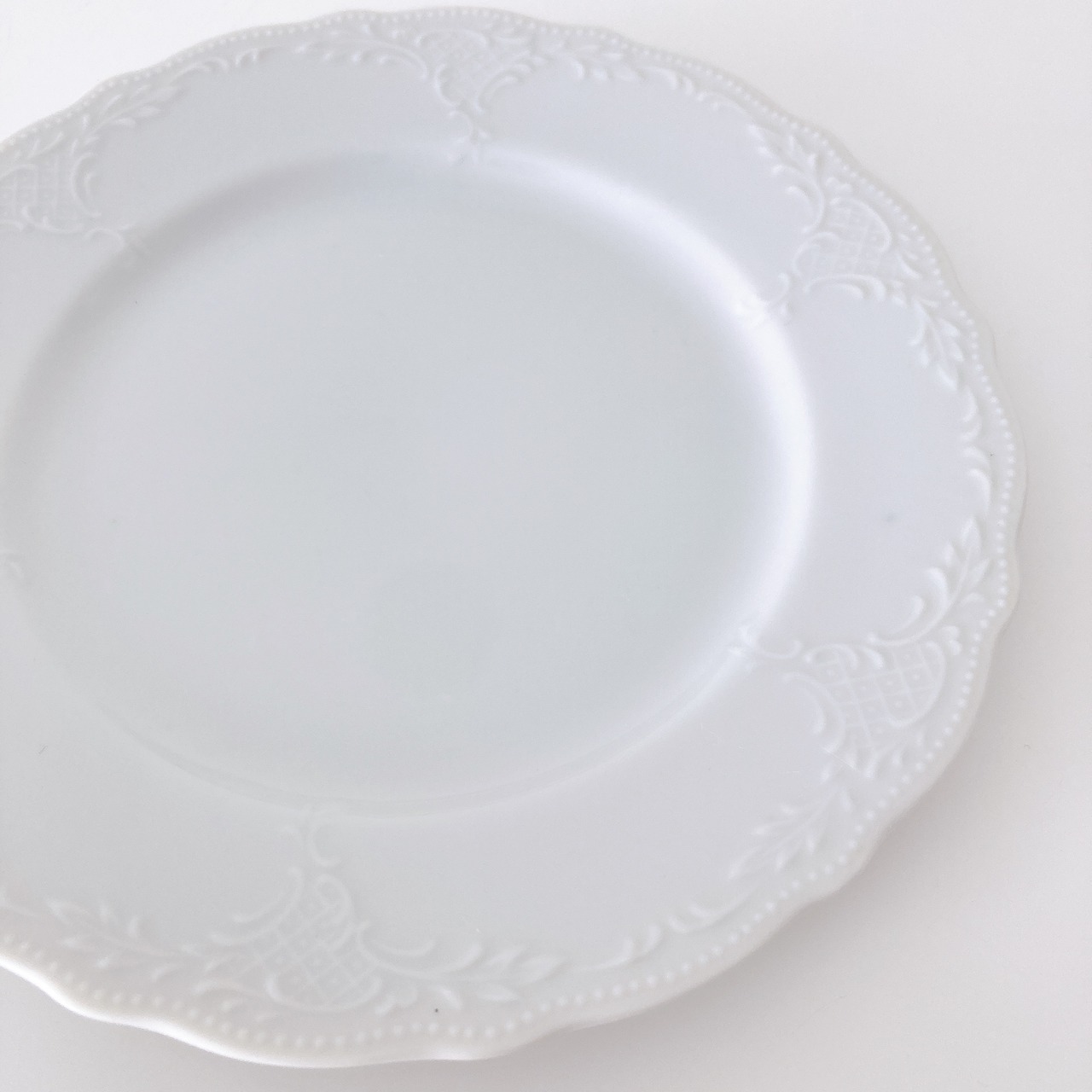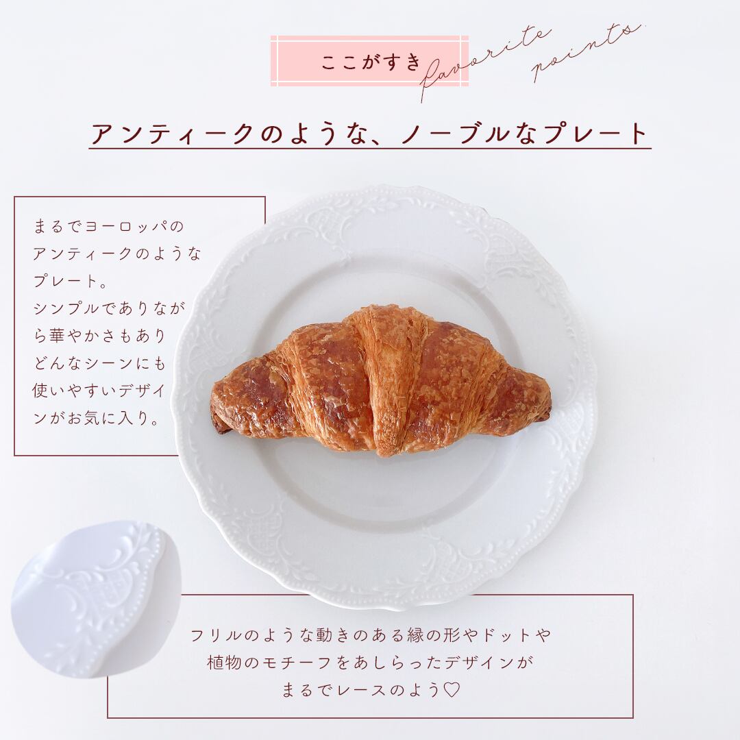 縁のフリルと彫刻のような縁飾りが可愛いデザートプレート。