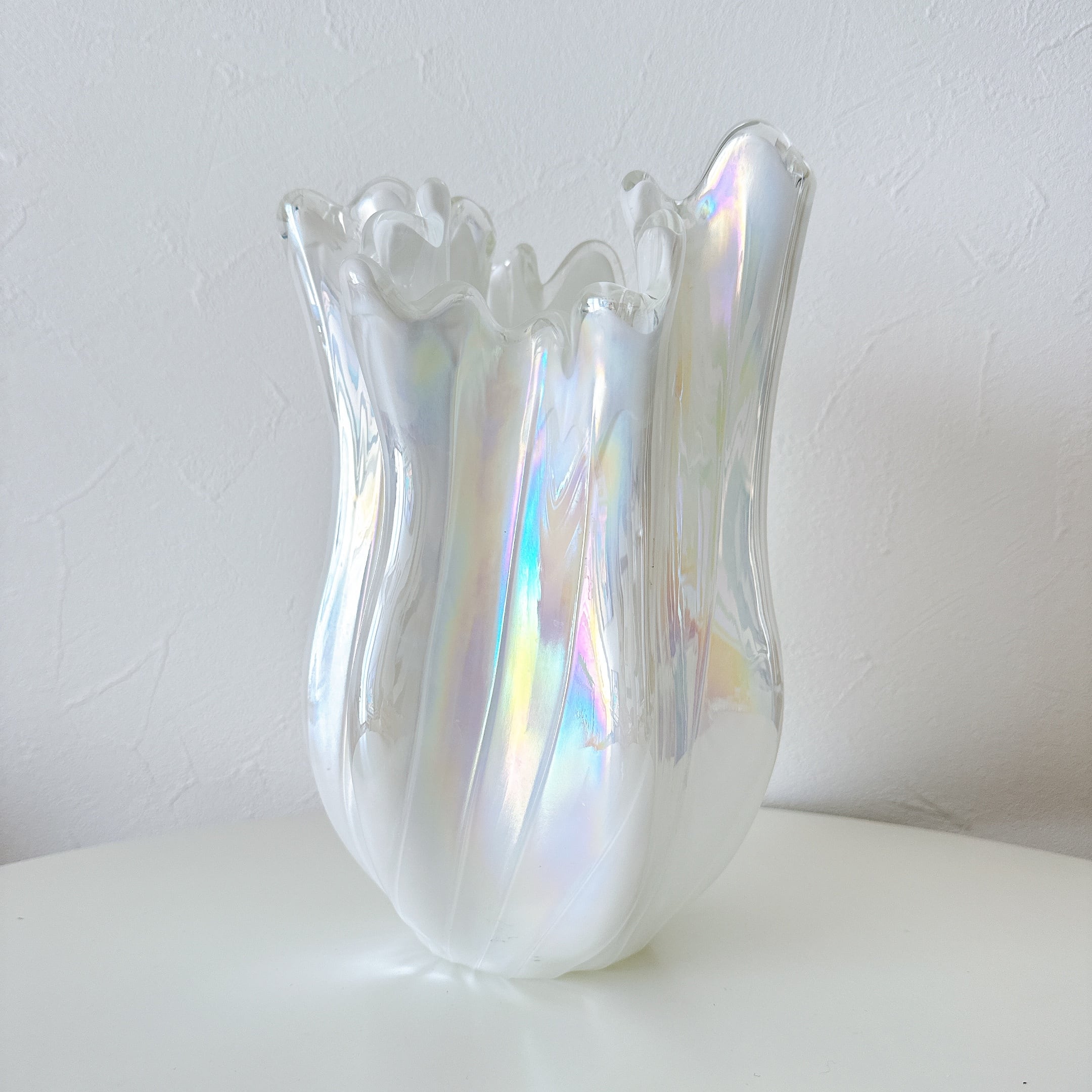 光の加減でオーロラのように七色に輝くフラワーベース。